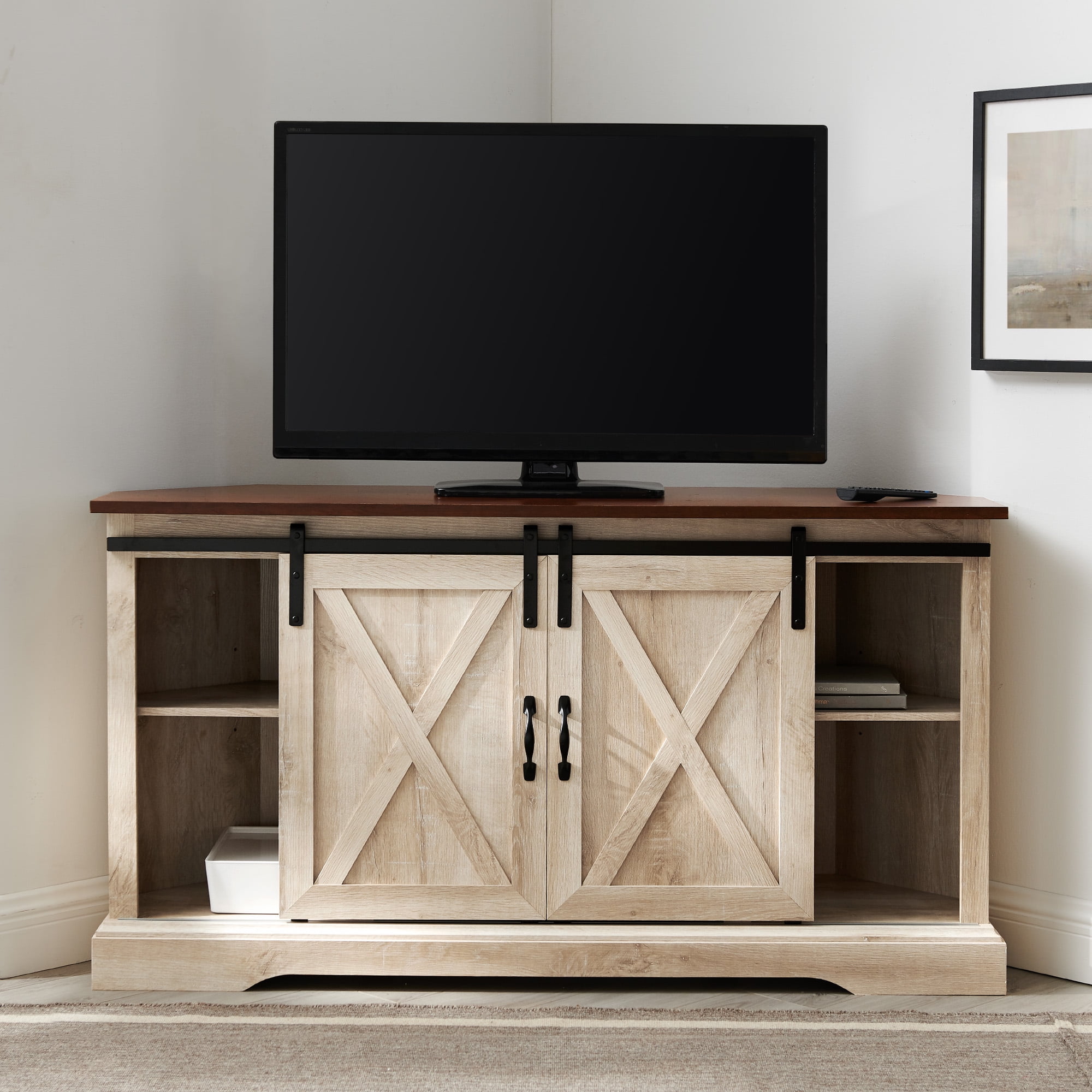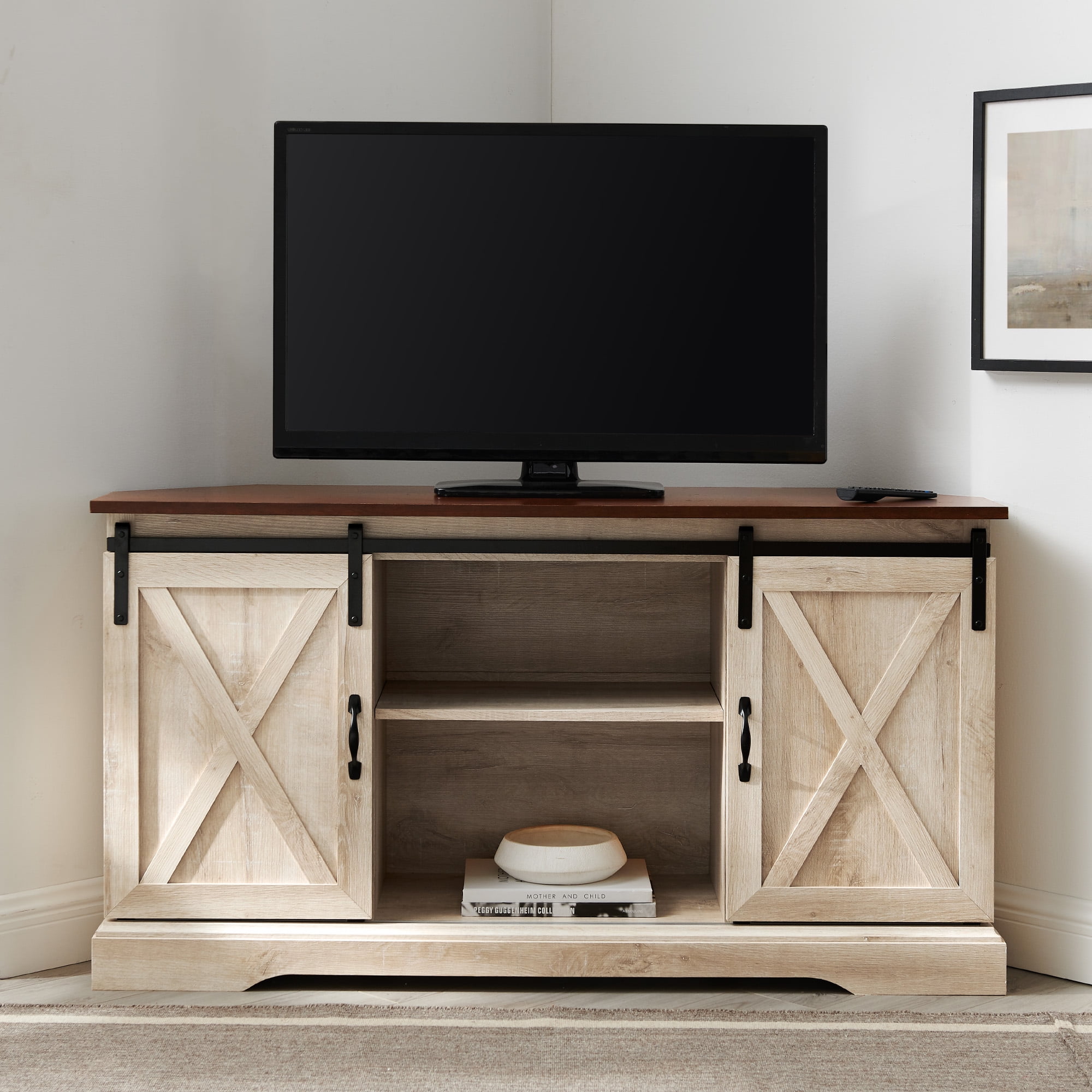 Walker Edison Modern Farmhouse Sliding Door Corner TV Stand, White Oak