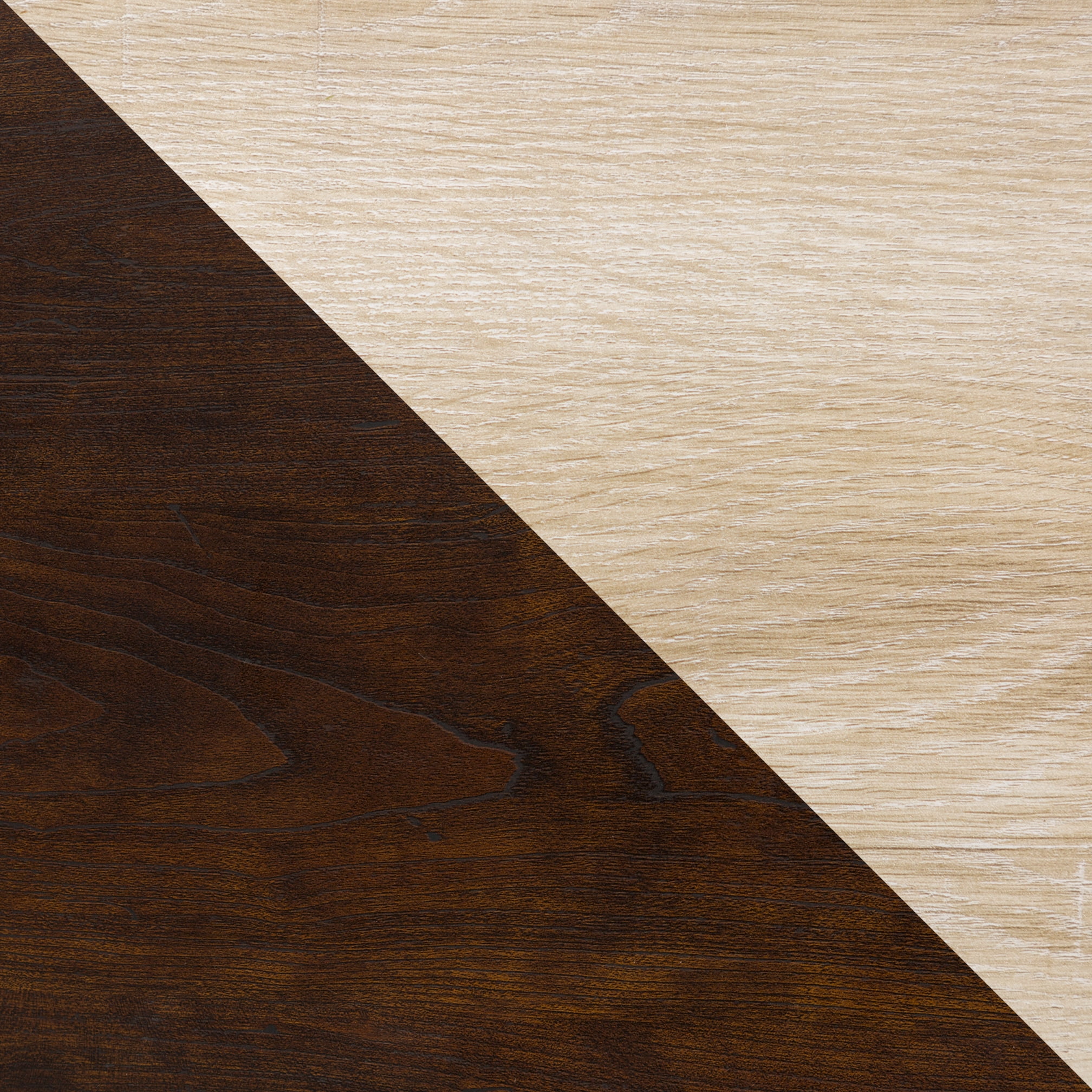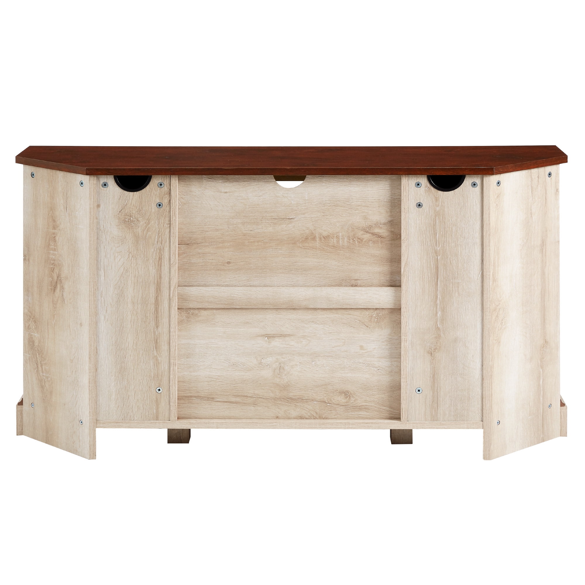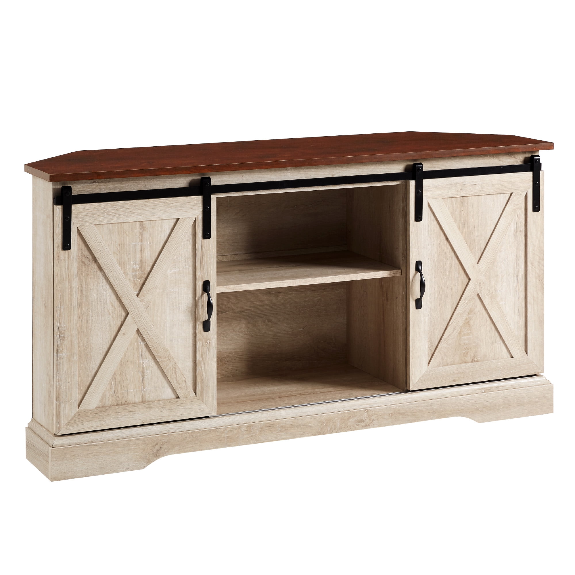 Rustic farmhouse style Traditional brown and white oak finishes 2 sliding barn doors for easy access to essentials Attractive exposed hardware 3 adjustable shelves for customizable organization Angled corners for small space homes Accommodates TVs up to 58 inches Cord management ports keep cables tidy Made from warp-resistant MDF wood, durable laminate, and powder-coated steel Ships ready-to-assemble with step-by-step instructions Assembled Dimensions: 28” H x 52” L x 15.5” W Packaged Dimensions: 8” H x 57” L x 19” W
