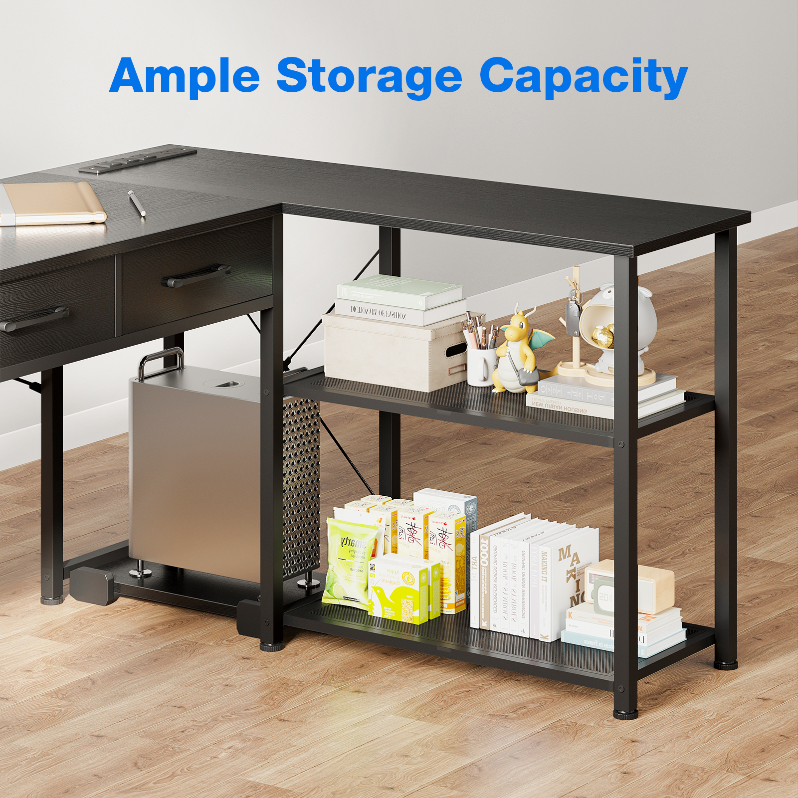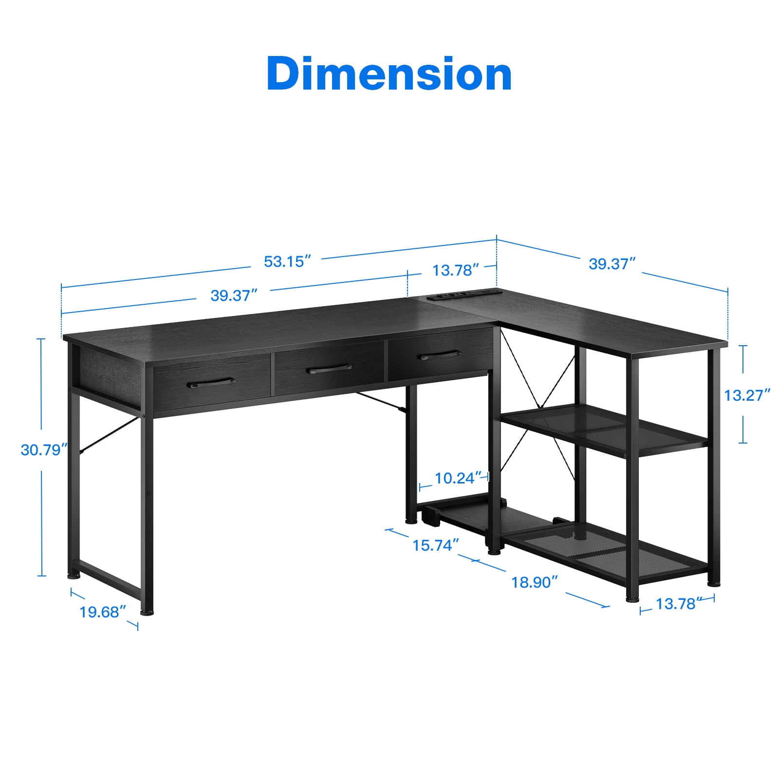 Reversible L Shaped Gaming / Home Office Desk for Coner Work Practical Functions Recessed Power Strip 2-Tier Reversible Open Shelves for Storage 3 Fabric Drawers keep your workspace organized Adjustable Leg Pad Keep the Desk Balance Item Information Product Dimensions: 53.15″D x 39.37″W x 30.79″H Color: Black Style: Modern Special Feature: Built-in monitor Stand/ Built-in USB Ports/ Outlets Room Type: Office, Living Room, Dormitory, Bedroom, Classroom, Study Room Recommended Uses For Product: Working, Writing, Gaming Age Group: Adult