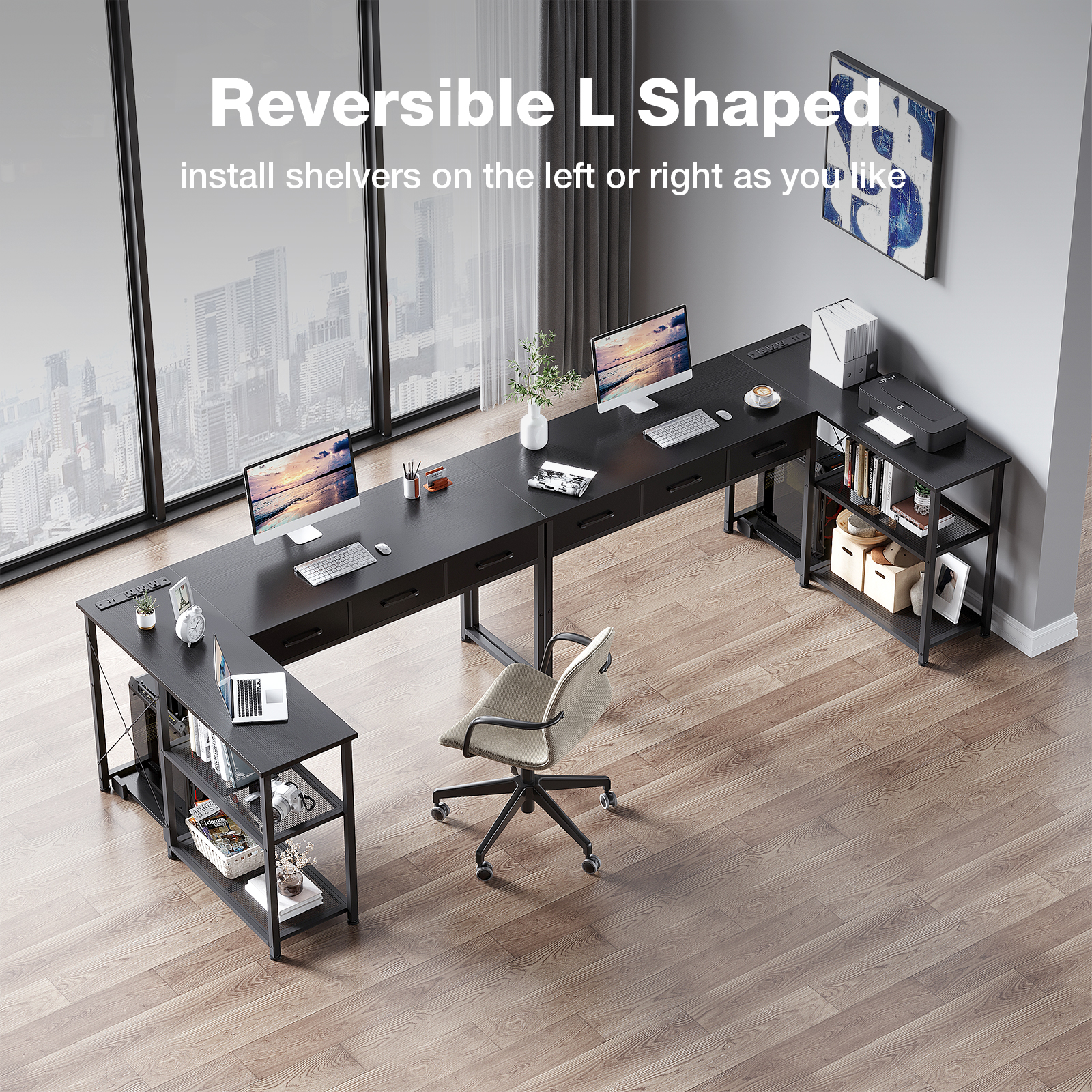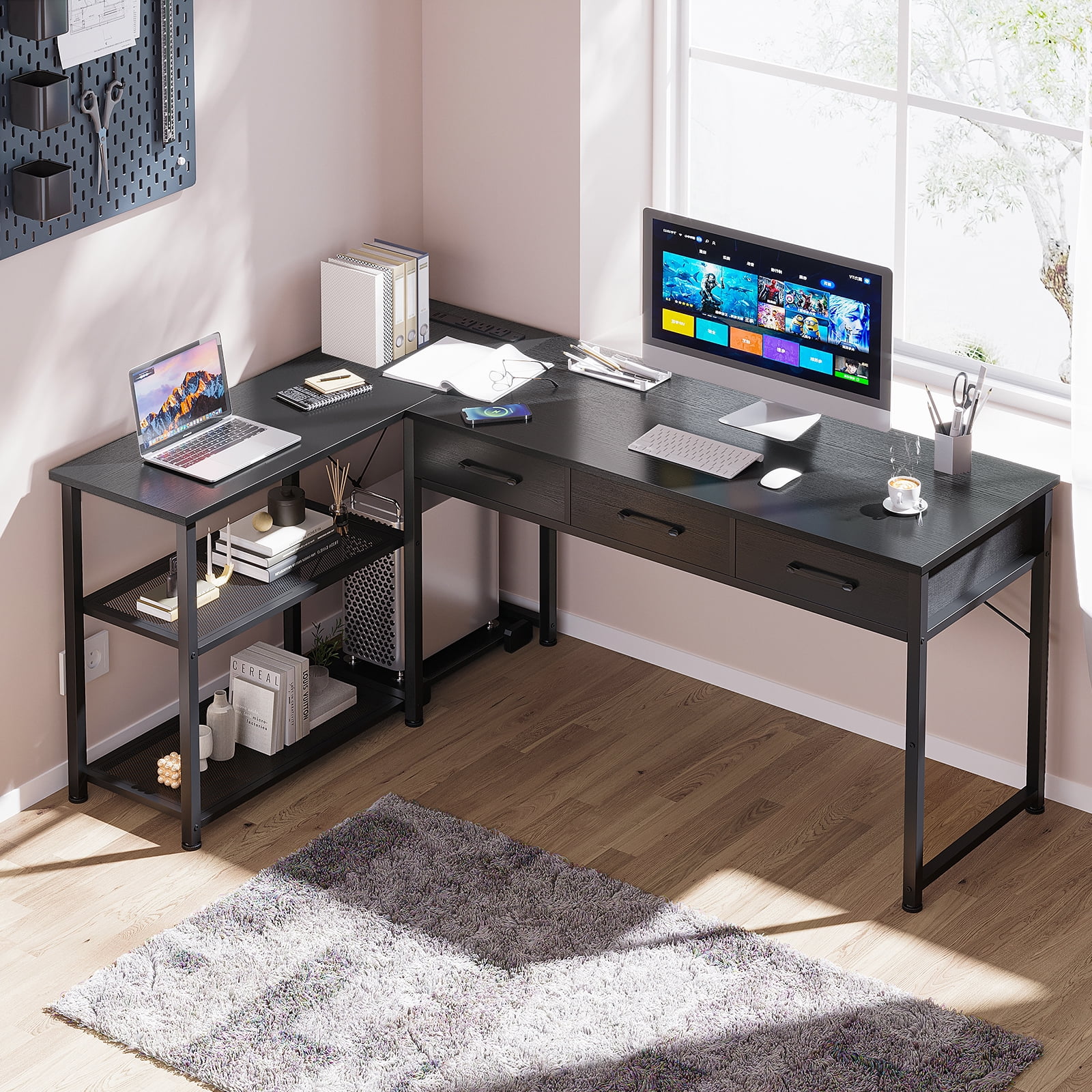 【Computer Desk with Drawers】 This desk can be used as a home office desk for working from home. 3 fabric drawers help store files, stationery, and other office supplies. It has ample storage space for you to store office supplies and documents. Super practical design! 【Desk with Power Outlets】 Equipped with 3 Standard Plug Outlets & 2 USB Ports, this computer desk with shelves can easily charge your phones, gaming gear, and other office devices, avoiding cluttered wires. 【REVERSIBLE CORNER DESK】 With reversible design, this home office desk can be installed in 2 directions according to your needs, good choice for your bedroom, study, and office. The L-shaped design suits corner space perfectly. 【L Desk with Spacious Workspace】 This large l desk provides a larger surface, and there is plenty of space for multiple monitors setup. Features 2-tier shelves on the side, helping you organize your stuff, this desk is perfect for writing, working, gaming, and remote learning. Suitable for adults.