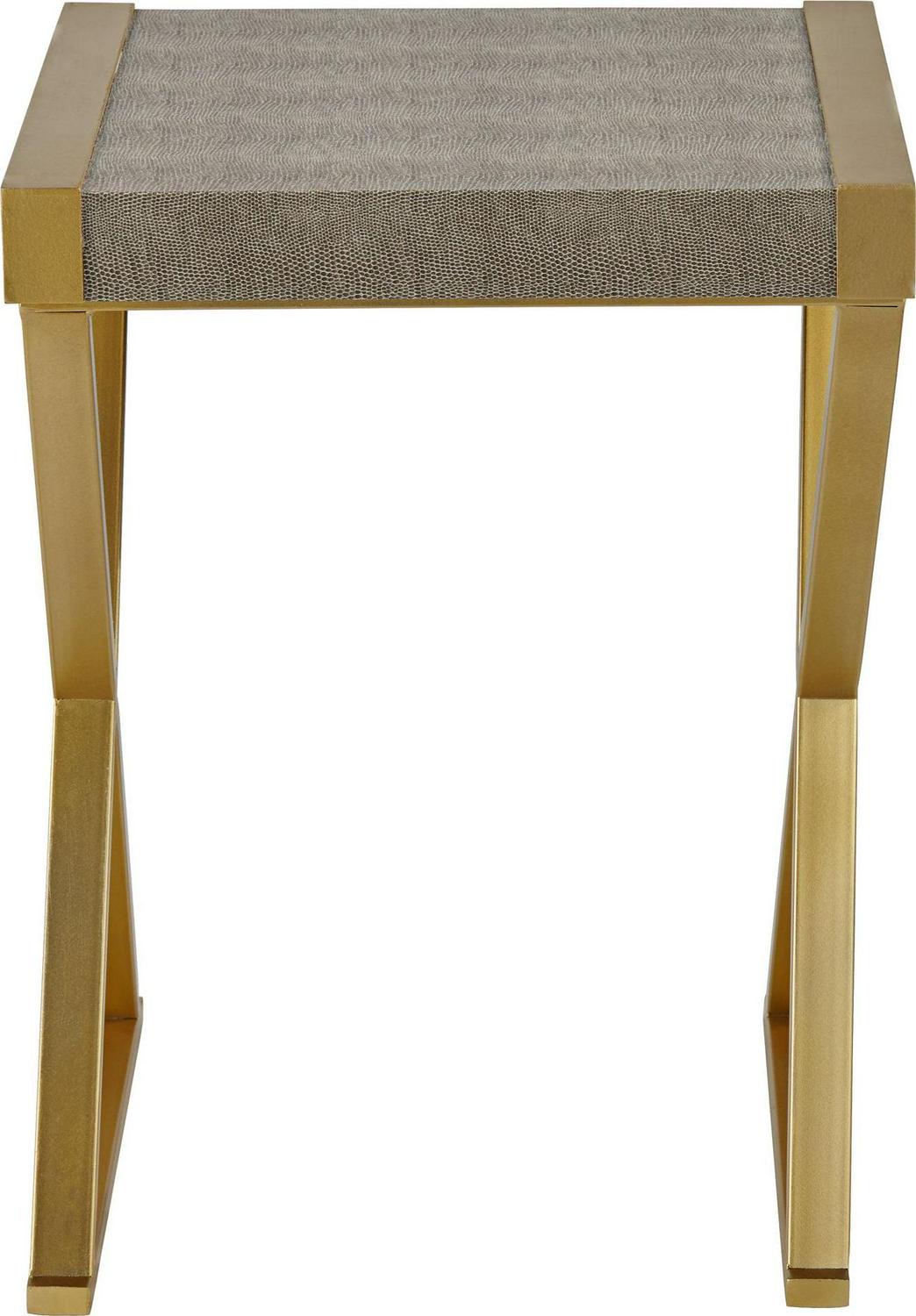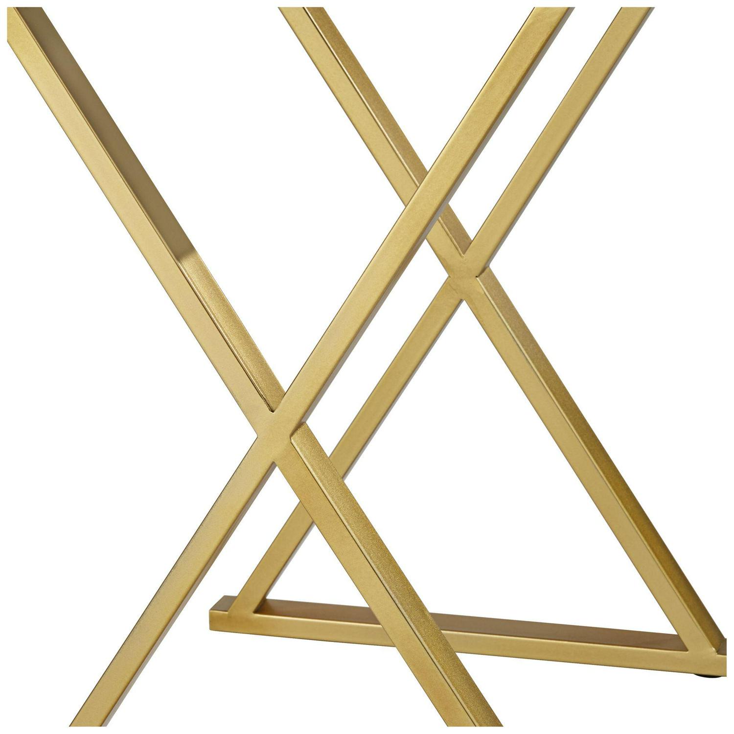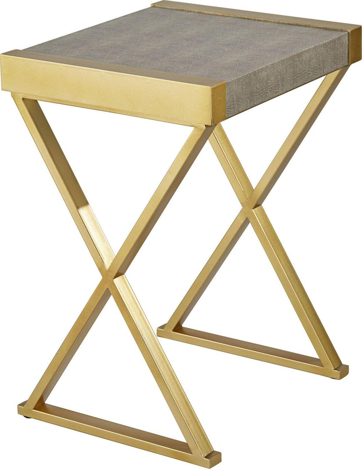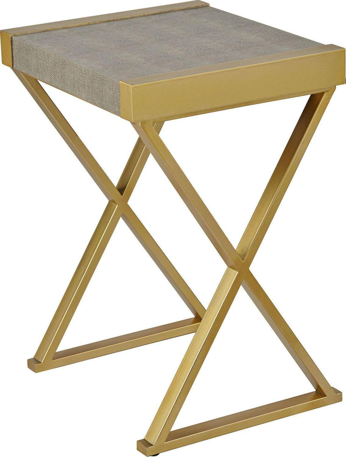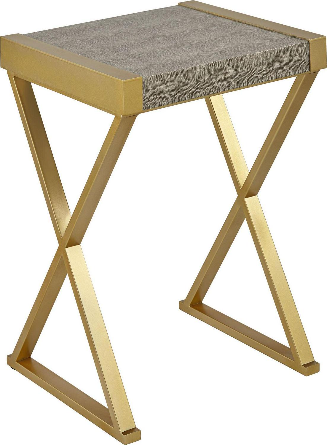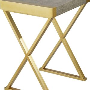 Mixing gray and gold to exquisite effect, this contemporary accent table is perfect flanking an armchair or in a compact entryway. From the 55 Downing Street brand, it tucks in perfectly in any living area and draws attention with a bold X-frame leg design. Its thick tabletop features wood construction with a textured gray finish, while its gold finish metal base and side accents bring instant warmth.