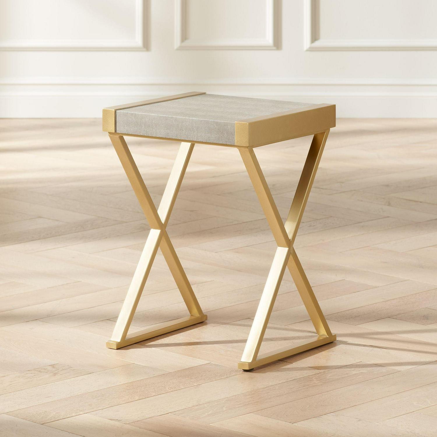 55 Downing Street Sands Point Modern Metal Rectangular Accent Table 16 x 14 Gold Gray Wood Tabletop X-Frame Legs for Living Room Bedroom Bedside