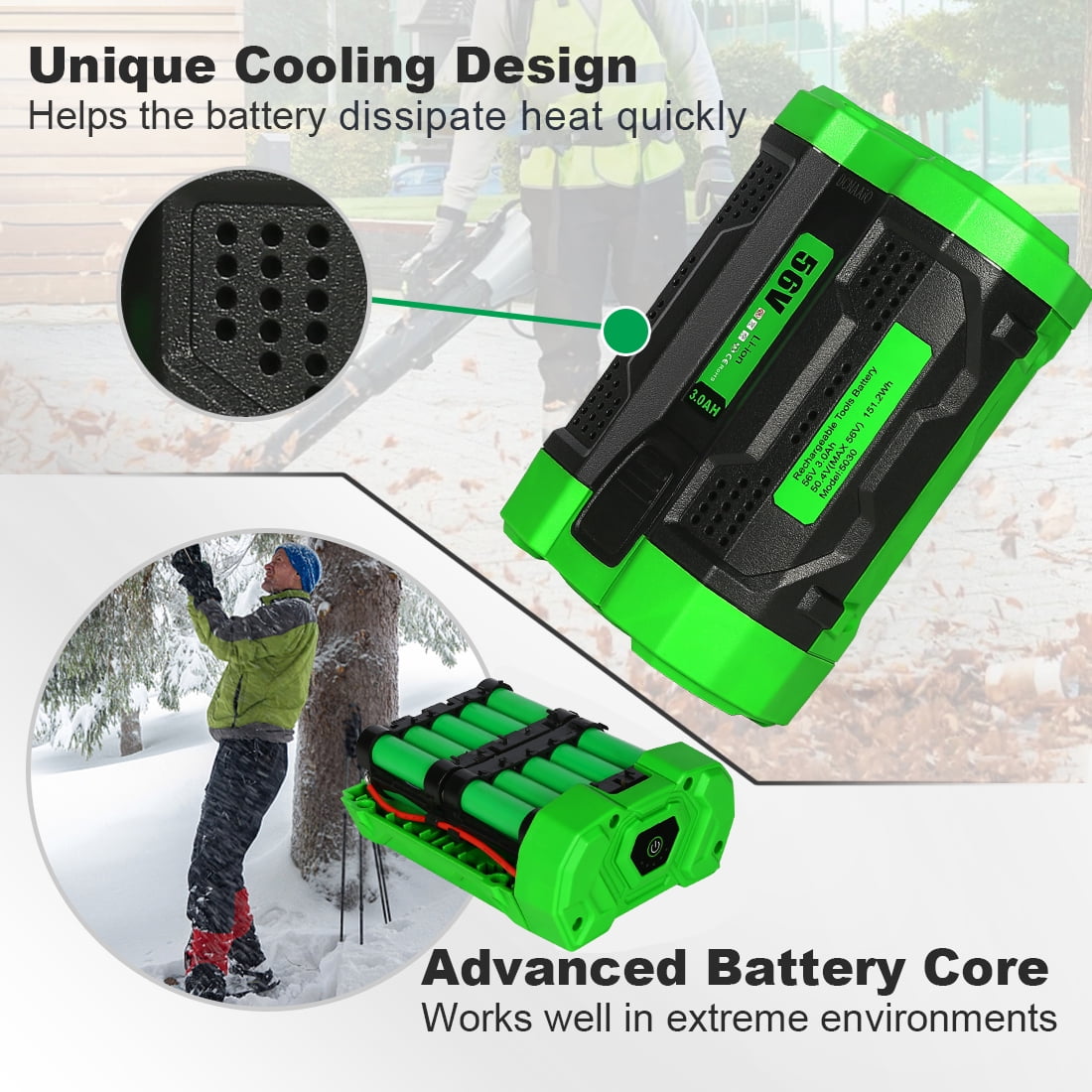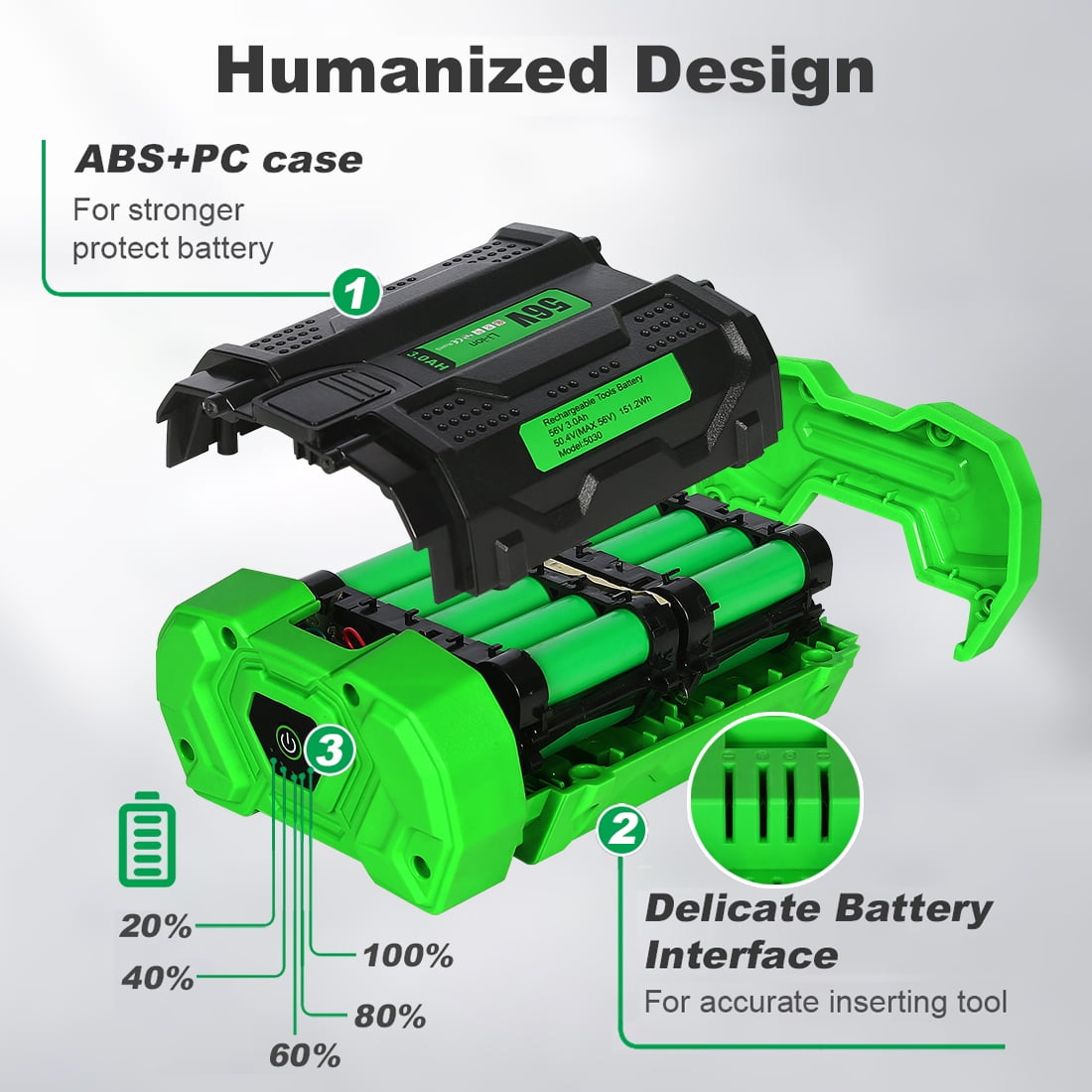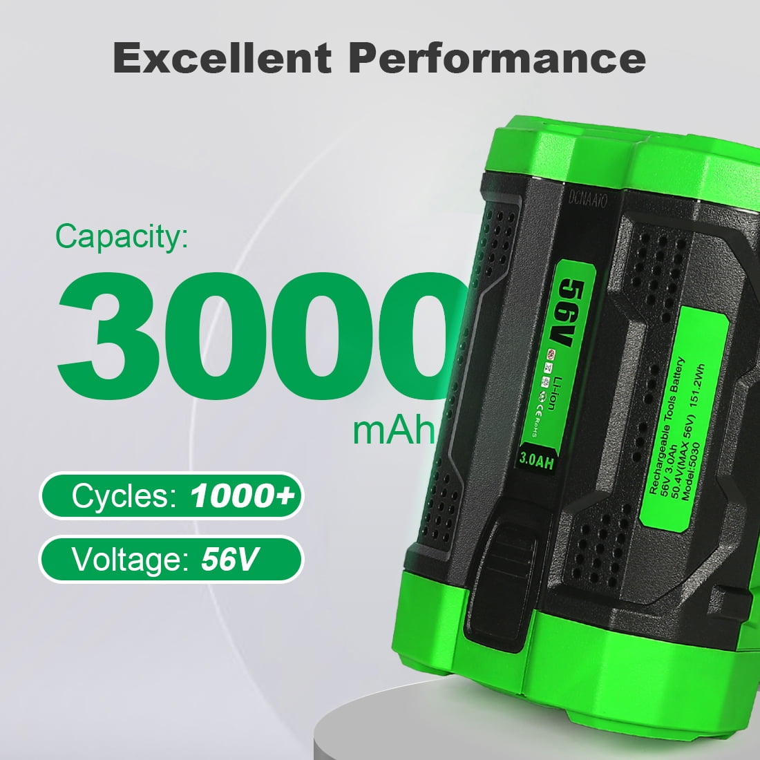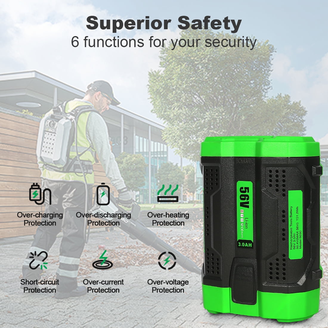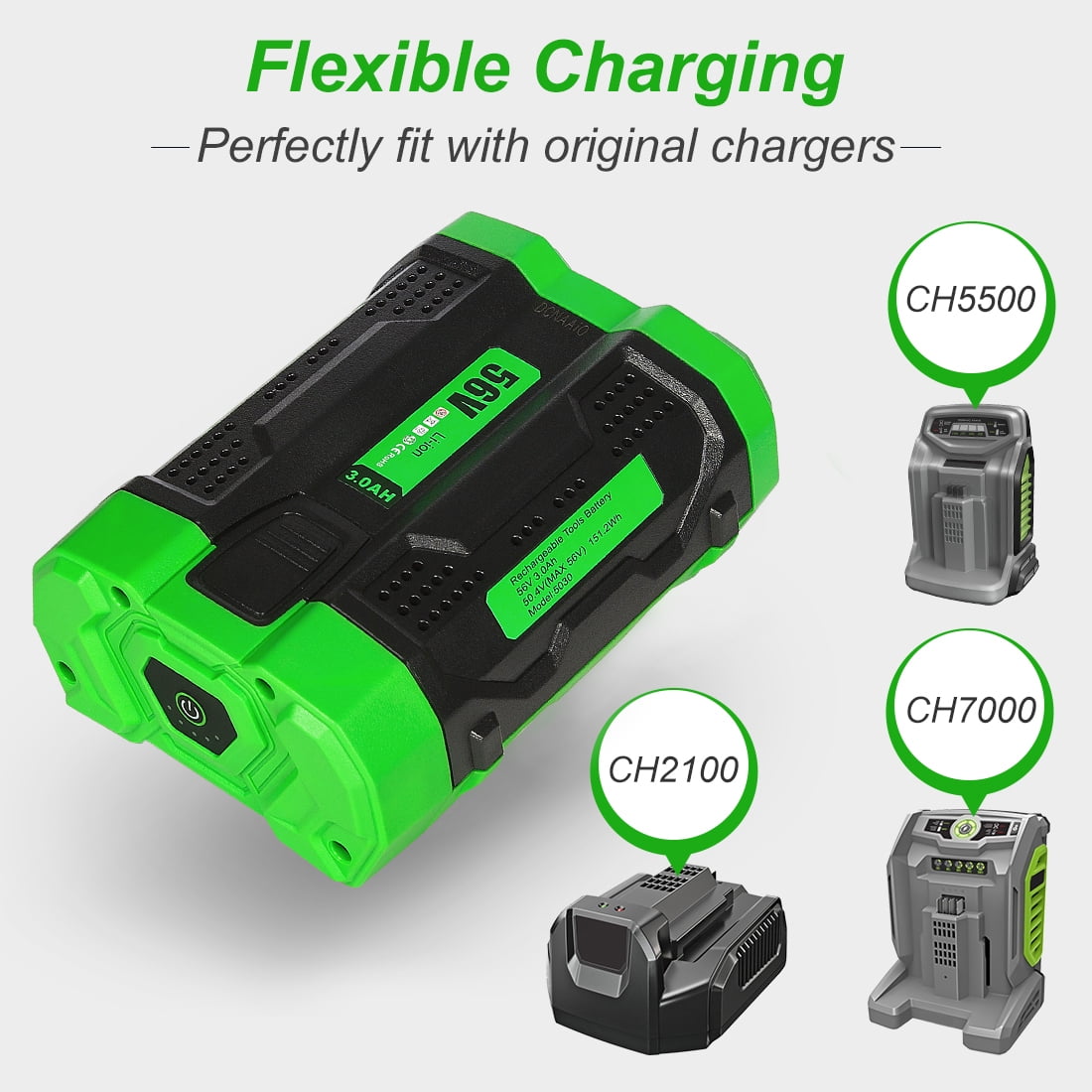 WITH UPGRADED FUEL GAUGE: The EGO Power tools battery is equipped an upgraded fuel gauge. Built-in indicator light allows you to see the remaining run time to avoid the predicament of power failure in the halfway. 6 SAFETYPROTECTION TECHNOLOGIES: Our ego replacement battery is guaranteed with 6 safety technologies, which includes protection against voltage errors, battery overloads, short circuits, overcharging and internal overheating. Everything is certified by CE FCC, ROHS , tested by manufacturer to match Tools. LARGE CAPACITY&LONG ENDURANCE: 56V 3000mAh 280W (Chargering time is measured in hours and that is calculated by Battery Capacity ÷ EGO Charger Current. In addition, to calculate how long that power can be delivered, use Battery Capacity ÷ Discharge current of tools (Ah) = Working time (h).) HIGHT COMPTIBITY: Support CH2100, CH7000, CH2800D, CH5500 chargers. Compatible with BA2800 BA4200 BA4200T BA1400 BA1400T CS1604 CS1804 CS1403 HT2400 LB6504 LB5804 LB6500 LB4800 HTA2000 STA1500 PH1400 PSA1000 all power tools but EXCEPT PST3042 & PST3041 portable power station. WARRANTY: No reason for a free return within 30 days, Product quality defects for free return within 30 days, Warranty within 1 year, any question, please feel free to contact us, 24 hours customer service for your interest protection!!!
