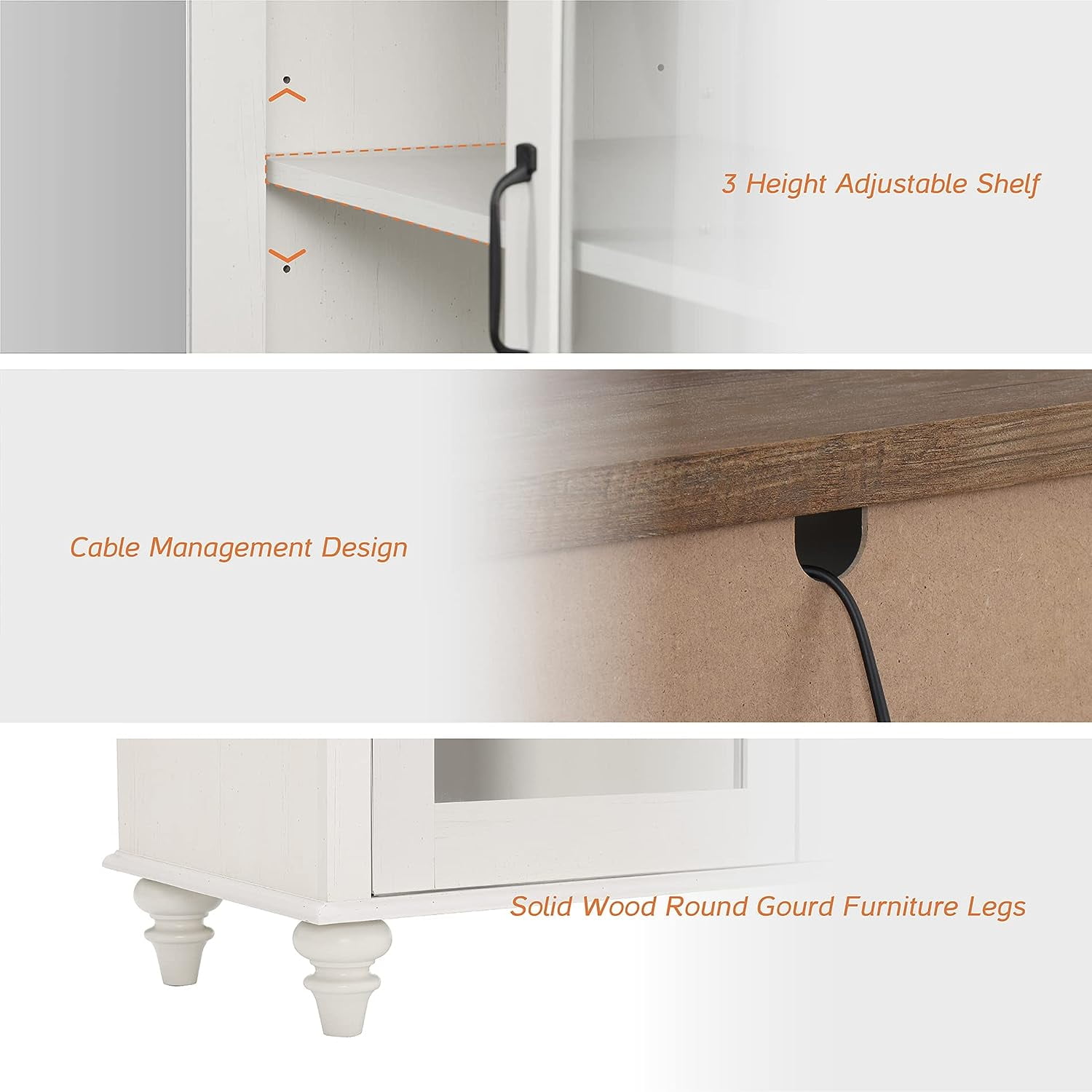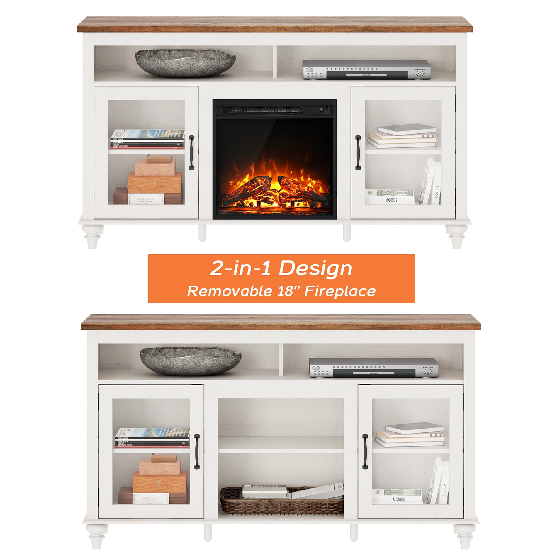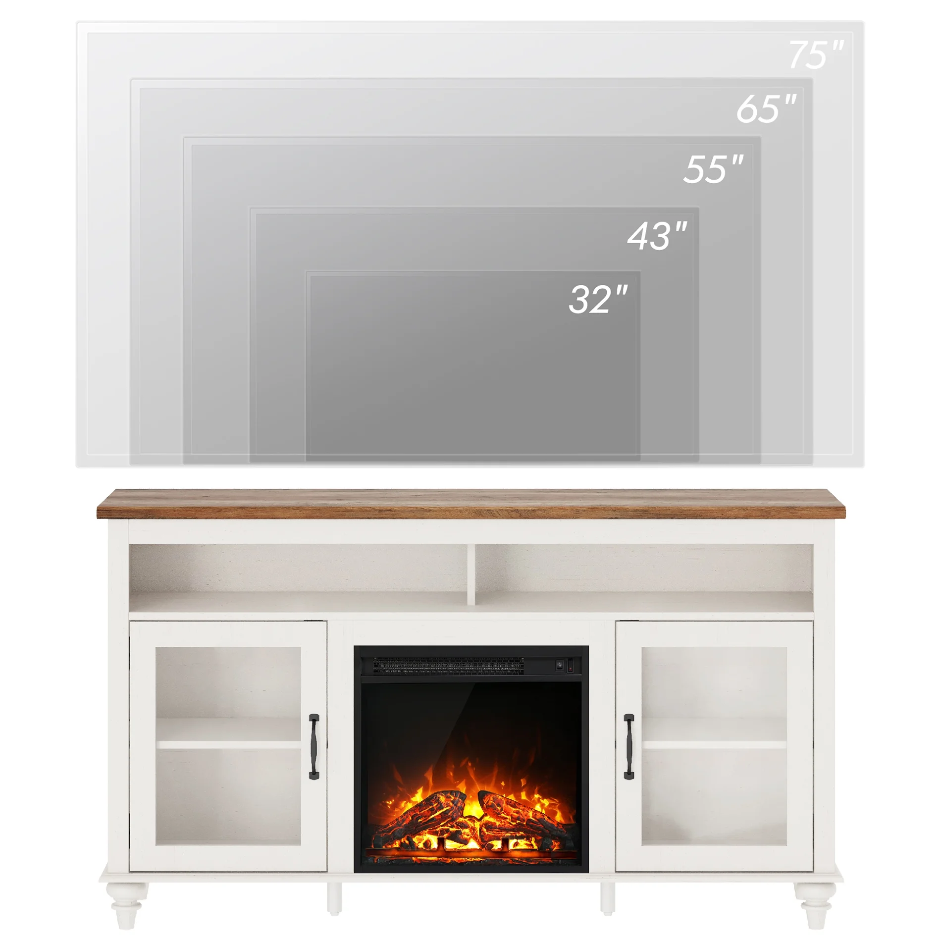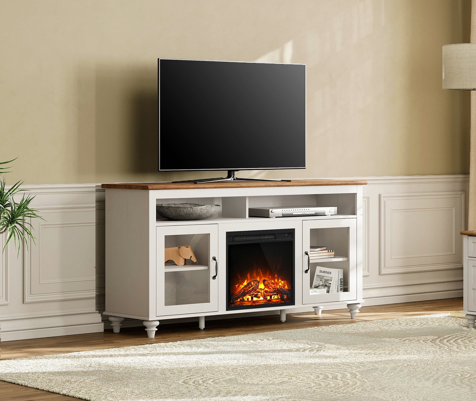 【2-in-1 Multi-Functional TV Cabinet with Storage】This TV cabinet with a fireplace behind a glass door can be installed optionally, providing warmth when the fireplace switch is turned on. During warmer weather, the fireplace can be removed, transforming the TV cabinet into a standalone piece. The vacant space can be used for storing DVDs, remote controls, and other items. This product offers two experiences in one! 【Farmhouse Glass Door Design】The WAMPAT TV stand is crafted from top-quality wood grain material and features 2 open doors and 2 open storage cabinets for easy access to everyday items. The retro brown roof and white cabinet blend perfectly with various decor styles. The stand comes with 2 solid wood gourds adding aesthetic appeal to your living room. 【Ample Storage Space】This TV stand with a fireplace can accommodate up to a 75-inch TV. Keep your valuable gadgets, cameras, and other items neatly stored in the lockers, with your gaming consoles and DVDs in the spacious enclosed lockers. It features cable management holes at the back for organization. Elevate your space with this stylish and functional piece. 【Safe Design & Rapid Heating】The fireplace features a 3D realistic flame effect with glowing logs and embers. The ETL certified fireplace is equipped with overheat protection for safe usage. The electric fireplace heater operates without open flames or smoke, quickly heating the room while maintaining natural humidity levels, making the room not too dry. It can heat rooms up to 400 sq.ft. 【User-Friendly Design, Lifetime Warranty】This mid-century modern TV cabinet includes an anti-fall device to prevent tipping accidents. The bottom is elevated to allow a robot vacuum cleaner to pass underneath for easy daily cleaning. It comes with a lifetime warranty and 24-hour after-sales service.