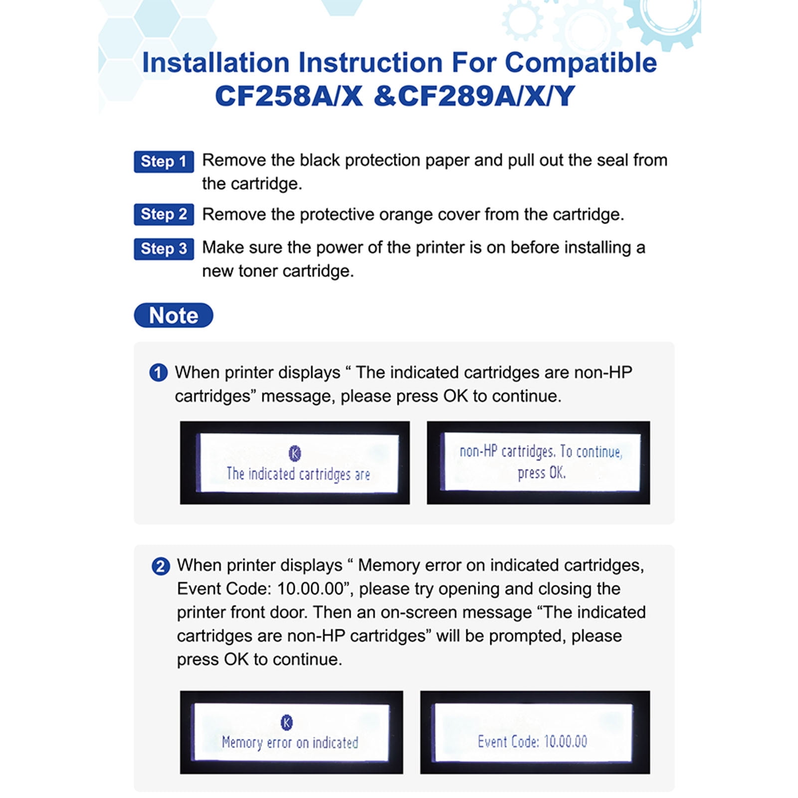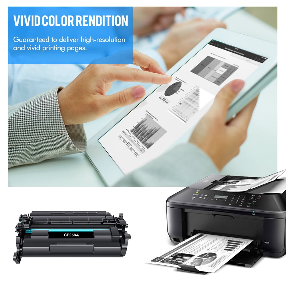 These 58A Laserjet Toner Cartridges are already installed with HP 58A CF258A chips, No need to transfer for original 58A CF258A or 58X CF258X Toner Chip to them. Up to (3,000 pages) for HP 58A CF258A Ink Cartridge Black Provide with HP MFP M428fdw M404n Printer. (Letter/A4, at 5% coverage). 2 Pack Compatible for HP 58A LaserJet Toner Cartridge (Black) Replacement for HP 58A Black Toner Cartridge (CF258A). 58A Cartridge Compatible for HP LaserJet Pro M404n, M404dn, M404dw; LaserJet Pro MFP M428fdw, M428dw, M428fdn; LaserJet Enterprise M406dn M406; LaserJet Enterprise MFP M430f M430; LaserJet Pro M304 M304n M304dn printer. 58A CF258A 258A 58X CF258X toner provides clear and vibrant printing effect, which gives you a good visual feast. Please confirm your printer model before ordering.