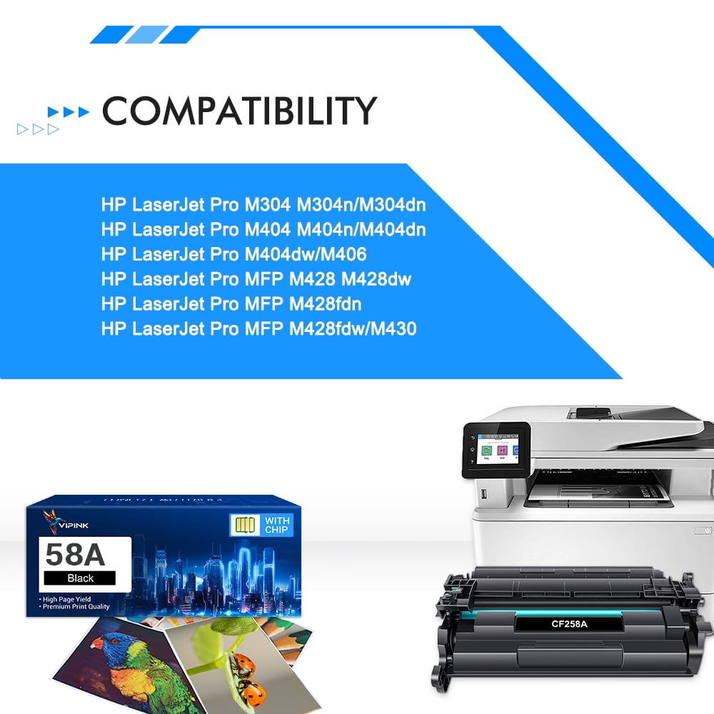 58A Toner Compatible for HP 58A Black Laserjet Toner Cartridge | Compatible for HP LaserJet Pro M404n Series, LaserJet Pro MFP M428fdw Series, LaserJet Enterprise M406dn Series, LaserJet Enterprise MFP M430f Series | CF258A Toner ✅ With Chip: These 58A toner cartridges 2 pcs are alread installed with NEW chips, No need to transfer orginal HP 58A or HP 58X toner chip to them. ✅ Compatible for HP 58A CF258A 58X CF258X Black Toner Cartridge with Printer: HP LaserJet Pro M404n M404dn M404dw M404 printer HP LaserJet Pro MFP M428fdw M428fdn M428dw M428 printer HP LaserJet Enterprise M406 M406dn printer HP LaserJet Enterprise M430 M430f printer HP LaserJet Pro M304 M304n M304dn printer ✅ Page Yield: Up to 3,000 pages per for 58A toner cartridge black (Letter/A4, at 5% Coverage). ✅ Ink Color: 58A CF258A Black toner cartridge ✅ Package Included: 2 packs of 58a cf258a toner cartridges (with chip) VIPInk is a reseller of printer consumable products with its warehouses in East and West Coast with delivery times of 2-3 days. Our services are to provide quality printing supplies, Especially the compatible toner cartridges 58A CF258A (with chip) at a discount price, while offering the great shopping experience possible.