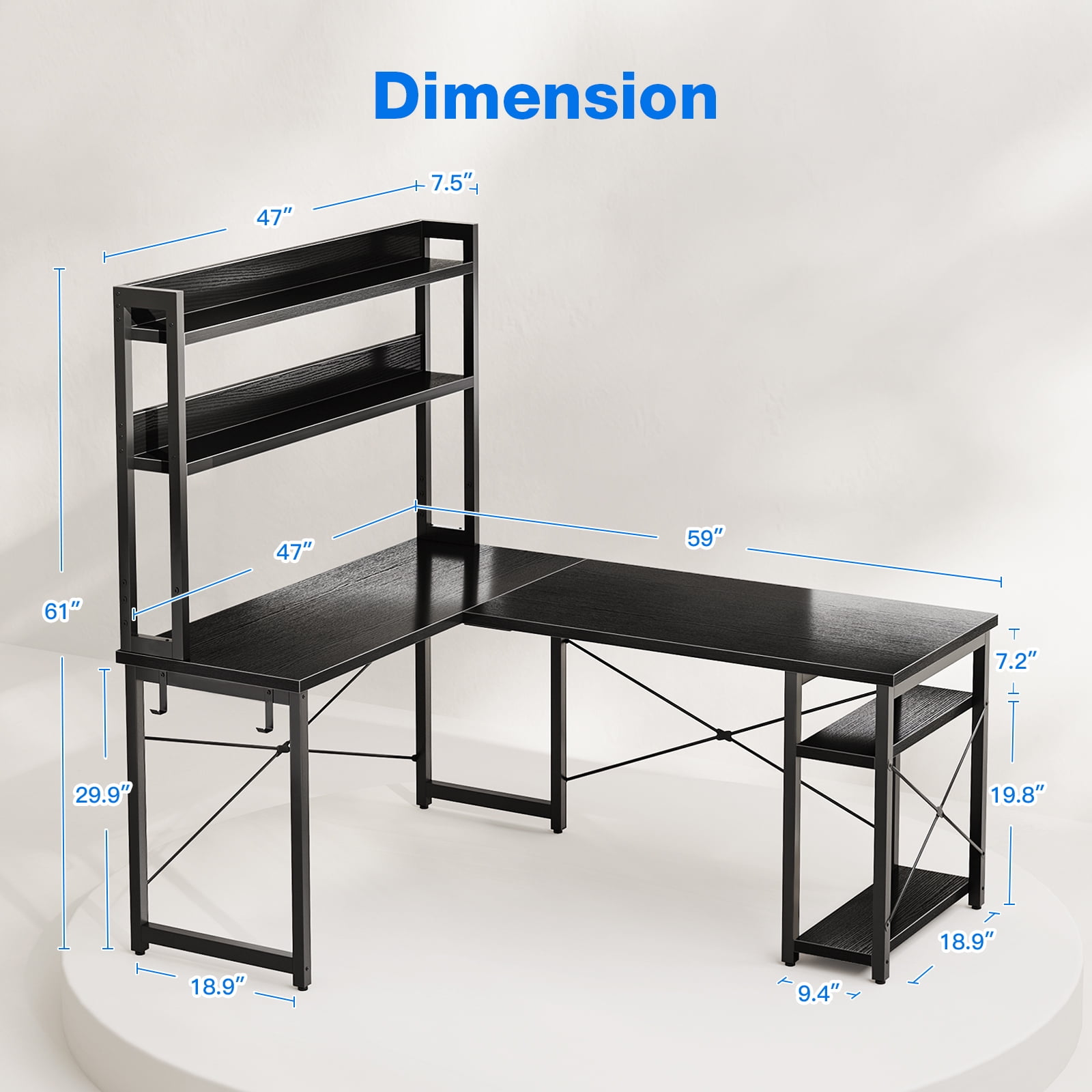59″ Reversible L-Shaped Gaming Desk with Hutch, Office Desk with Storage Shelves for Home Office, Corner Computer Desk with Headphone Hook, Black