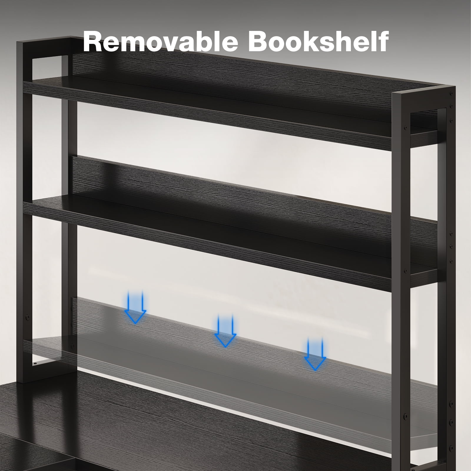 Features: Removable Bookshelves Sturdy CPU Stand Convenient Iron Hook Large Storage & Sitting Room Adjustable Foot Pads Easy to Assemble Product Information: Shape: L-Shape Product Dimensions: 59″ D x 47.2″ W x 29.9″ H Color: Black Style: Modern Base Material: Metal, Wood Number of Drawers: 3 Mounting Type: Freestanding Furniture Finish: Black Size: 59 inch