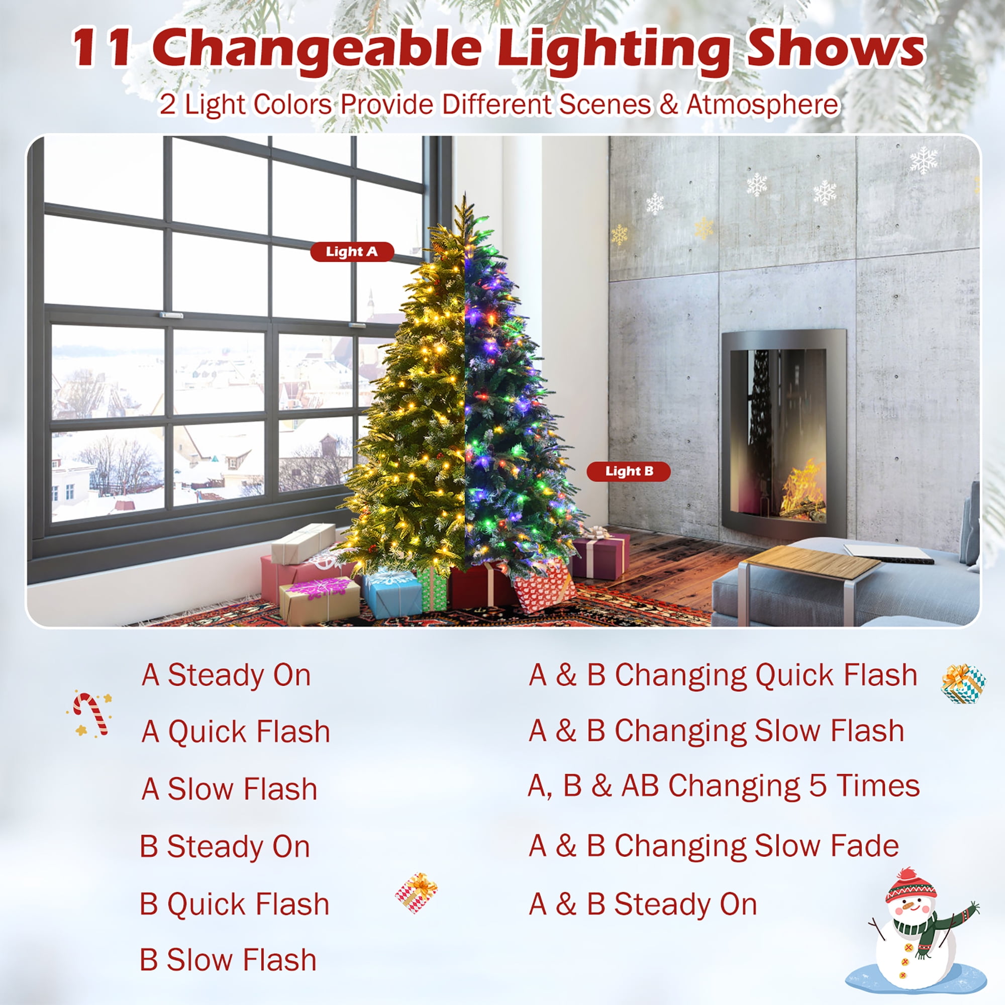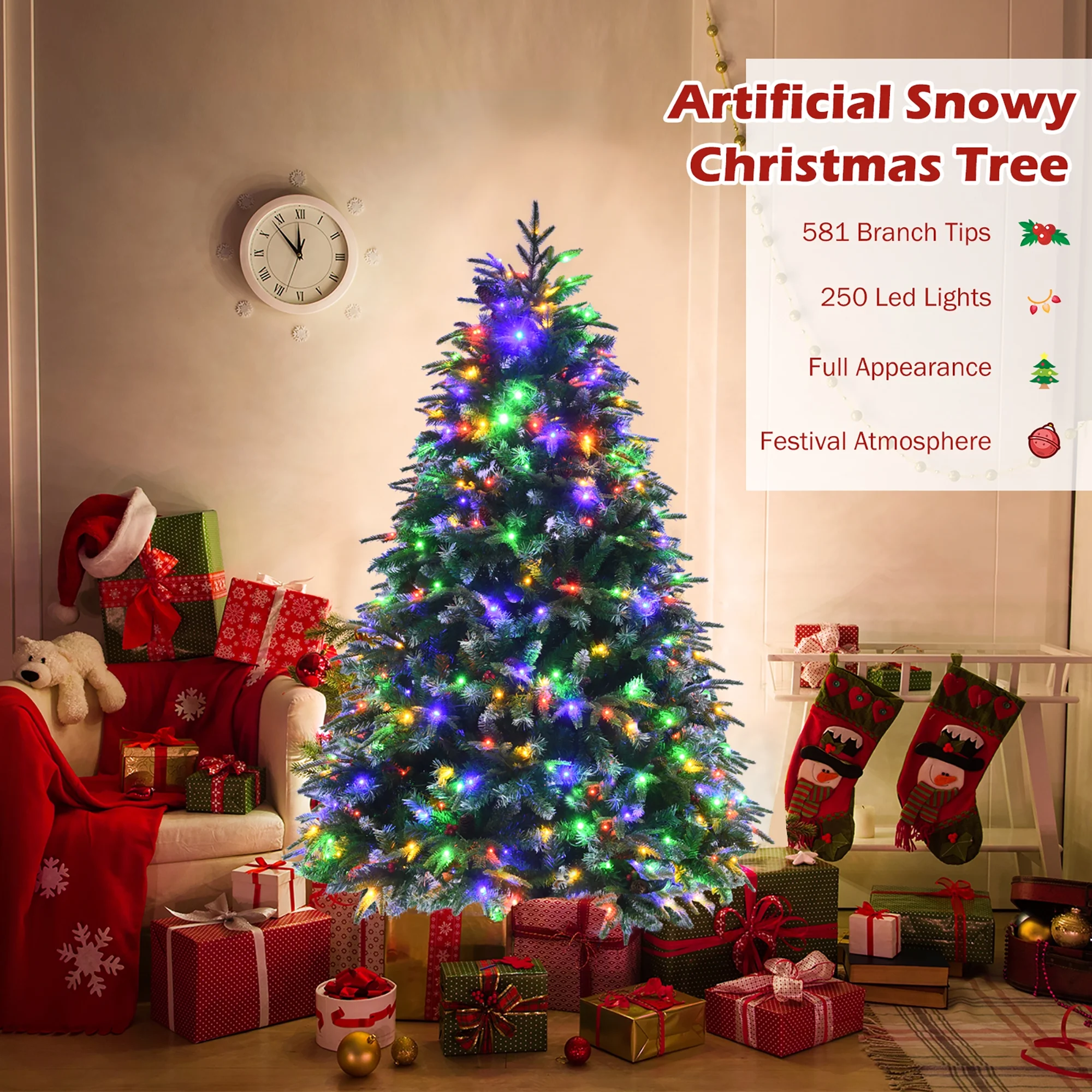Pre-Decorated Lush Christmas Tree: Comes with 581 branch tips, 28 plump pine cones and 28 clusters of red berries, this artificial Christmas tree create a lush and charming appearance. Besides, the snowy design on tips enhances wintry vibe and natural vividness. Provide Charming Lighting Shows: Equipped with 250 bright LED lights, this 2-color changeable Christmas tree brings home romantic vibe & beautiful lighting show. And there are 11 dynamic effects for you to choose, such as steady on, quick flash, slow flash, changing flash and changing fade. Durable PE & PVC Material: Made of premium PE and PVC material, this realistic Xmas tree is safe and inodorous for family long-term use. 2 different leaf shapes and materials show natural shades of gradation, providing a real and dense looking. Hinged Design for Quick Set-Up: Thanks to the hinged structure, the life-like pine tree is easy to fluff and assemble. All branches will automatically drop to the designed place, which can save your time and energy. Besides, the tree is supported by folding metal stand, ensuring high stability. Eye-Catching Festival Decoration: Uprightly standing Christmas tree with full-bodied shape make it attractive and elegant. The shiny tree at night offers beautiful scenes and strong festival vibe. You can add extra ornaments for better spreading endless happiness and sincere wishes.