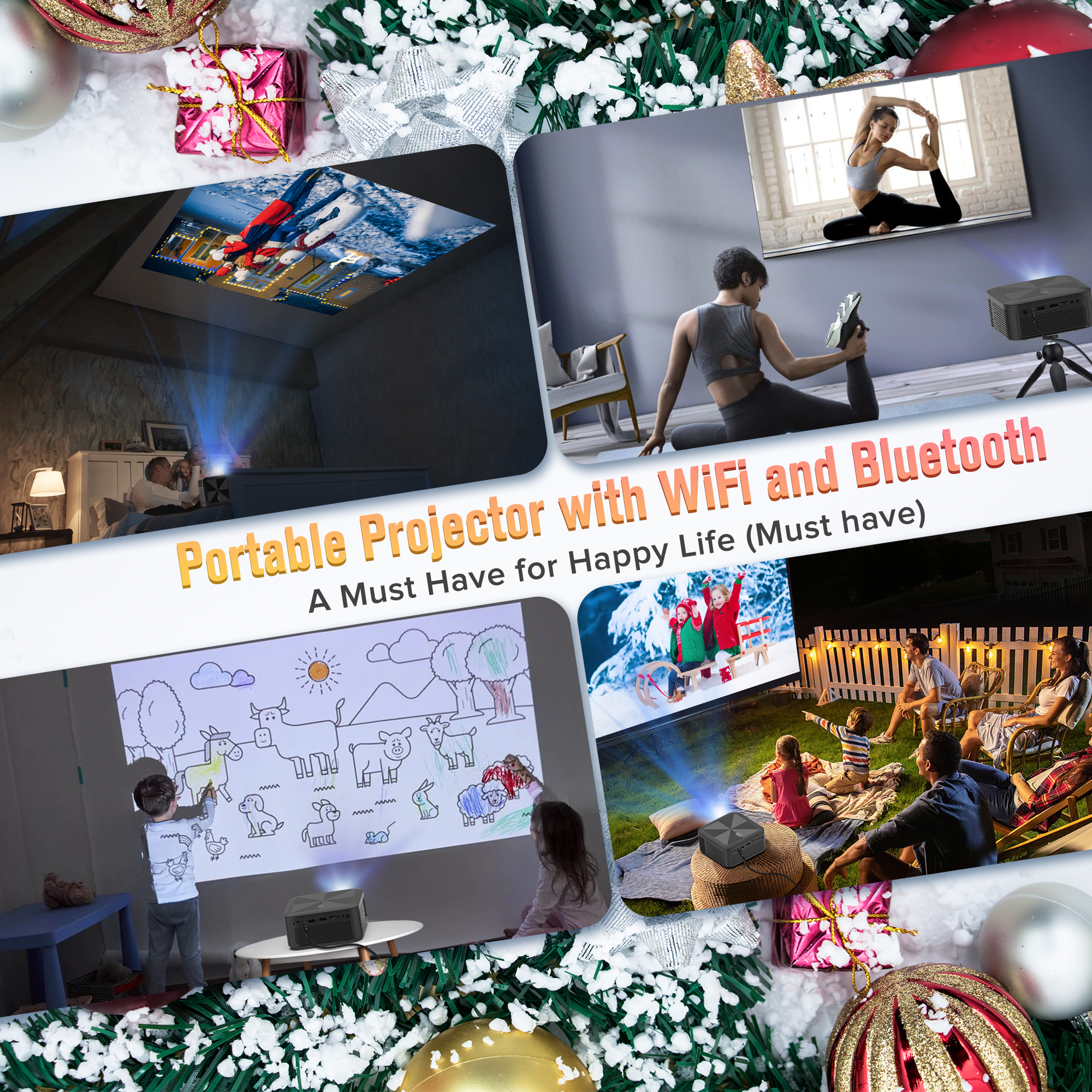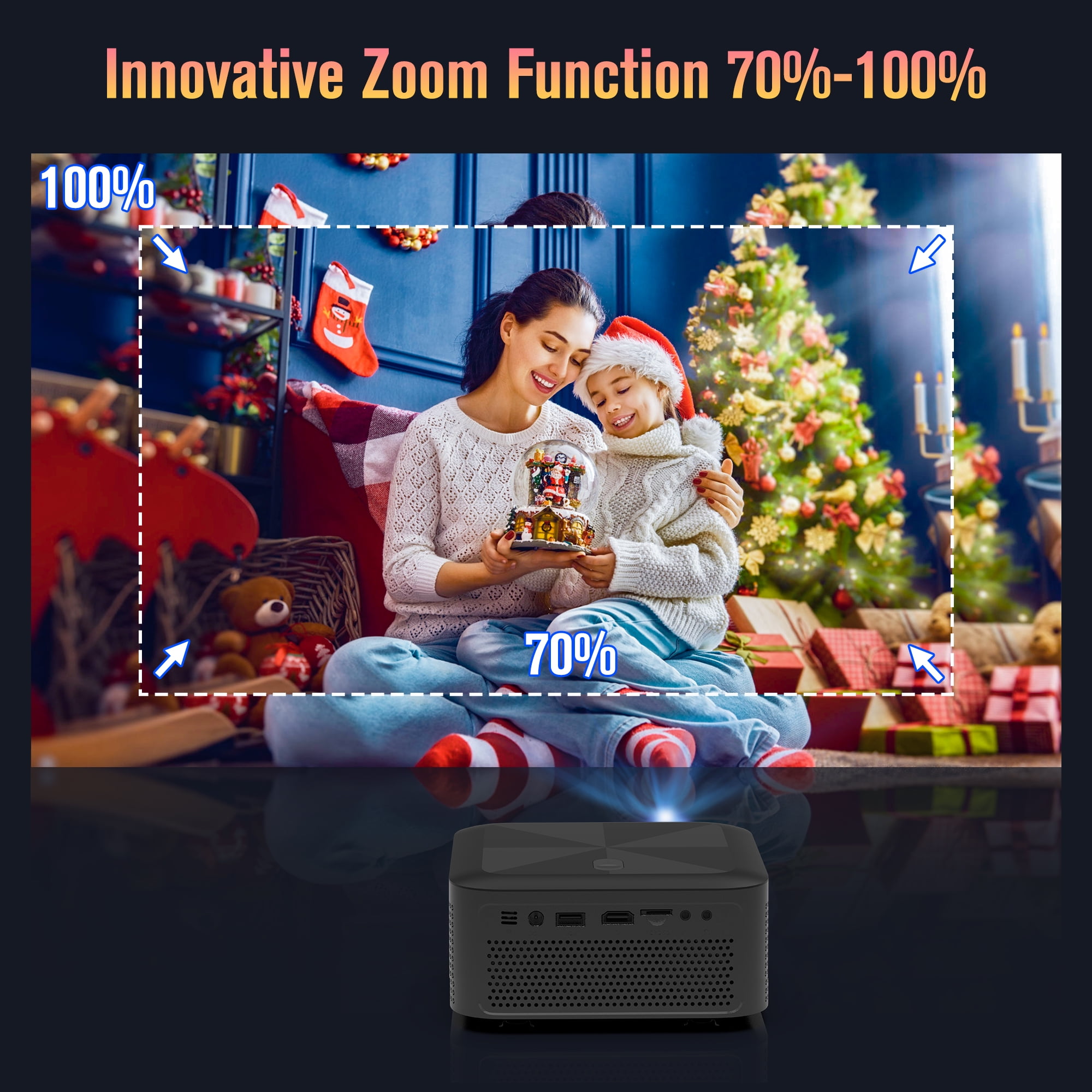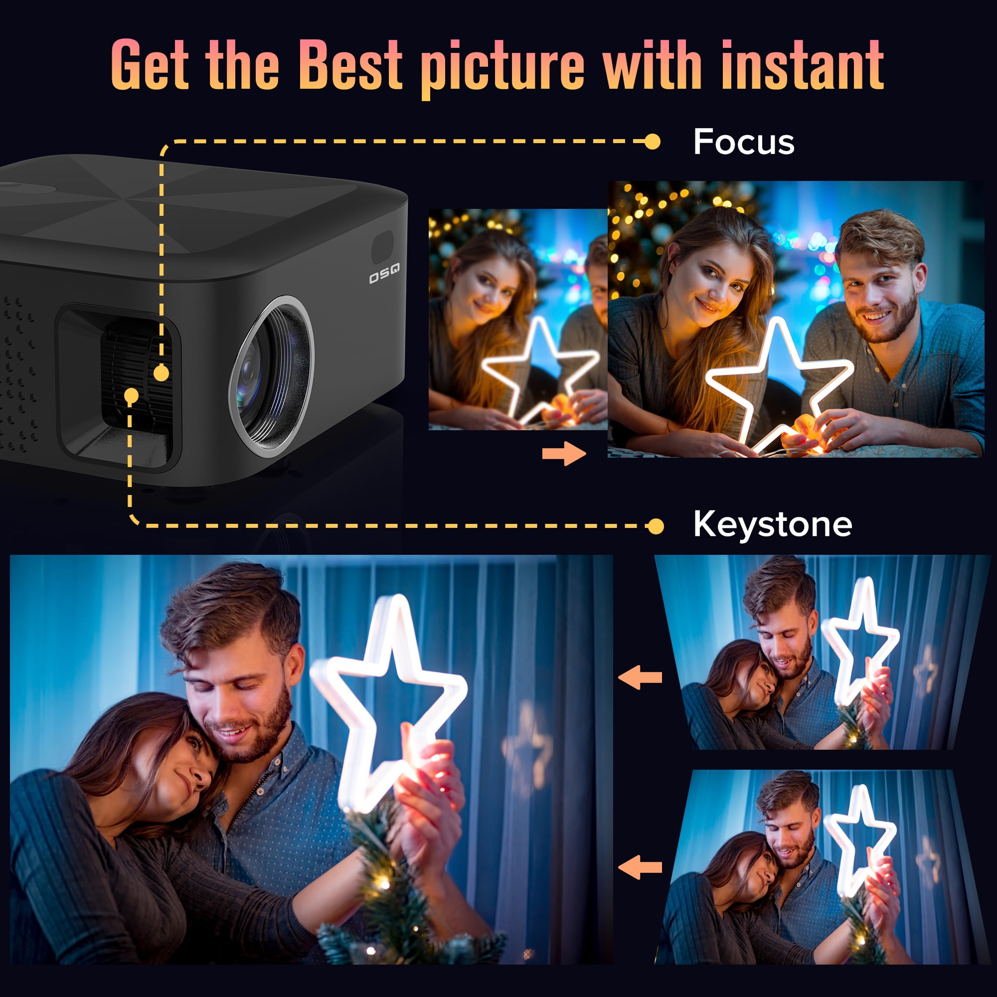 With Halloween, Thanksgiving, Christmas and other festivals approaching, you must be worrying about what kind of gifts to prepare for your children, parents, lovers or friends from now on, what’s more important, It is best that this gift is affordable and making surprising . If you Find our OSQ WiFi projectors, Just choose us with 100% confidence. Because this projector is specially customized for you, This Portable projector with WiFi and Bluetooth can definitely meet your needs and bring you an unexpected experience. 2024, OSQ 5G WiFi Projector, You Deserve have it! 【2.4G/5G Dual- Band WiFi Connection】Equipped with the latest WiFi 6 Technology, OSQ portable projector support 5G&2.4G WIFI Connection, the 2.4G WiFi is stable and has wide coverage, ultra-fast 5G WiFi offers you a more stable connection and lag-free online streaming experience for video streaming and gaming online. 【Wireless WiFi Mirroring Screen & Airplay】It’s different with many other 1080p WiFi Projector, OSQ 304 hd projector not only support mirror screen with IOS & Android devices, this 5G WiFi 1080p Projector also Featuring DLAN Screen Cast function, Only one simple step on the mobile app, The phone screen will be cast immediately on a bigger screen through projector while free your phone/pad to do anything other like chatting, gaming, working etc. 【340ANSI LM &8000:1 Contrast Ratio】OSQ 2023 Latest Outdoor Movie Projector with Native 1280*720 Resolution, support Full HD 1080p &4K video projector with 340 ANSI Brightness &8000: 1 contrast ration, which presents you with a real, dynamic, and color-vibrant projection image quality, provide you with a clearer and sharper visual feast. 【5.0 Bluetooth Function& Dual Hi-Fi Speakers】This Full HD 1080p projector built in 5.0 Bluetooth chip, enable you connect your Bluetooth speaker/headphone/ soundbar with this portable video projector to enhance the audio at will. Immersive in the happy moment like at Cinema . Besides, built in dual stereo speaker could provide you a loud and clear sound anytime even without connecting any speakers. 【75% Zoom &250″ Big Screen 】Compare to traditional TVs, our this mini 1080p movie projector can provide a 250″ projection size, provide a bigger viewing screen to you. What’s more, Featured the Zoom Functions allows you to adjust the screen size from 100%-70% easily without moving the Home projector distance . This perfectly help yous solved the room space issue, no need to consider whether the space is fit or not anytime. 【Wide Compatibility&Portable Design】with the interfaces of HDMI, USB, AV IN and audio included, makes it easier to connect TV sticks, USB, PCs, laptop, iOS&Android Phone, DVD player, PS5, External Speaker play your favorite Movies, TV series, Live show, Football Games at home . Moreover, with the compact small size at 16cm*16cm*7.8cm and lightweight design, which makes this led movie projector space saving and convenient to take it on the go .