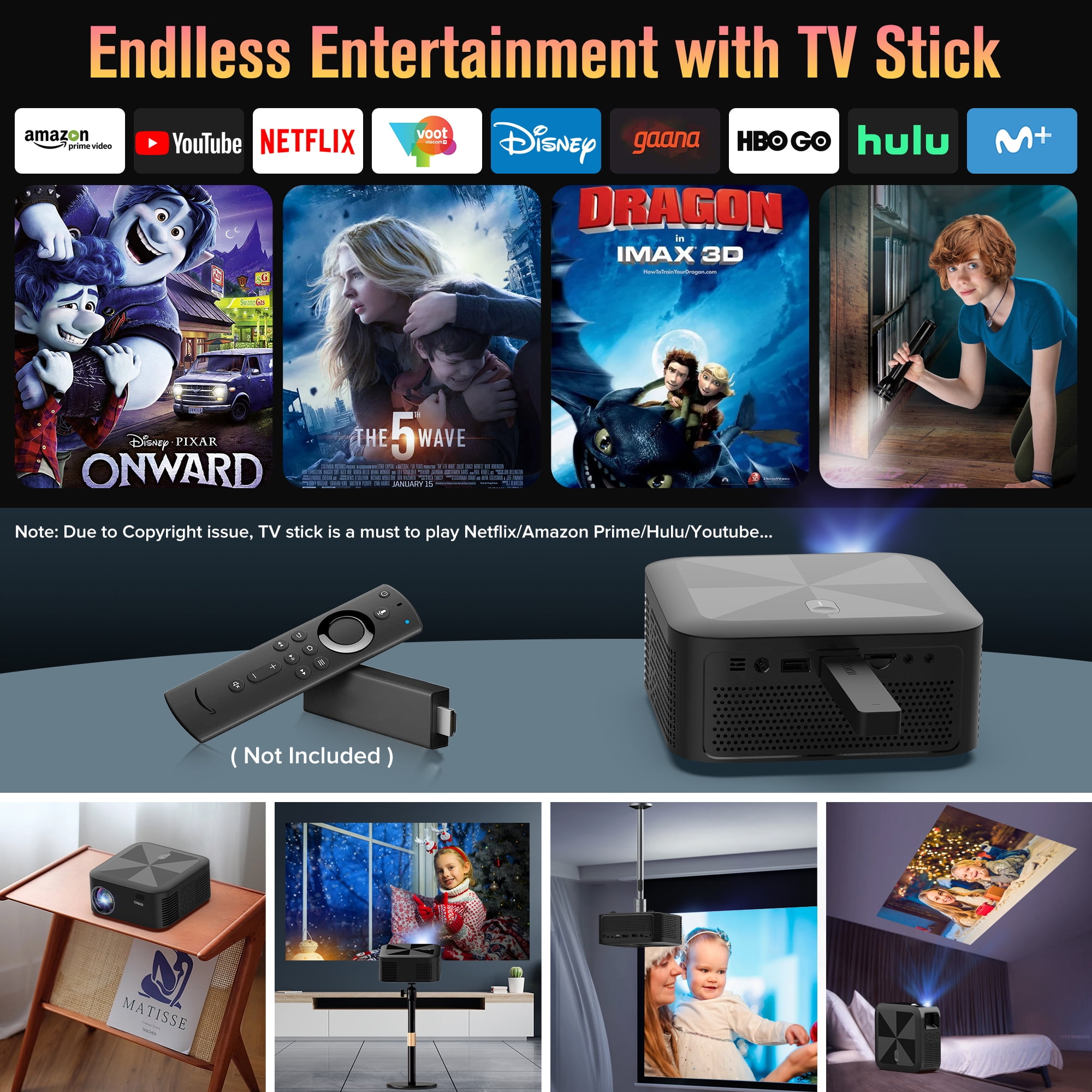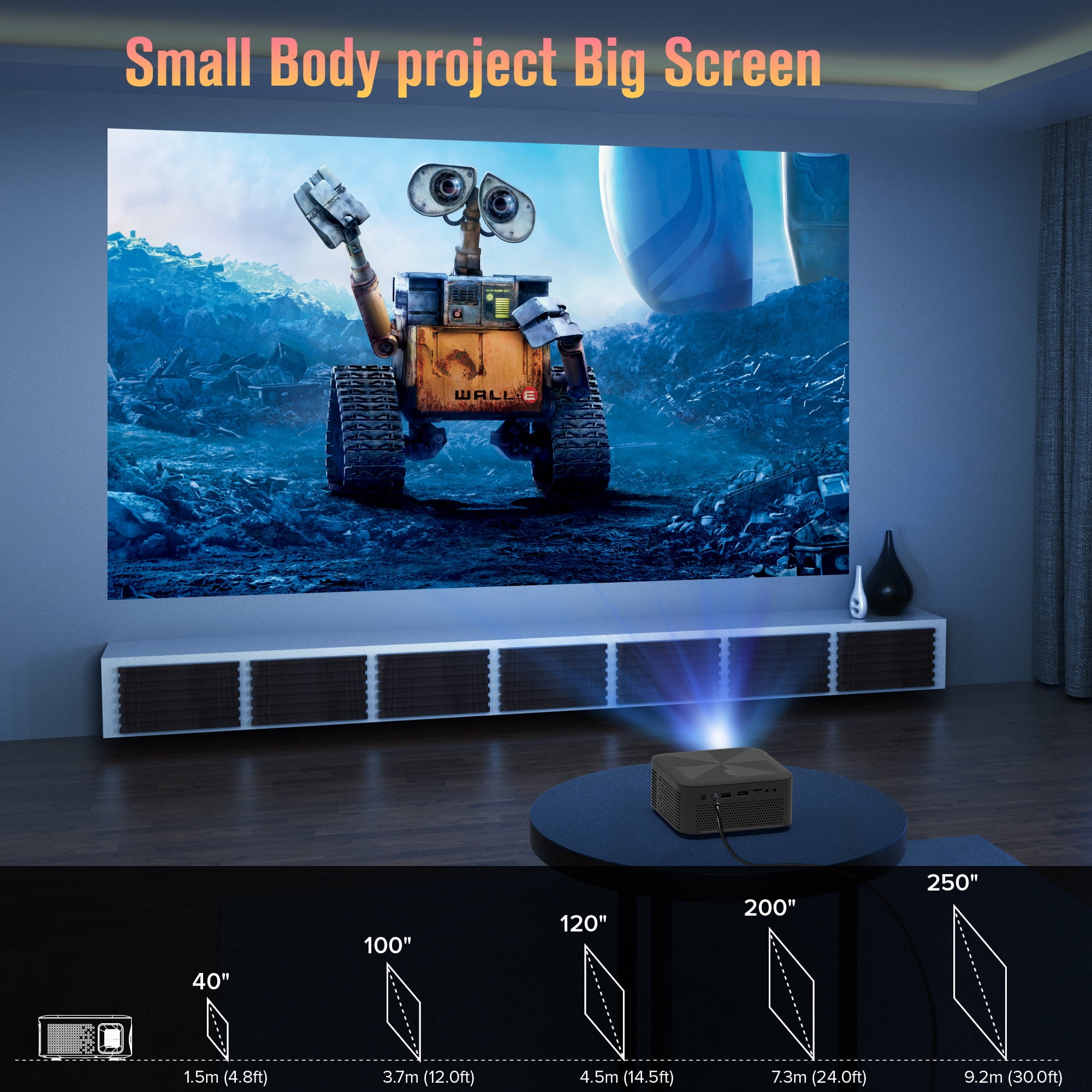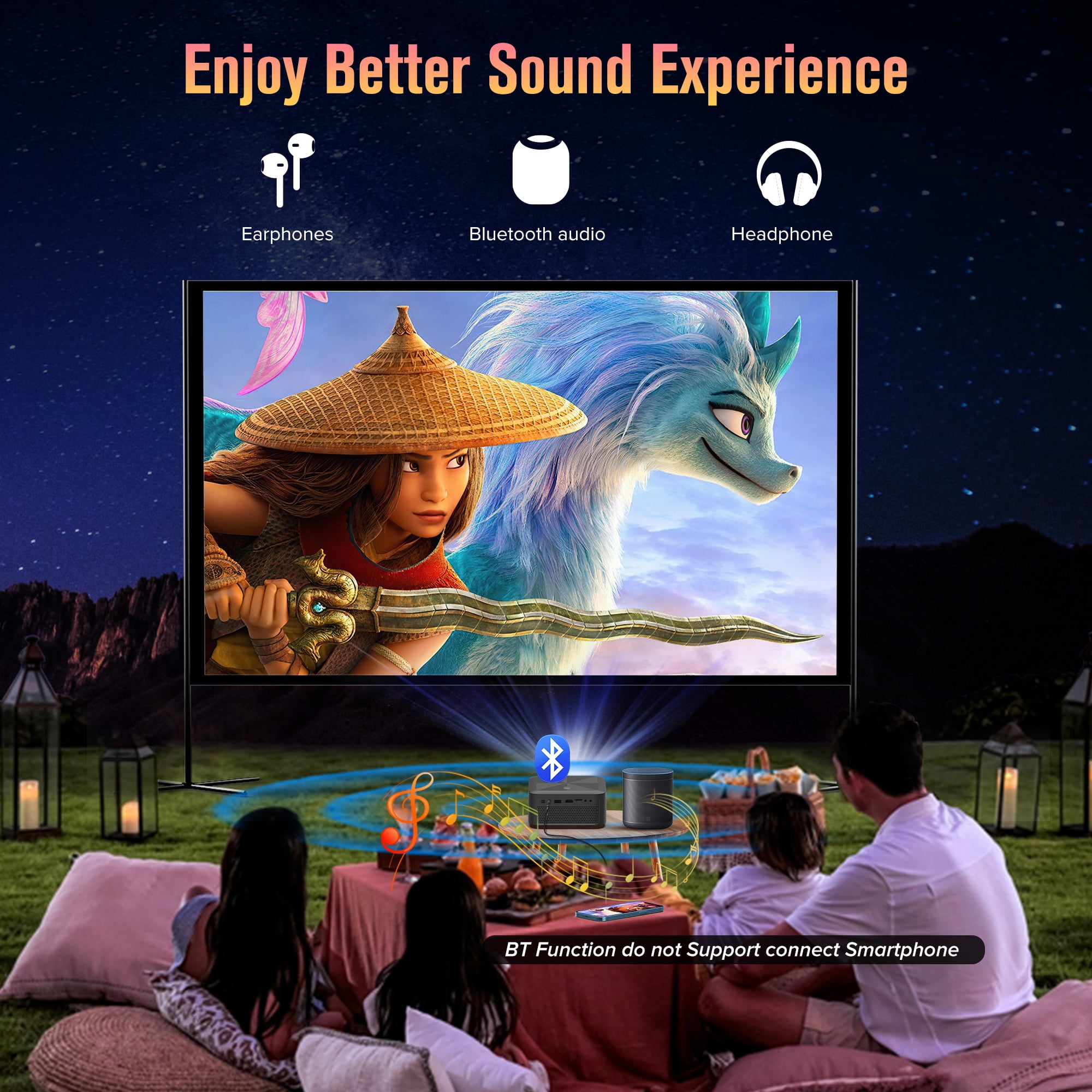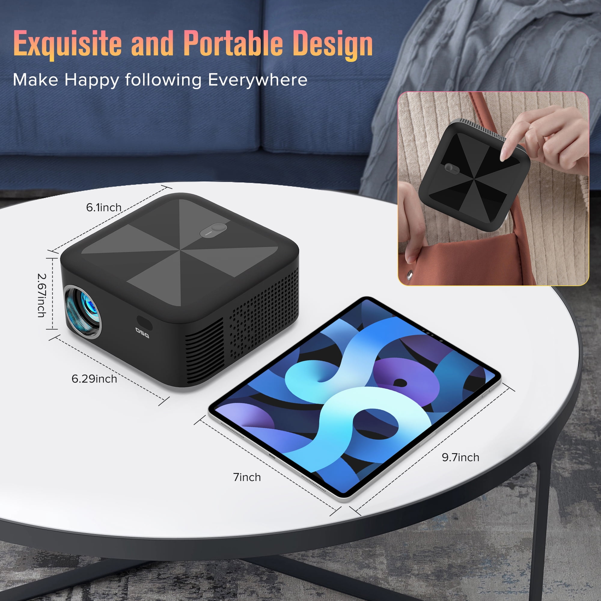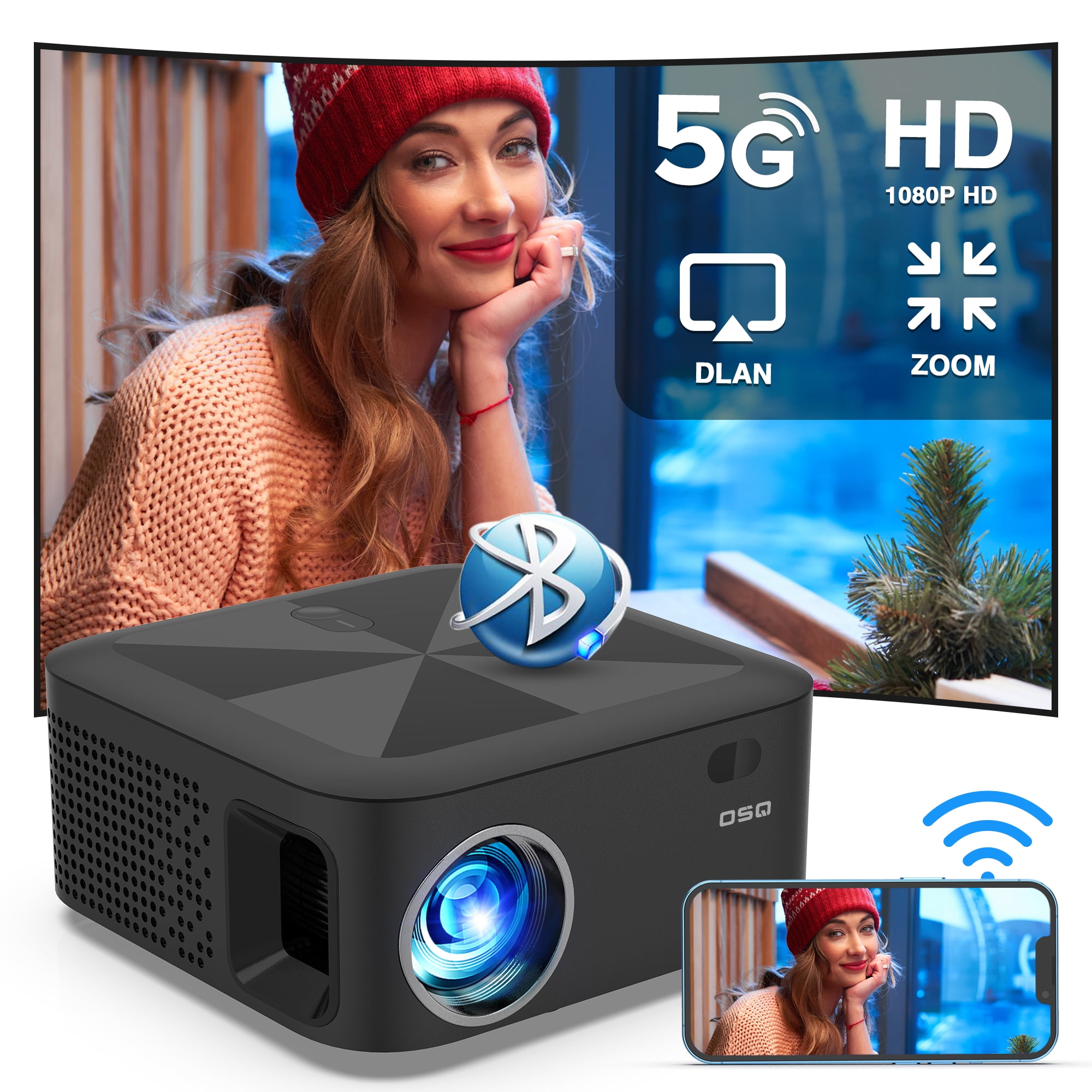 Specifications: Brightness: 340 ANSI Resolution: 720P Native Contrast Ratio: 8000:1 Aspect Ratio: 16:9/4:3 Projection size: Max 250inch WiFi Connection:2.4G&5G Mirror Screen &DLAN: Support ZOOM: 70%-100% Item dimension: 16cm*16cm*7.8cm Unit net Weight: 1.7lbs Package Content: 1*WiFi Projector 1*Remote control 2* AA battery 1* Power Cable 1*HDMI Cable 1*User Manual 1* Cleaning cloth Top questions you may ever meet in future: Q1. Why i can not mirror screen or cast the Netflix, Hulu, Prime Video to the projector ? Due to copyright issue, Netflix, Hulu, Prime Video, Disney are prohibited directly mirror screen with projector to play it, You have to connect your TV stick, Dongle or Laptop with the projector to achieve it. Q2. Why there is no sound when plugging in TV stick OSQ wifi Bluetooth projector do not support Dolby Digital. The sound of the TV stick generally defaults to Dolby Digital. Please try to turn off Dolby sound in this way: Settings> Display and Sound> Audio> Dolby Digital Out. Q3.Why the projector didn’t work with Bluetooth connection to smartphone? The built in Bluetooth function for this 5G WiFi 1080p Projector only support to connect with Bluetooth audio device like Bluetooth Headphone/Earphone/ ear buds/Speakers. ATTENTION: Smartphone do not support Bluetooth Connection with projector to transfer Data directly Q4. When i have questions with my projector, how should we do ? Please kindly send an immediate email to us, we have professional customer service, your any questions will get our fast reply and best solution soon. 2.4G/5G Dual- Band WiFi Connection|Wireless WiFi Mirroring Screen & Airplay|340ANSI LM &8000:1 Contrast Ratio|5.0 Bluetooth Function& Dual Hi-Fi Speakers|75% Zoom &250| Big Screen|Wide Compatibility&Portable Design
