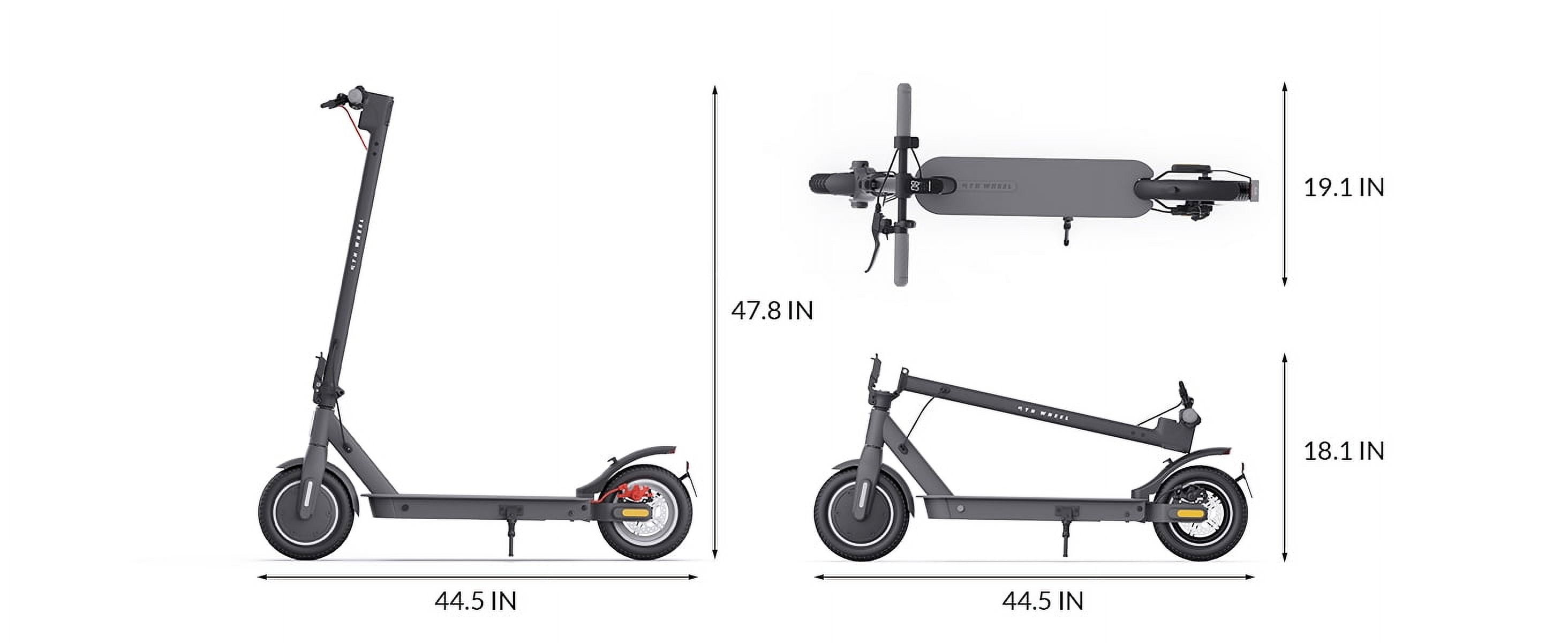 Unique Turn Signal and Dual Brake System: The 5th wheel V30 Pro features the safest turn signal design, providing left and right signals to accompany you intimately on your rides. It ensures pedestrians and vehicles are alerted of your upcoming turns, ensuring a safer ride. Additionally, the scooter is equipped with EABS and a mechanical disc brake system, which provides responsive and timely braking at any speed Make Commuting Easier: Our electric scooters enhance travel efficiency and reduce traffic wait times, 500W peak power motor provides ample power, while the 270Wh battery ensures reaching speeds of up to 18 mph and covering distances of up to 19.9 miles range. Its 10″ solid tires and rear shock absorption, allow you to tackle uneven terrains without any impact on your comfort. The aerospace-grade aluminum frame offers sturdy support for riders weighing up to 264 pounds and effortlessly conquers 15% inclines Cruise Control and 4-Speed: The cruise control feature allows for a more relaxed and energy-efficient ride, as you no longer need to continuously hold down the throttle for a comfortable and stable riding experience. The scooter also offers four-speed gears, giving you the freedom to choose your preferred speed to adapt to different riding scenarios. The smart 5th wheel app supports functions such as locking the scooter, changing speed units, and checking battery life Foldable and Lightweight: The adult electric scooter can be folded in just 3 seconds, achieving maximum portability. After folding, its dimensions are 44.5 x 19.1 x 18.1 inches, and it weighs 32.2 pounds, making it easy to carry and store in your garage or car, ensuring enhanced theft-proof security V30 PRO Foldable Electric Scooter with Smart APP Faster – 18mph speed. Featuring a 350W motor, which accelerates to 18 mph in seconds Longer – 19.9 miles range The high capacity 36V, 7.5Ah battery lasts up to 19.9 miles per charge Smoother – 2 springs The rear dual suspension will ensure you have a smooth ride Features: This is the first scooter on the market with turn signals for traffic safety The 10-inch tires have the advantages of wear resistance, durability, and longer service time Braking system: EABS + Disc braking. All these make it easy to ride and safer The net weight is 32.2 lbs and this scooter can be carried easily Specification: Start Mode: Zero start/non-zero start APP: Support iOS & Android Tires: 10-inch pneumatic tires Braking System: EABS+DISC braking Suspension: Dual front fork Waterproof: IP 54 Battery: 36V 7.5Ah Motor: 350W Max Speed: 18 mph Max Range: 20 miles Max Loading: 265 lbs Color: Black Item Weight: 32.2 lbs Item Package Dimensions: 45.47 in x 6.3 in x 21.26 in Included Components: Electric Scooter Unser Manual Charger Installation Tools