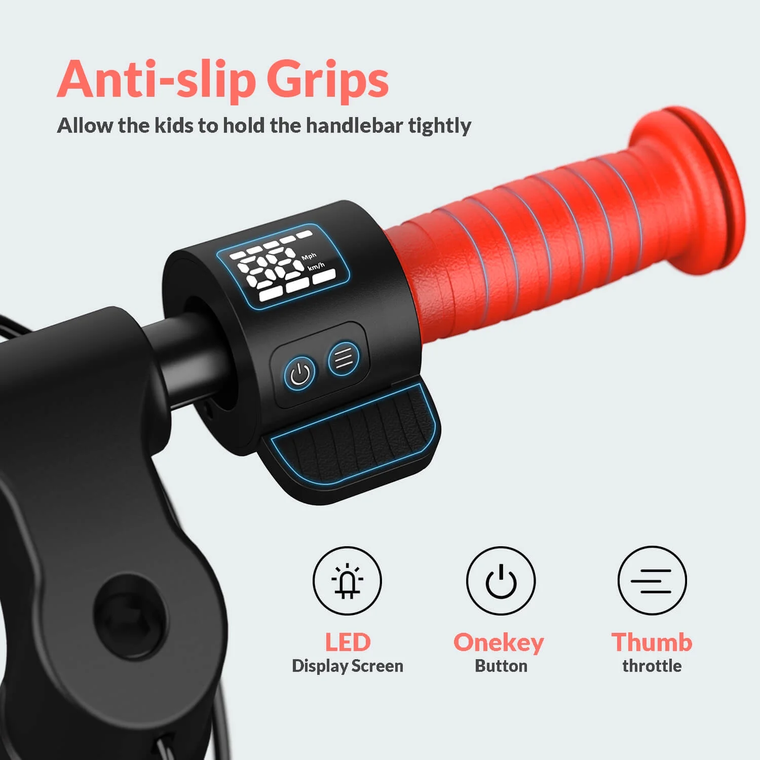 K9 Electric Kid Balance Bike This is the first bike for kid, it’s the perfect companion for children learning to ride. Kids will be proud of owning their own bikes, and enjoy happy riding time with family and friend. Features: * Removable Battery and Quick charging: 2-3 hours Full charger to provide a ranges of up to 7.5 miles. Support to charge the kid balance bike directly or remove to charged independently. * Smart LCD Display: Provides accurate data for battery life, gear, current speed and so on. * Safe E-brake: Achieves efficient braking when kids want to stop the bike, safe for riding. * Flexible Anti-slip handlebar: Support the kids to control the bike easily and the kids to hold the handlebar tightly. * 12 inch Anti-skidding Fat Tires: Bring kids an comfortable riding experience, suitable for varied terrains. * Integrated Design Frame: Providing a more stable and high performance for long time using. Specification: Bike Type: Balance Bike, Electric Bike For Kids Number of Speeds: 3 Speed Modes Wheel Size: 12 inch pneumatic tires Dual braking system: Electronic brake+disc brake Battery: 22.3V 2.5Ah Charge time: 2-3 hours Motor: 150W Max Speed: 7.5mph Max Suration: 7.5miles Max Load: 67lbs Color: Black, Red Item Weight: 17.2lbs Adjustable Seat Height Item Package Dimensions: 31.69in * 7.48in * 14.56in Included Components: Electric bike for kids, User Manual, Charger, Installation Tools