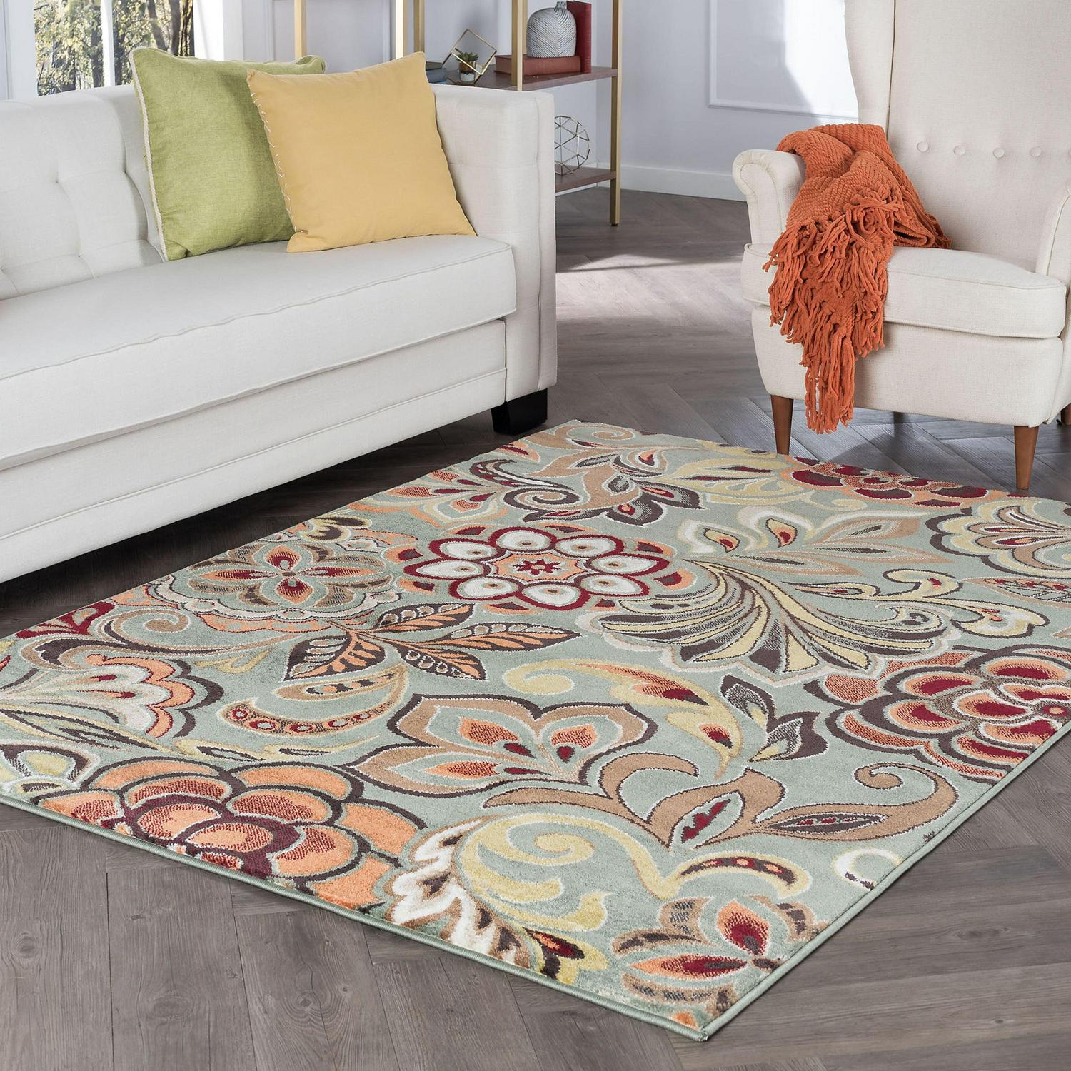 You will love this romantic floral design with tropical flair. It is a fun flirty indoor area rug that is at home with farmhouse or boho styles and will complement your exceptional decor. Top quality construction and stain-resistance at a great value. Trending colors create a warm and cozy setting for your living room, dining area, bedroom, or family room. Transitional 5×8 Area Rug (5’3” x 7’3”) Floral Seafoam, Red Living Room Easy to Clean. Good fit for living room, dining room, bedroom. Vacuum on medium pile setting to remove debris taking care to avoid fraying the edges. Spot clean with water, do not bleach. Rotate periodically to extend the life of your investment.