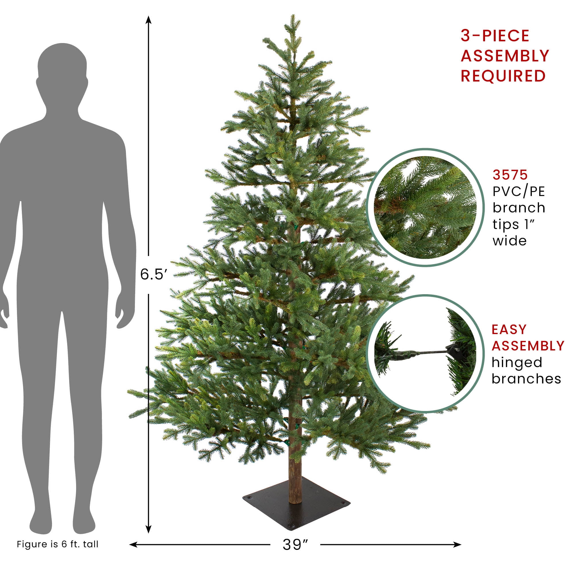 This show-stopping tree is a must-have in your holiday decor. Features 3575 tips giving it incredible fullness and depth. So realistic you’d swear it was freshly cut from the forest. The unlit feature enables you to decorate any way you wish. The perfect choice for the upcoming holiday season. Product Features: Unlit 3575 tips 1″ wide tapered tips Full profile tree Hinged branch construction For indoor use only 3-piece easy assembly (including stand) Comes with a attached black metal tree stand Dimensions: 6.5′ high (from the base of the stand to the top of the tree)” 39″ base diameter (at the widest point) Material(s): PE/metal Note: Branches are compressed for shipment and need to be fluffed out upon arrival to look like the photo.