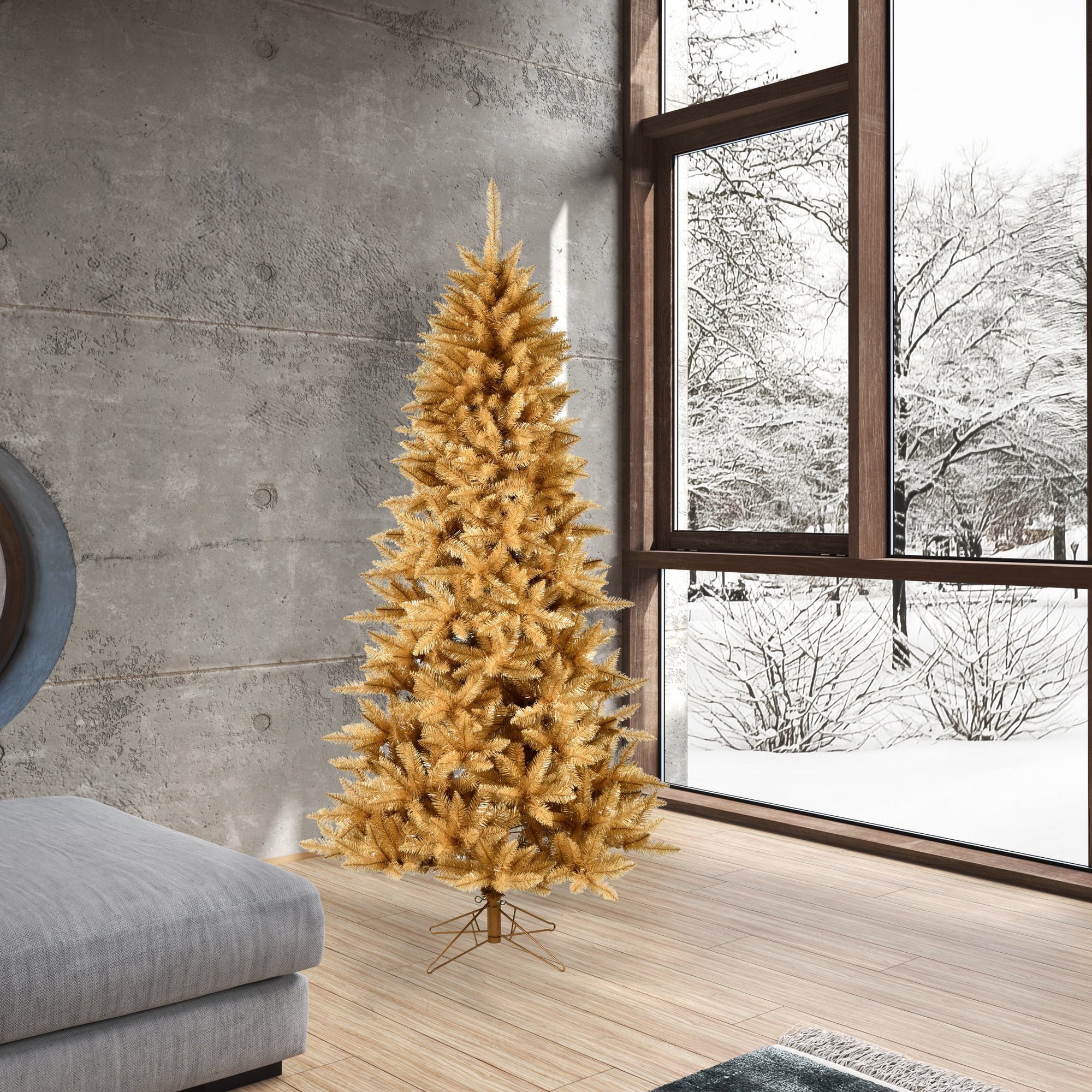 Vickerman 6.5′ x 40″ Gold Fir Artificial Christmas Pencil Tree with 749 PVC Tips, Hinged Branches and Folding Metal Stand