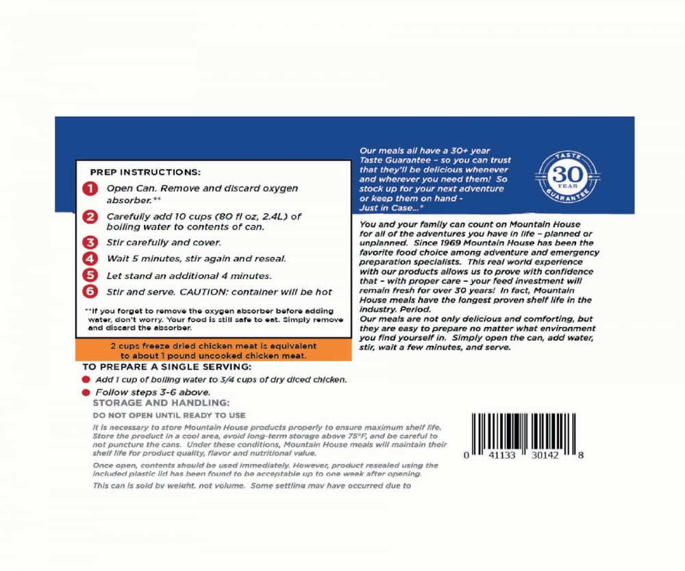 Just add hot h20. Protein packed. Long shelf-life. 100% natural meat. Never chewy or oily, this freeze-dried meat tastes great because it retains the original taste, texture, nutrients, and aroma of the chicken. Prepare just by adding water. Just add water and in a matter of a few minutes you are eating great-tasting meat the whole family will benefit from, protein is a must in all pantries. Be ready for decades to come with a 25+ year shelf life you can enjoy the peace of mind that comes from being prepared. Like many say: Prepare for the worst but hope for the best. Our freeze-dried diced chicken makes a wonderful addition to your ingredients so when you make your favorite recipes from chicken enchiladas to chicken salad sandwiches you are set. Also a great addition to ready-to-eat meals that don’t have meat like pasta parmesan and pasta primavera. Mountain house freeze-dried foods are at the top in terms of quality and taste.