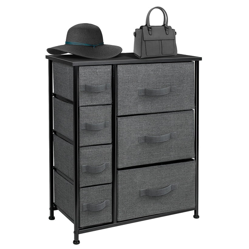 Sorbus 7 Drawers Chest Dresser – Black 7-DRAWER DRESSER (BLACK) – Style meets function with our small dresser chest, complete with a wood surface and storage drawers. Pairs beautifully with the Sorbus Foldable Furniture Collection DISPLAY & DE-CLUTTER – The wood top provides a hard surface for displaying lamps, alarm clocks, books, eyeglasses, charging stations, and more. Drawers are great for storing clothes, blankets, linens, baby clothes, lingerie, purses, scarves, socks, accessories, gadgets, toiletries, cosmetics, hair/beauty products, paperwork, toys, knitting supplies, and household clutter FOR HOME, OFFICE, DORM – Suitable for bedroom, living room dresser, guest room, closet, nursery, hallway, college dorm, small apartment solutions, etc. Can be used as dressers for bedroom, storage cube dresser, 7 drawer dresser, small closet dresser, storage chest, living room dresser, sofa end tables, office supply storage, kids’ nightstand, or baby nursery table. Complements most decor whether traditional, rustic, or modern REMOVABLE & FOLDABLE DRAWERS – Soft fabric drawers with reinforced base. Easy pull handle for quiet opening and closing. Removable Drawers fold flat for easy storage when not in use. The entire unit is portable, lightweight, and easy to relocate to different spaces. Small drawers approx. 6″ deep. Large drawers approx. 8″ deep SMART & STYLISH DESIGN – Sleek wide storage. Made with a strong steel frame and durable MDF wood top with a smooth black finish. Charcoal gray drawers are made of breathable, non-woven fabric. Wipe clean. Minimal assembly required. Hardware and instructions included. Measures approximately: 25″ L x 11.87″ W x 28.75″ H This beautiful dresser chest features a tabletop surface and pull-out drawers to tuck away household clutter. The thoughtful design is great for small living spaces and works equally well near the bed or sofa. Organization enthusiasts will enjoy filling each drawer with clothing, linens, and knick-knacks from around the home. The lightweight frame makes this unit easy to transport and when not in use, simply fold the fabric drawers flat for storage. Use alone as a single unit or pair with any drawer configuration from the Sorbus Furniture Collection. With everything you need right by your side, getting organized has never looked better!