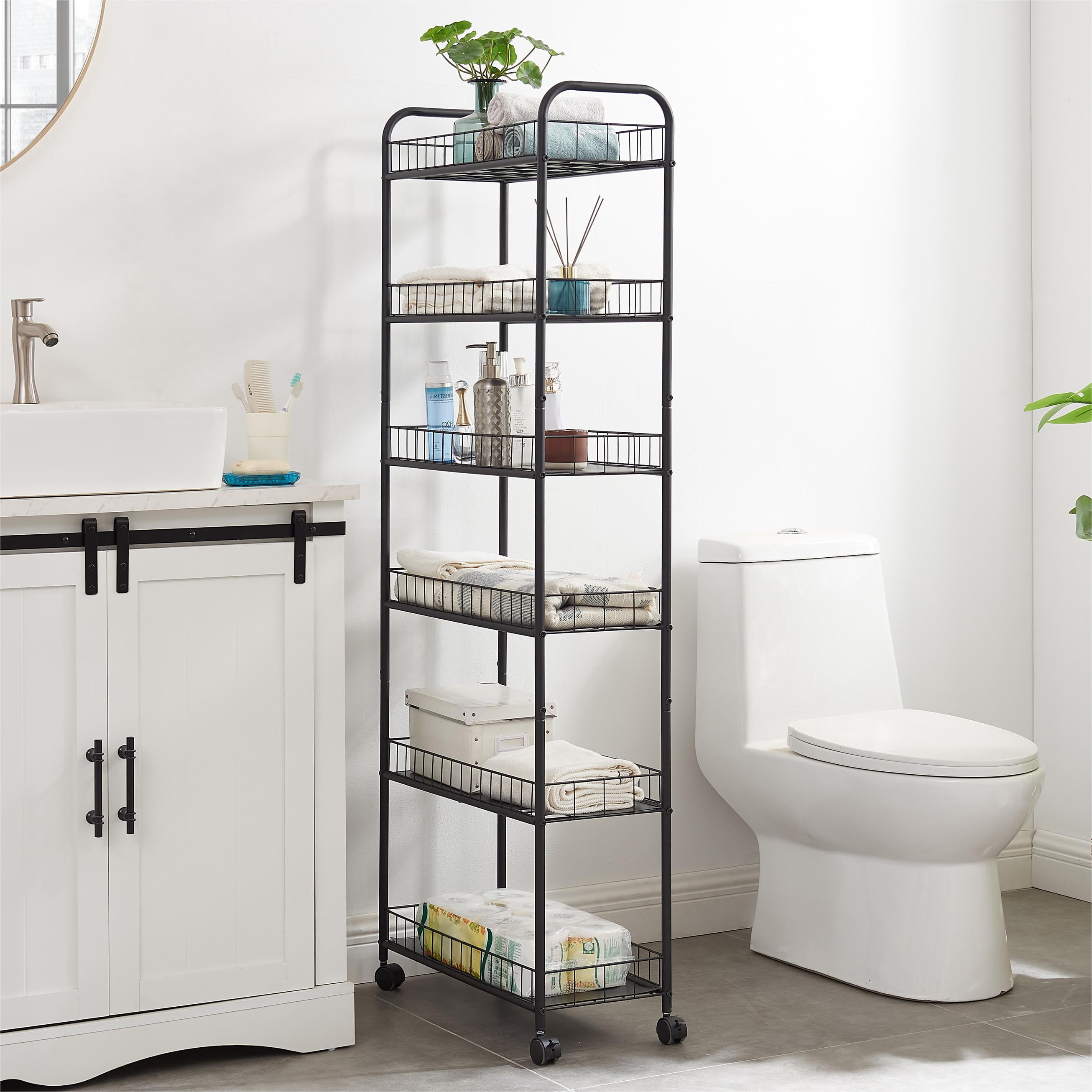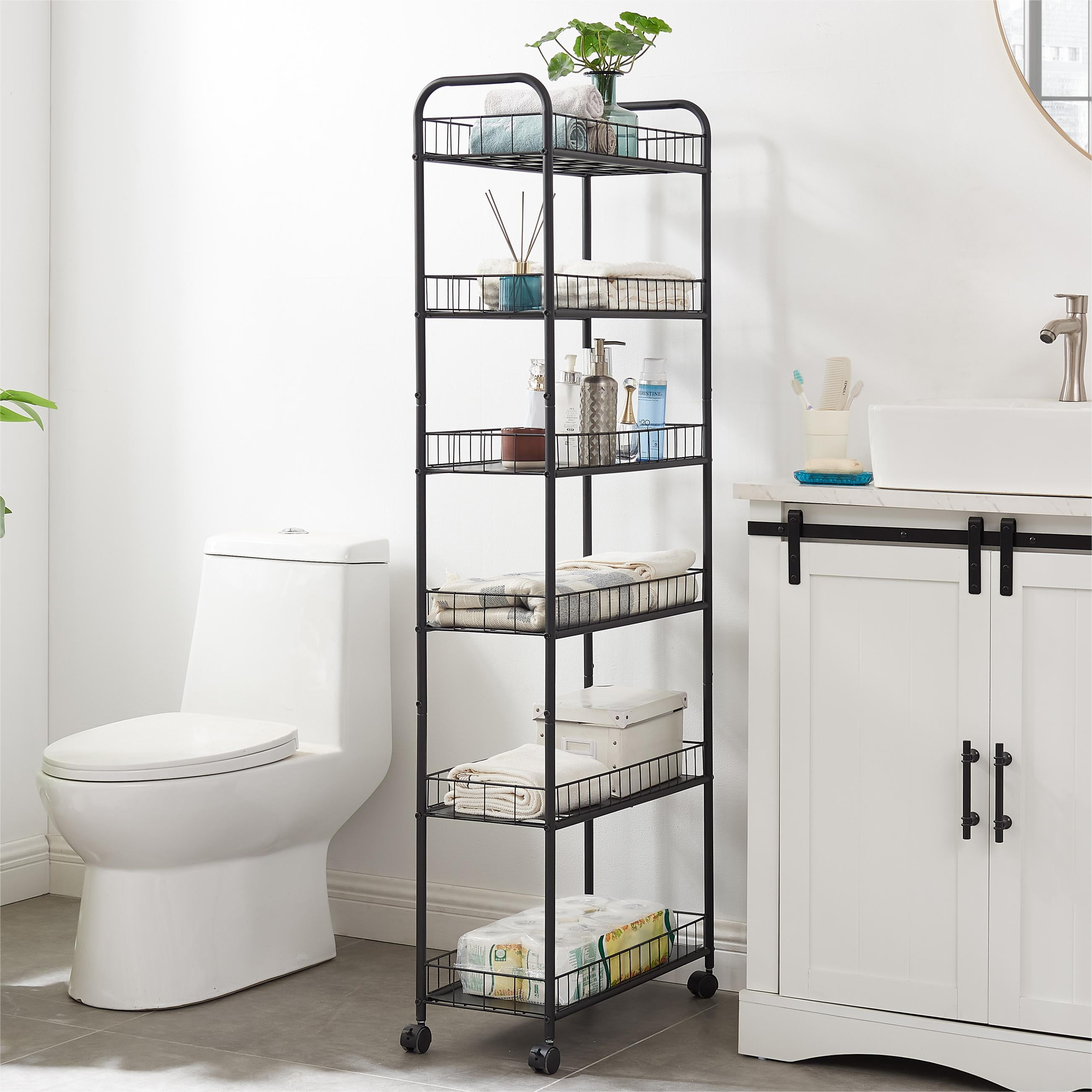 4 easy-glide, durable wheels and ergonomic handle make narrow storage cart easy and convenient to pull in and out from narrow spaces. There are lockable switches for standing on uneven surfaces more stable. This thin rolling cart is durable and stable. You can easily assemble this 6-tier bathroom slim Storage Cart by yourself. Compact web structure is thick and does not shake. The load capacity ensures a stable lifespan, capable of holding heavy items like gallons of bleach and detergent without shelf sagging.