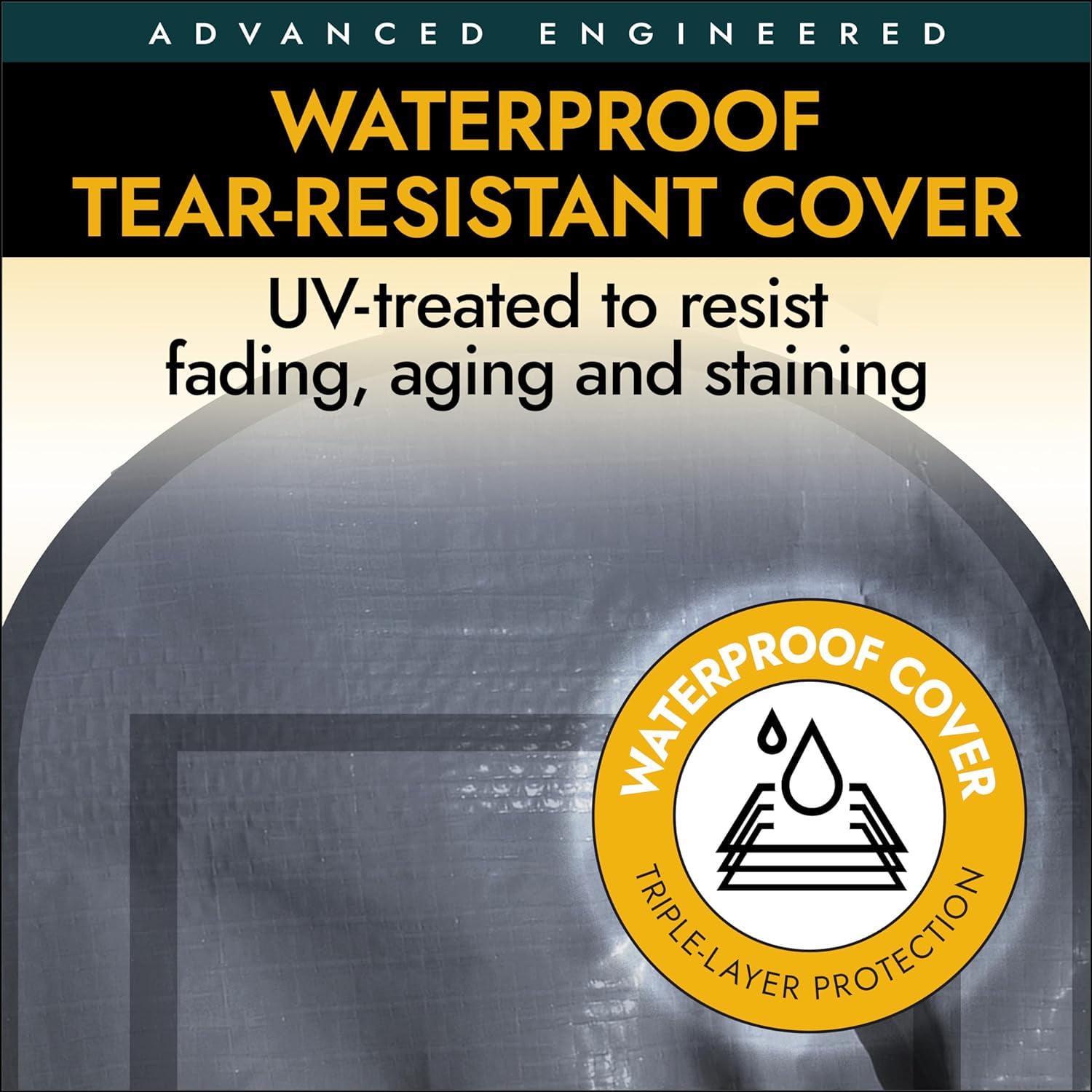 – Advanced engineered triple-layer ripstop polyethylene cover is waterproof, UV-treated inside and out with added fade blockers, anti-aging, antifungal agents resulting in a fabric cover that withstands the elements