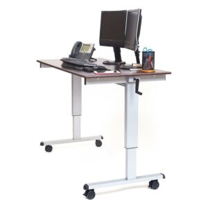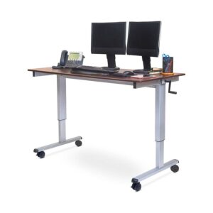 60″ High Speed Crank Adjustable Desk – Silver, Dark Walnut The Luxor high speed crank adjustable standing desk gives users the ability to find that ergonomic balance between sitting and standing throughout the workday. Now available with a high-speed crank operated lift mechanism, the turn-handle crank quickly moves the desk from the lowest to highest positions within seconds without requiring electric power. The generous 59″x 29.5″work surface easily fits dual monitors plus a full-sized keyboard and mouse while the height adjustment range accommodates taller and shorter users. Each desk includes a choice of leveling glides as well as 3″casters, two with locking brakes, allowing for easy maneuverability to suit ever-changing workspace needs. Enjoy the health benefits of standing while increasing focus and productivity with a high-speed crank adjustable desk from Luxor. High speed crank allows for rapid adjustment from sitting to standing. Crank handle quickly raises the desk height between 32.6″and 48.5″(with casters). Crank handle quickly raises the desk height between 29.6″and 45.5″(with glides). Spacious 59″x 29.5″desktop provides plenty of room for multiple monitors. Melamine top with dark walnut finish. Durable steel frame with silver powder coat painted finish. Includes choice of leveling glides and 3″ casters, two with locking brake. Includes all hardware and tools required for assembly. Lift Capacity: 154 lbs. Glides: Furniture Glides. Casters: 3″ Casters.