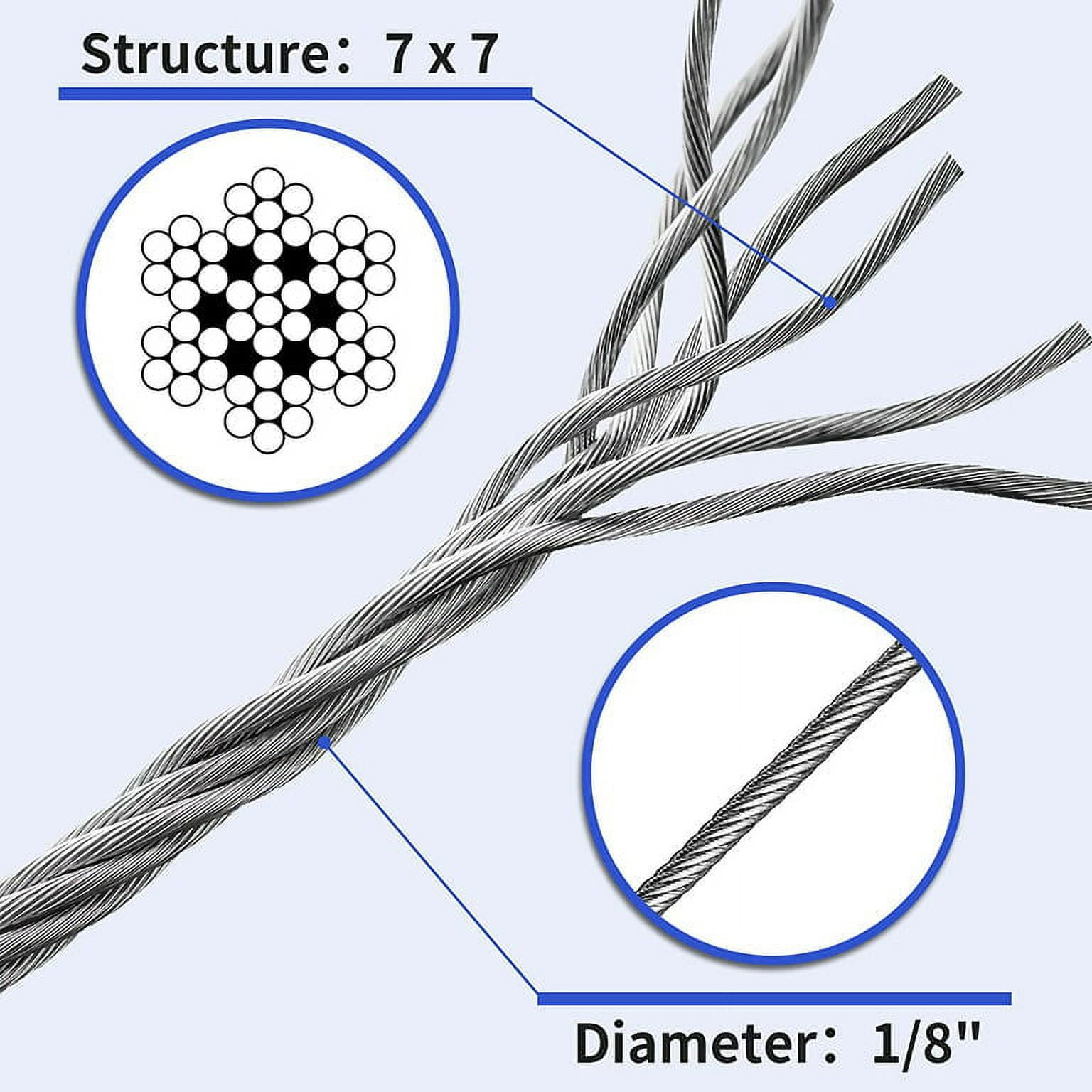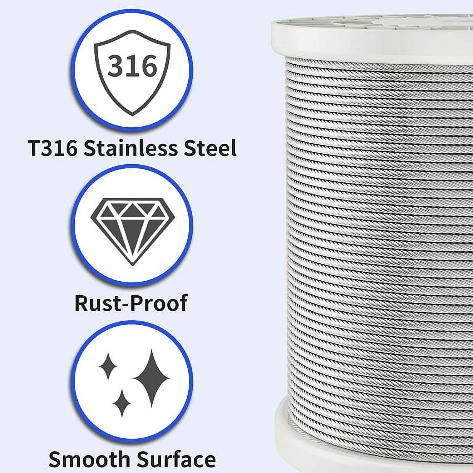 Our stainless steel cable rope is specially designed for cable railing, balustrade DIY, decking, clothesline, winches, and more. As a high-quality T316 stainless steel with 7 x 7 construction, it features 1800lbs bearing capacity, will not unravel after cutting and keep stretches over time. Rustproof, corrosion resistance, smooth surface. Widely used in outdoor and indoor activities, such as clothesline, stair cable railing, garden fence, shipbuilding, etc.