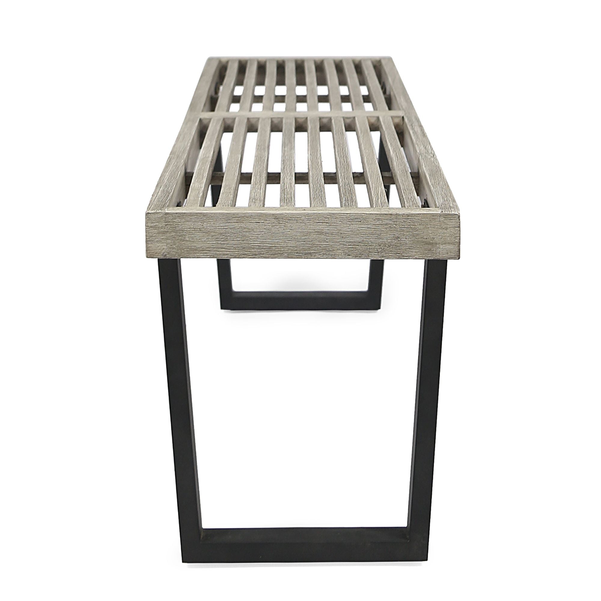 Gray and black contemporary outdoor patio dining bench Finished in light gray set atop two closed pairs of legs Able to seat three comfortably with room to spare Comes with handcrafted details; some assembly required 18.5 inches high by 61.75 inches wide by 14.5 inches deep