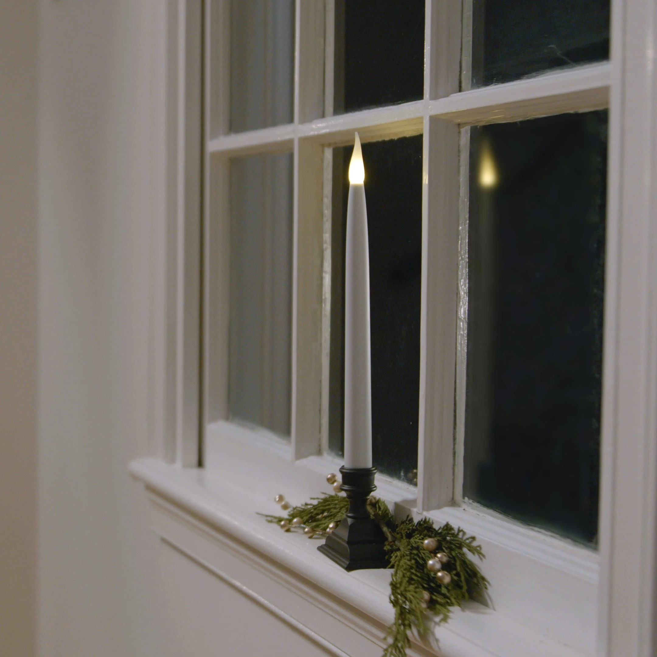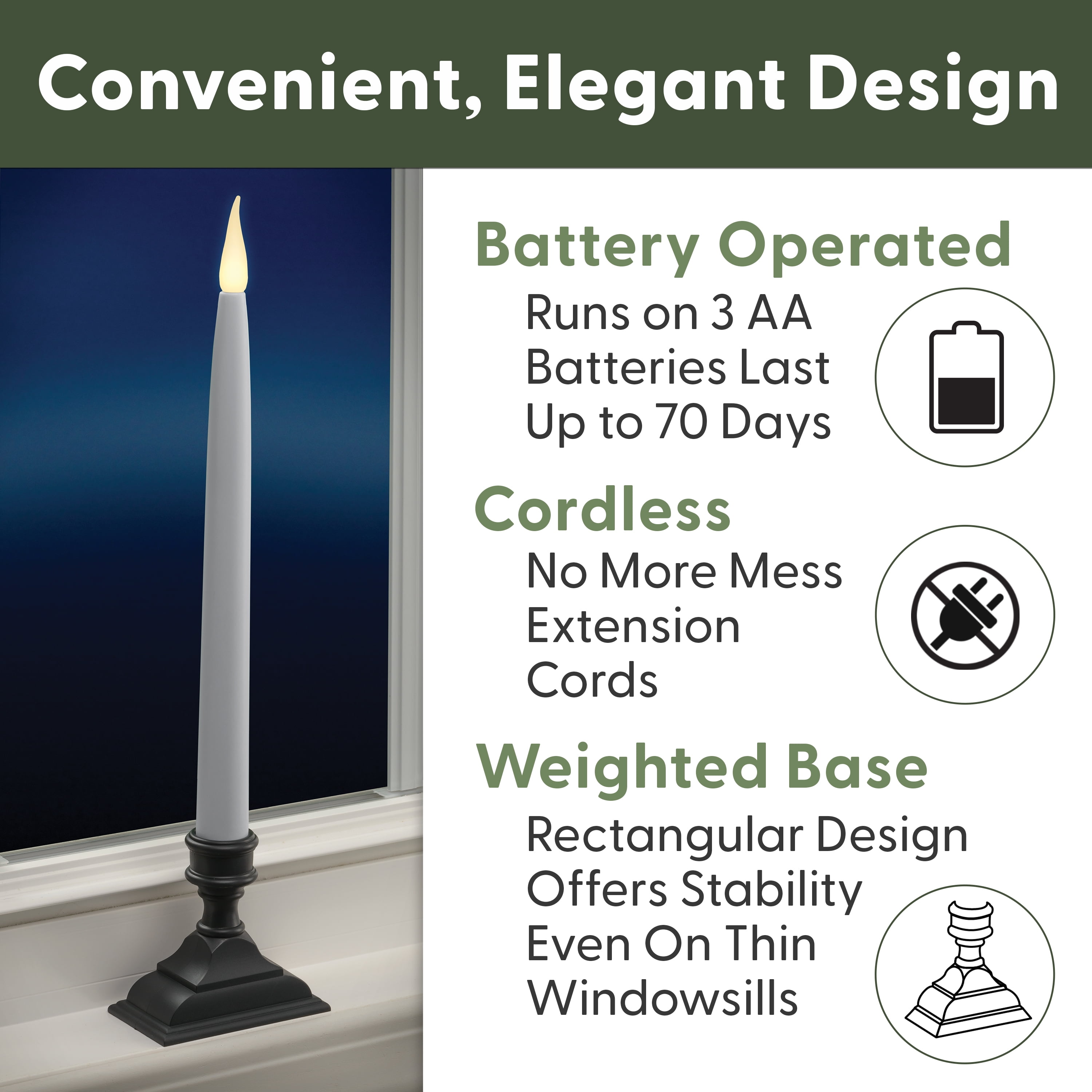 Welcome visitors and warm passers-by with the elegant glow of these window candles. The tall, tapered design also works well on dining room tables, fireplace mantles, and other locations throughout the home. What makes these candles unique is the patented warm white flame. The light features a soft silicone tip that is housed by 2 LEDs. One light at the base stays on constantly. The other light at the top of the flame runs through a series of motions to create a flickering flame that isn’t overly jumpy like competitor candles. To operate, simply insert 3 batteries into the candlestick. Once the screw cap has been tightened down on the batteries it will start the timer. The candle will stay on for 6 hours and then turn off for 18 hours. The cycle will repeat every 24 hours. Last approximately 70 days on 1 set of batteries. The bulb is non-replaceable but should last 5-10 years with seasonal use. The product is backed by a 3-year warranty. The rest of the candle is constructed of durable plastic to withstand accidental tipping over or dropping of the candles. Candle measures: 13.25″ high, 1.75″ deep and 3.125″ wide. Candlestick diameter measures 7/8″ at the bottom and narrows to 7/16″ at the top.