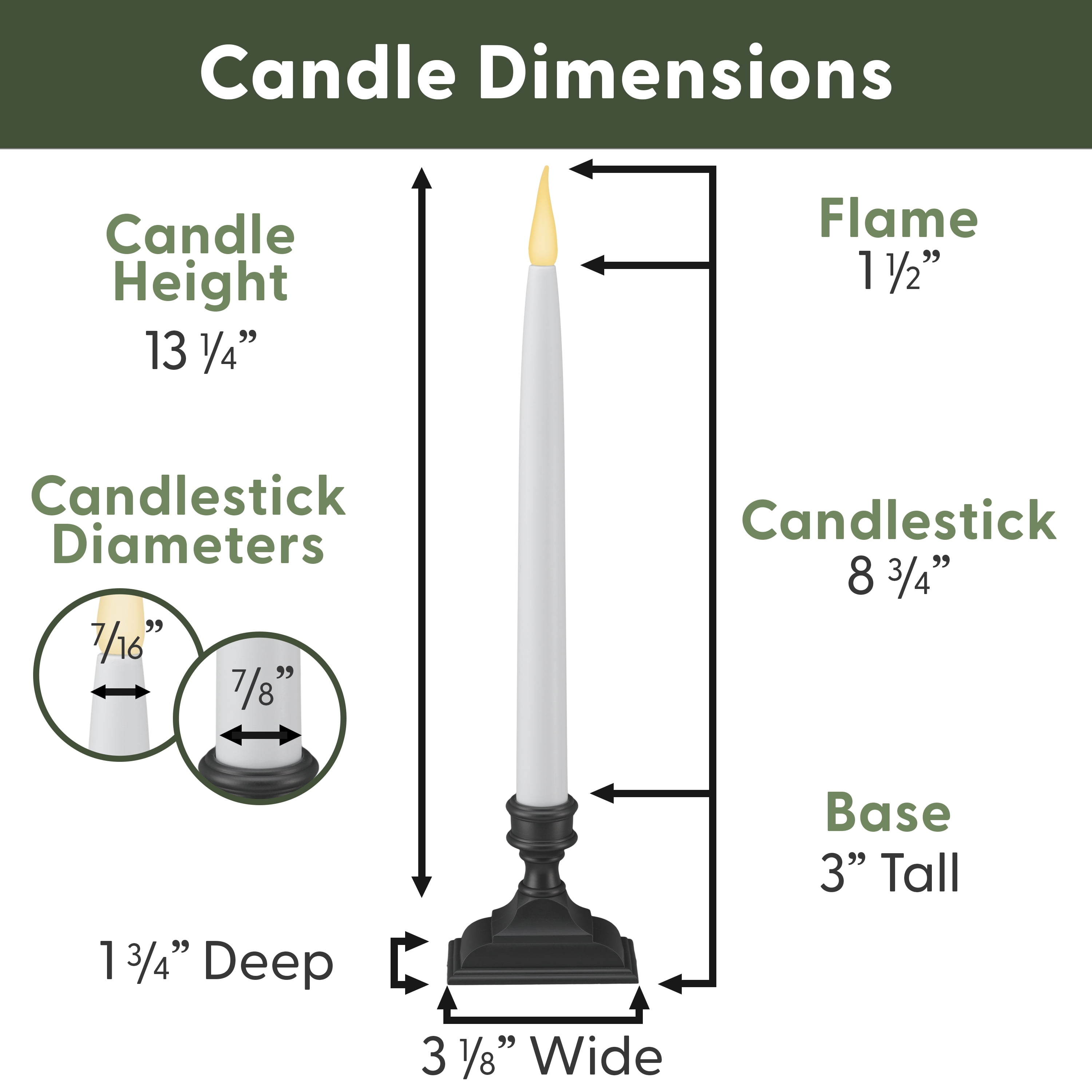 Patented warm white, dual-LED flame provides a realistic flickering flame. Automatic Timer. On for 6 hours, off for 18 hours. Repeats daily. Battery operated. Requires 3 AA batteries (not included), lasts 70 days on one set of batteries. A weighted base provides stability to prevent tipping from your windowsills. Measures: 13 1/4” tall, 3 1/8” wide, 1 ¾” deep. Candlestick diameter: 7/8”