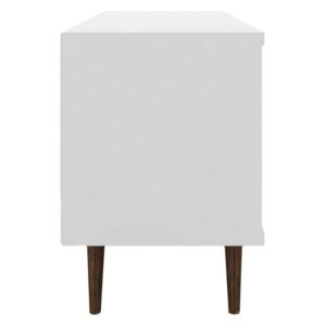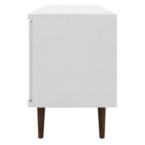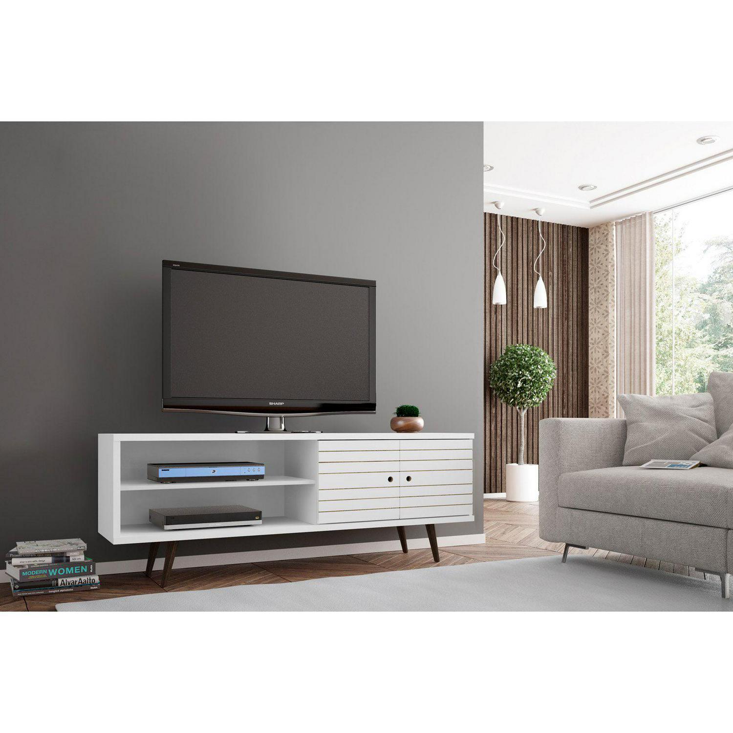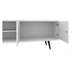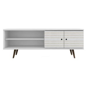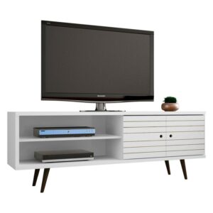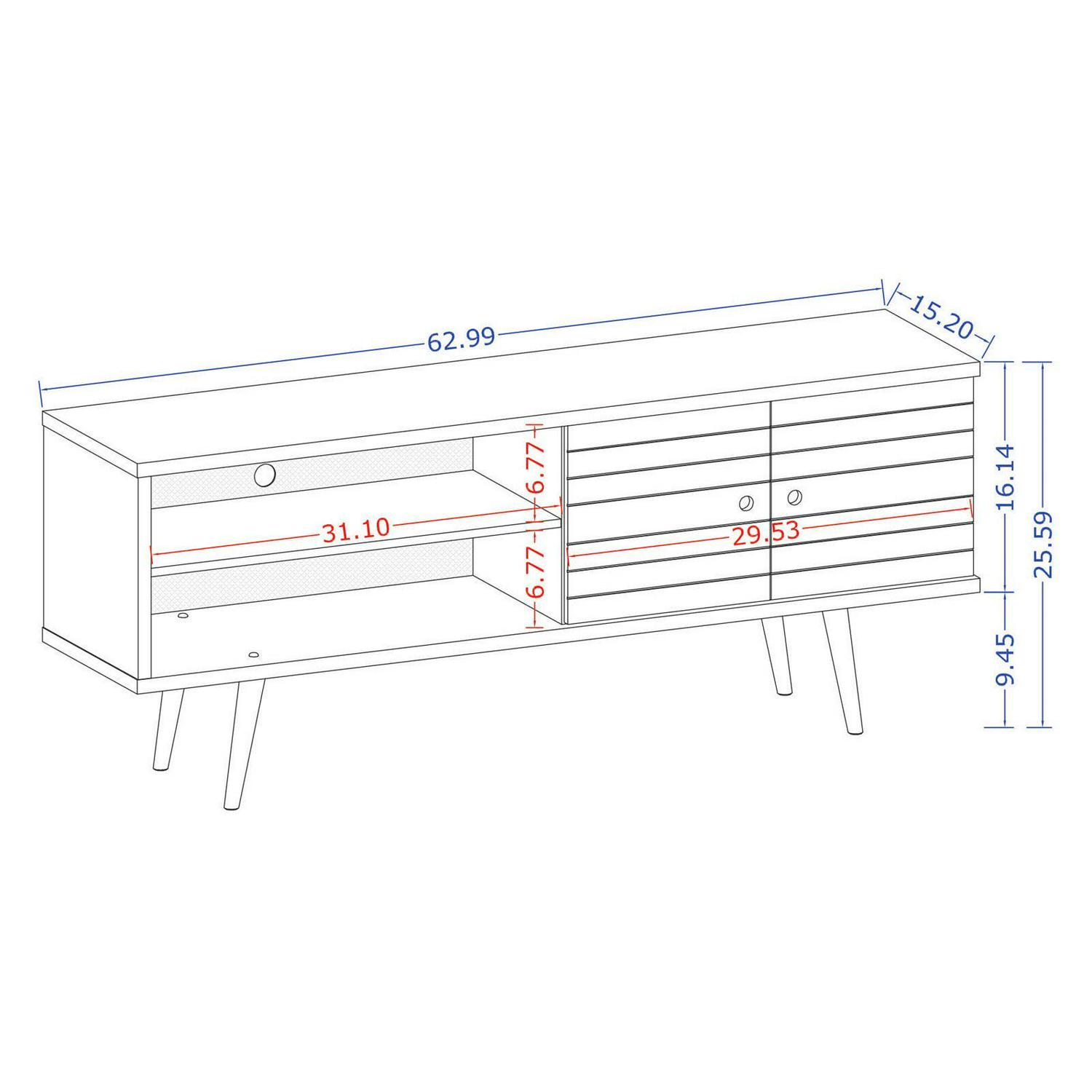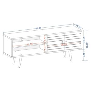 62.99″ Mid Century – Modern TV Stand with 3 Shelves & 2 Doors with Solid Wood Legs, Brown, Yellow The Liberty 62.99 Mid-Century Modern TV Stand is a fine, beautifully crafted, functional unit. Featuring two open shelves, and one large concealed compartment perfect for stashing dvds, board games, electronics, and media accessories, this entertainment center is the ultimate gathering place and will create a statement in any space. Artful grooves mix well with any decor and splayed wooden legs add character and ease for moving. Available in white, white and rustic brown, white and aqua blue, white and yellow, rustic brown, rustic brown and white, and rustic brown and yellow.