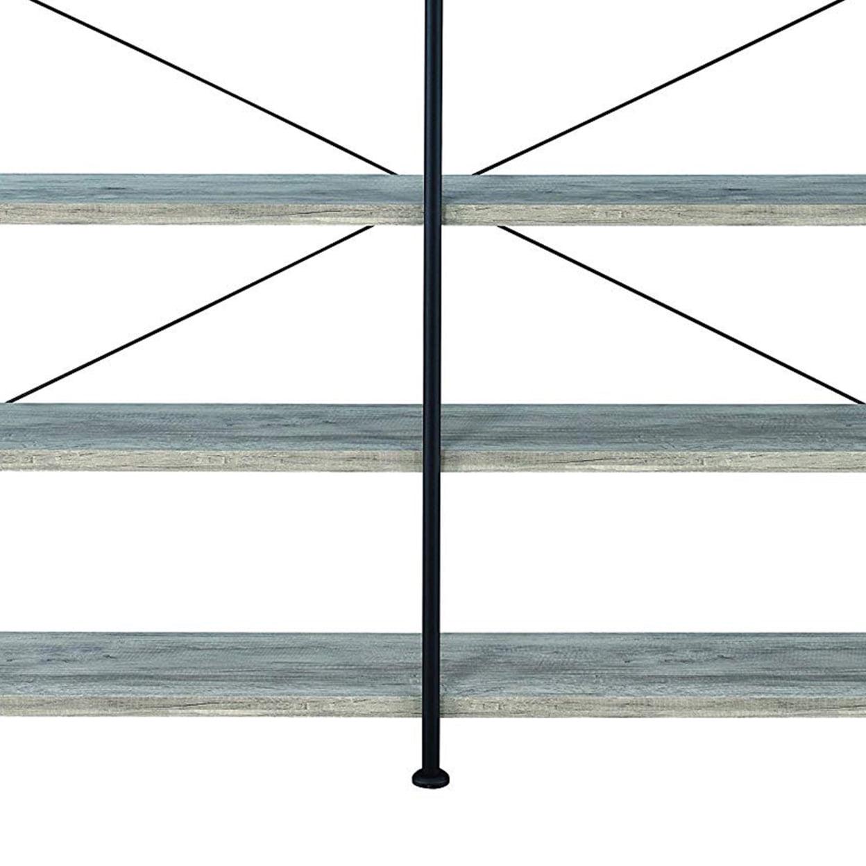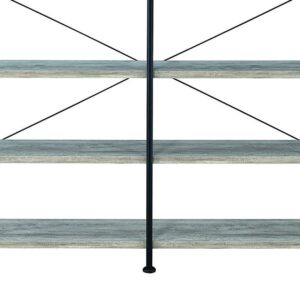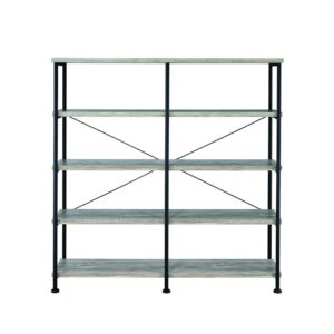 A unique blend of style and sophistication, this handcrafted bookshelf makes a perfect fit for your living room, foyer, office, or study space. With its four-tier shelving space to keep your books organized, it also offers plenty of space to showcase your hand-curated decorations, vases, showpieces, and more. Crafted from premium quality particleboard and a lightweight yet sturdy iron frame, the gray shelves complement the black powder-coated frame. With an X-shaped bar accents on the back, it is equipped with floor protectors to prevent abrasions and scratches.