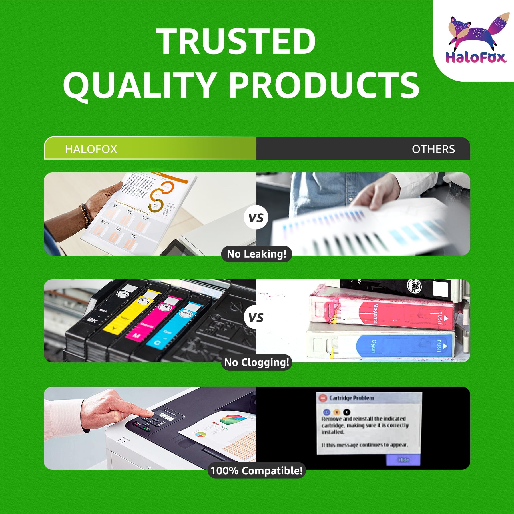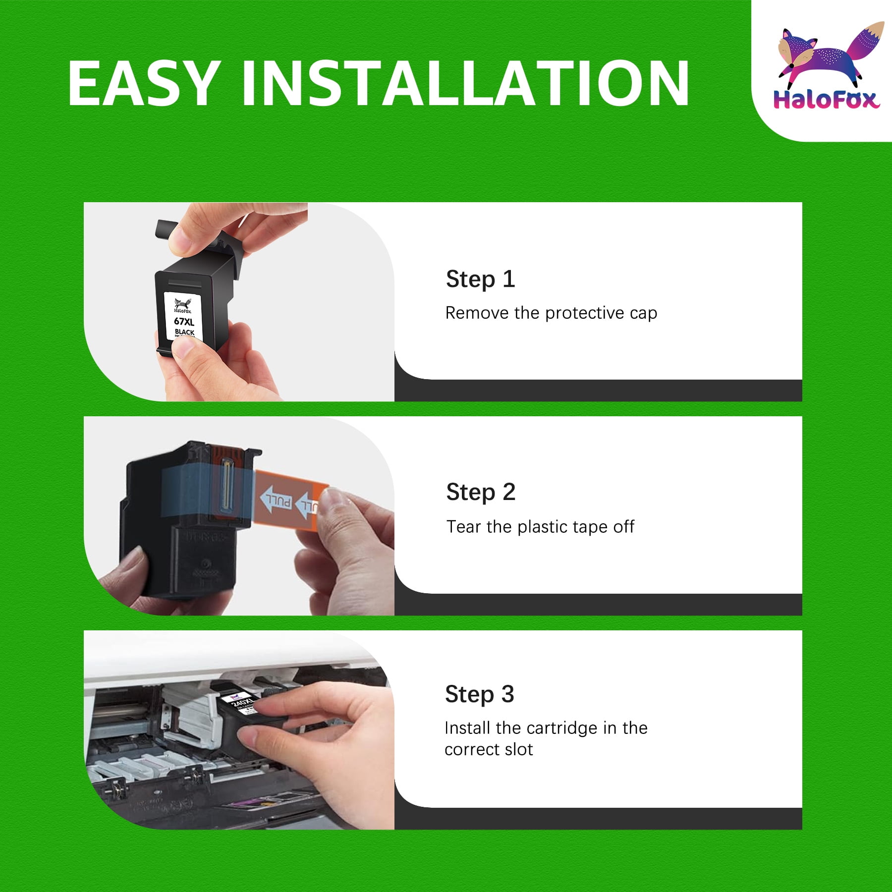 🦊𝑯𝒂𝒍𝒐𝒇𝒐𝒙 𝒉𝒊𝒈𝒉 𝒚𝒊𝒆𝒍𝒅 67𝒙𝒍 𝒊𝒏𝒌 𝒄𝒐𝒎𝒑𝒂𝒕𝒊𝒃𝒍𝒆 𝒇𝒐𝒓 𝒉𝒑 67 𝒊𝒏𝒌 𝒄𝒂𝒓𝒕𝒓𝒊𝒅𝒈𝒆𝒔, 𝒃𝒓𝒊𝒏𝒈𝒔 𝒉𝒊𝒈𝒉𝒆𝒓 𝒊𝒏𝒌 𝒄𝒂𝒑𝒂𝒄𝒊𝒕𝒚 𝒂𝒏𝒅 𝒎𝒐𝒓𝒆 𝒑𝒓𝒊𝒏𝒕 𝒑𝒂𝒈𝒆𝒔. 📦𝑷𝒂𝒄𝒌𝒂𝒈𝒆 𝑰𝒏𝒄𝒍𝒖𝒅𝒆: 1 x 67 xl black ink cartridge, 🗐𝑨𝒗𝒂𝒊𝒍𝒂𝒃𝒍𝒆 𝑷𝒂𝒈𝒆 𝒀𝒊𝒆𝒍𝒅: 📃750 pages per 67xl black ink cartridge 🖨𝑪𝒐𝒎𝒑𝒂𝒕𝒊𝒃𝒍𝒆 𝑷𝒓𝒊𝒏𝒕𝒆𝒓𝒔: 🖨️HP DeskJet 1255D / 2700series: 2700e / 2710 / 2710e / 2720 / 2720e / 2721 / 2721e / 2722 / 2722e 2723 / 2723e / 2724 / 2725 / 2732 / 2734e / 2742e / 2752 / 2752e / 2755 / 2755e 🖨️HP Deskjet 4100 Series: 4100 / 4100e / 4110 / 4110e / 4120 / 4120e / 4121 / 4121e / 4122e / 4123 / 4123e / 4130 4130e / 4132e / 4133e / 4152 / 4152e / 4155e / 4158 / 4158e DeskJet Plus 4122 / 4132 / 4155 🖨️HHP Envy 6000 Series: 6000 / 6010 / 6010e / 6020 / 6020e / 6022 / 6022e / 6030 / 6030e / 6032 6032e / 6034 / 6034e / 6050 / 6050e / 6052 / 6052e / 6055 / 6055e / 6075 / 6075e 🖨️HP Envy Pro 6400 Series: 6400 / 6400e / 6420 / 6420e / 6422 / 6422e / 6430 / 6430e / 6432 / 6432e 6450e / 6452 / 6452e / 6455e / 6458e / 6475e / ENVY Pro 6455 / 6458 / 6475 🖨️HP DeskJet 1255D: DeskJet / 1210 / 1212 / 1215 / 1255 / 2300 / 2330 / 2331 / 2332 / 2333 / 2700 💜𝑰𝒏𝒔𝒕𝒂𝒍𝒍𝒂𝒕𝒊𝒐𝒏 𝒊𝒏𝒔𝒕𝒓𝒖𝒄𝒕𝒊𝒐𝒏𝒔: Step 1: Remove plastic protective cap. Step 2: Remove the plastic protective tape. Step 3: Insert cartride into its color-coded slot,making sure it is securely seated. Note: DO NOT Touch and Remove the chip & DO NOT Touch the ink nozzles. 🦊𝑾𝑯𝒀 𝑼𝑺: More and more buyers think HP 67 ink cartridge is too expensive, they need cheaper 67xl ink cartridges with good quality. And We produce high-standard ink 67 through our own factory and sell them directly to customers, bringing high-quality products to customers with the lowest factory sales price.