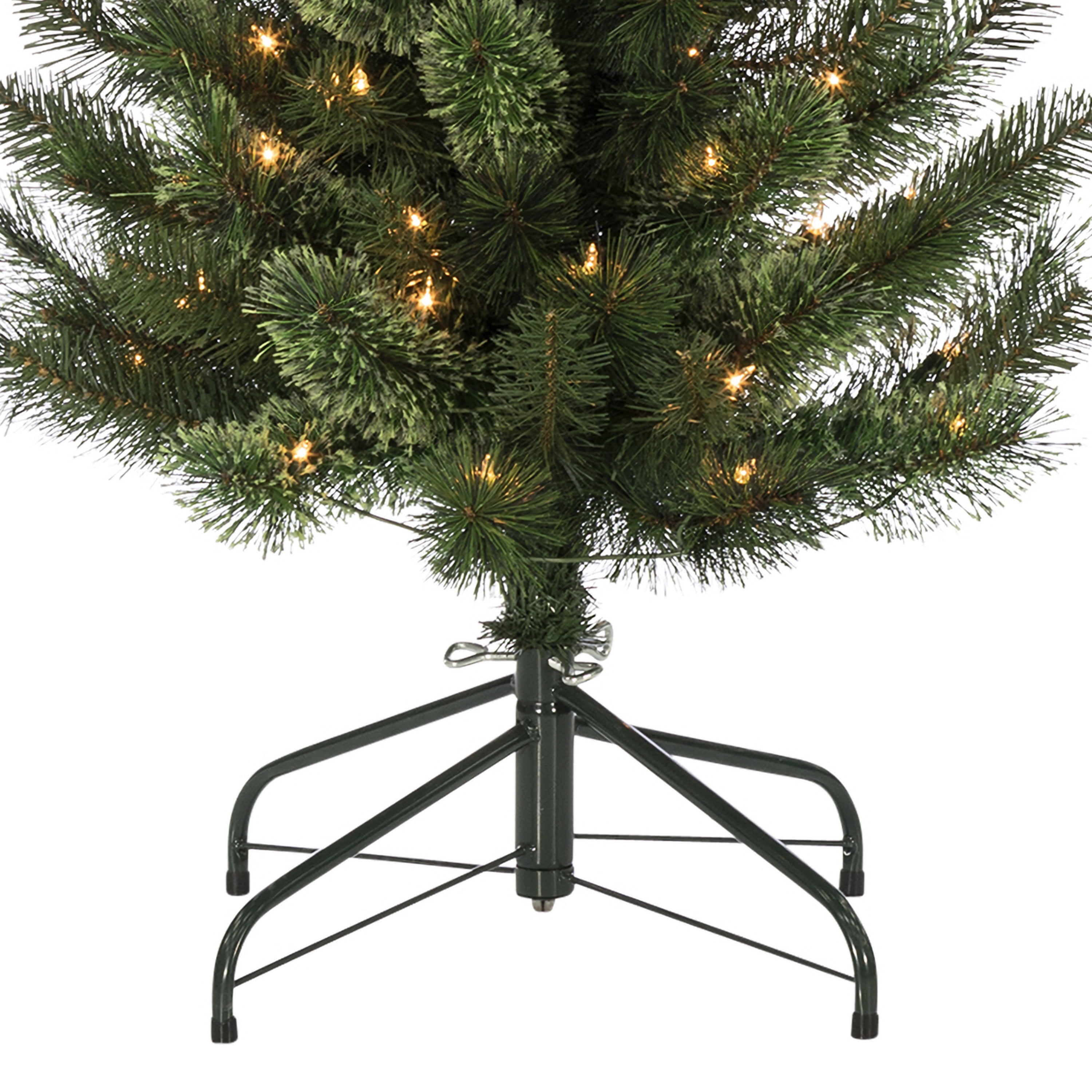 Assembled Tree Dimensions: 27InL by 27InW by 90InH Pre-Strung with 200 Clear Incandescent Lights; Replacement Bulbs Included This tree has 350 branch tips to show off your favorite ornaments and decorations Includes 22-Inch Diameter Metal Four Prong Stand for Stability in any Environment Operates by Green 72″ Lead Cord Allowing Versatility in Placement Tree is UL-Listed and Fire Resistant for Safety.