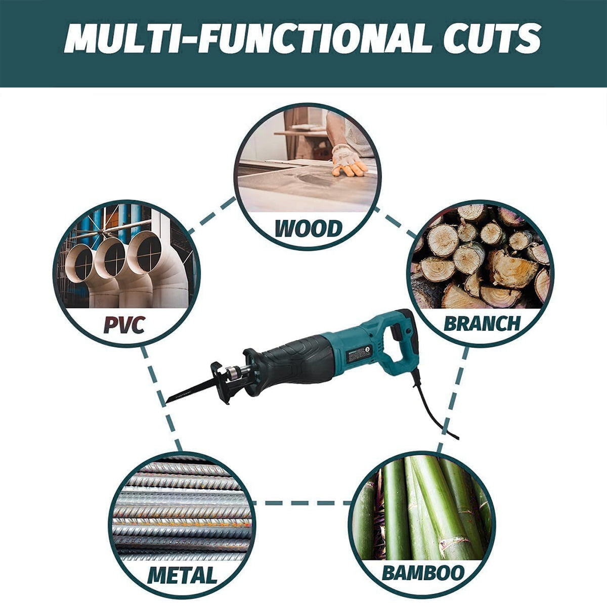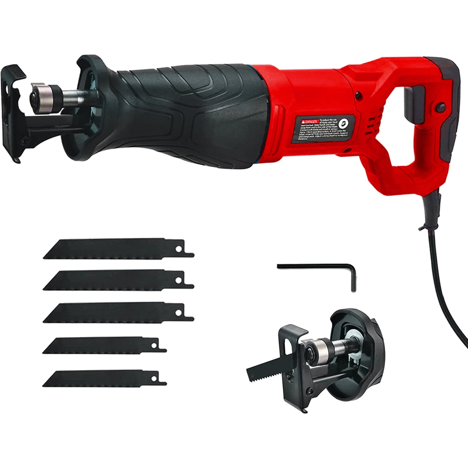 Package includes 1 reciprocating saw, 3 wood saw blades, 2 metal saw blades, 1 hex key, and 2 carbon brushes Material: PA+CU+FE Power: 900W 7.5A Voltage: US: 120V