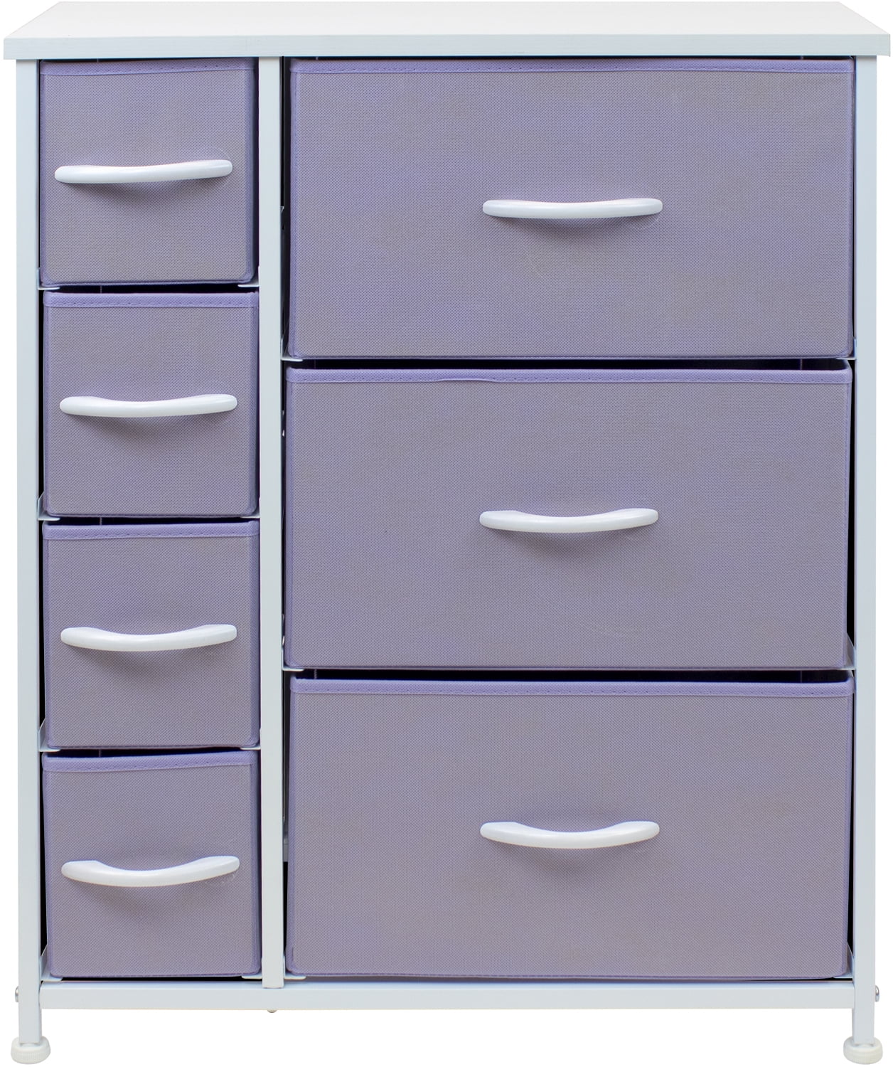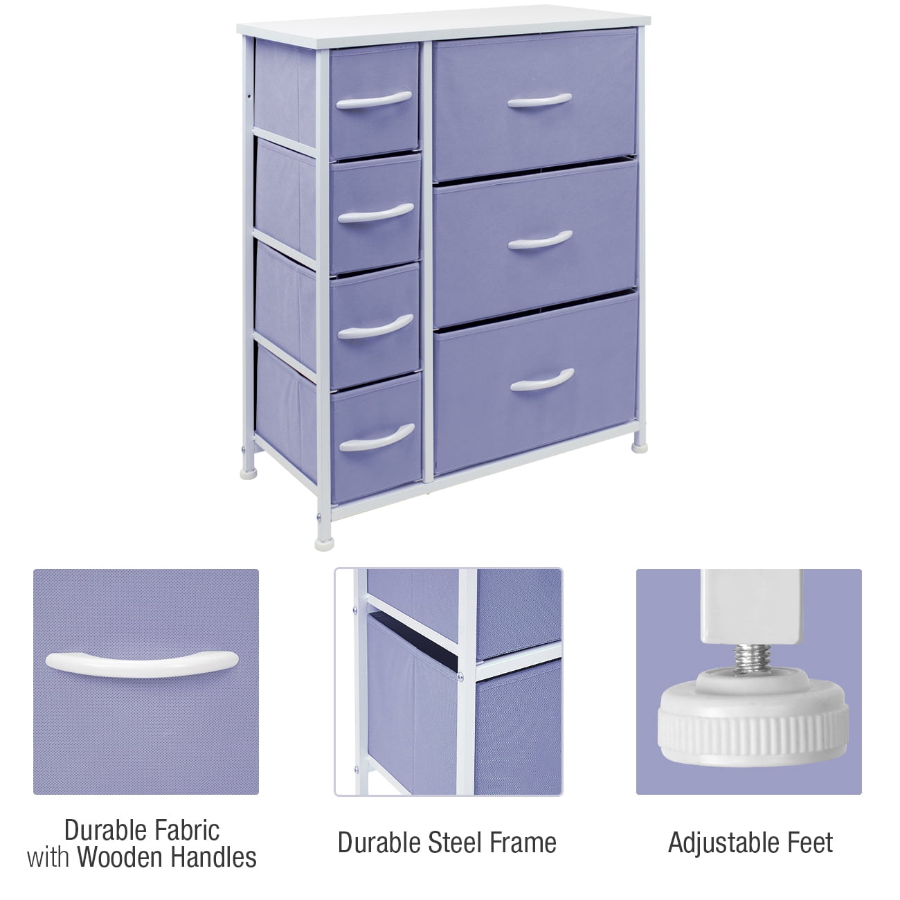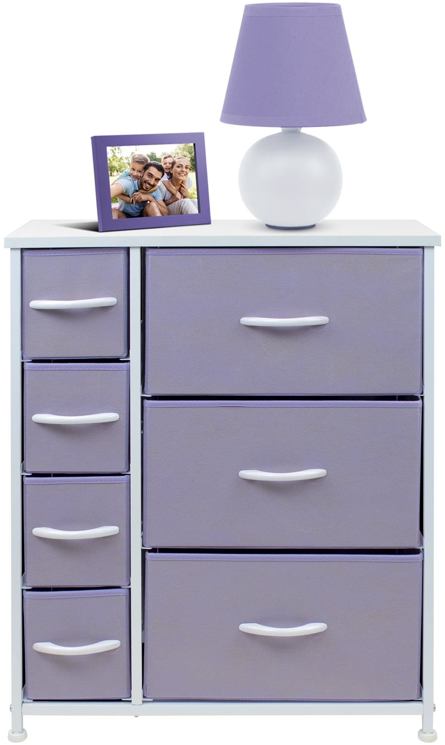 7-DRAWER DRESSER (PURPLE) — Style meets function with this dresser chest, complete with a wood surface and colorful storage drawers — Pairs beautifully with the Sorbus Foldable Furniture Collection DISPLAY & DE-CLUTTER — Wood top provides hard surface for displaying books, lamps, alarm clocks, electronics, and more — Drawers great for storing baby and kid clothes, blankets, linens, toys, plushies, accessories, knitting supplies, and household clutter KID FRIENDLY DESIGN — Made with strong steel frame and durable MDF wood top with smooth finish — Drawers made of breathable, non-woven fabric — Wipe clean — Minimal assembly required — Hardware and instructions INCLUDED — Measures approximately 25” L x 11.87” W x 28.75” H