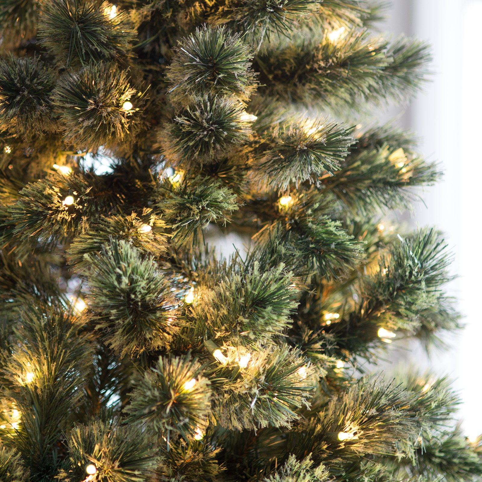 Sterling Unpack your tree skirt for this wonderfully full, awe-inspiring pre-lit artificial Hard Needle Deluxe Cashmere Pine Christmas tree with a natural look so realistic it could fool your gardener! At a towering 7-foot height with that classic, lightly iced look and a shapely base diameter of 45-inches, this stunning Pine comes with 550 clear incandescent bulbs to add a warm, hearth-and-home glow, but without the mess and fire dangers of a live-cut tree. Safe, fire-resistant needles provide an amazing 608 Pine branch tips to put your favorite ornaments on display. It’s an eye-catching centerpiece providing the cheer to make your holidays a lasting memory. Comes with a 22-inch diameter, sturdy four-prong stand for safety and stability.
