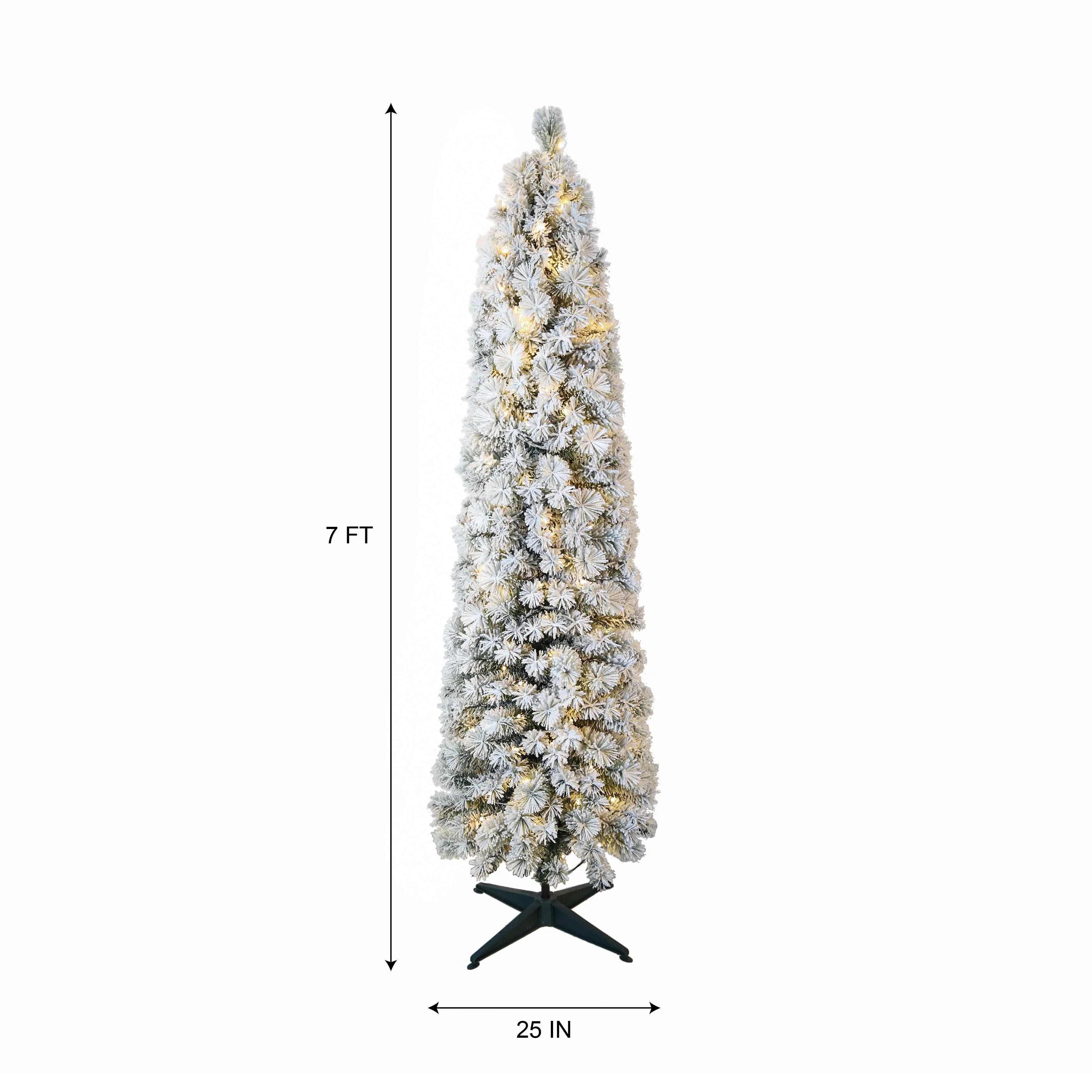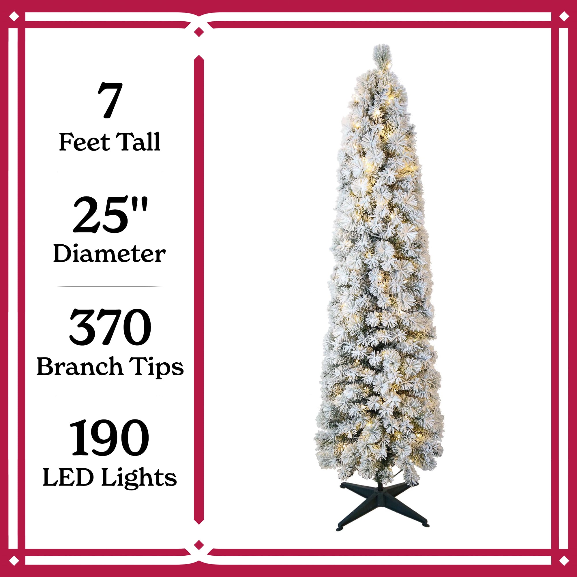 This flocked Colorado tree is 7 ft tall and 25 in wide, featuring with 266 PVC tips and 114 Hardneedle tips. Decorated with 190 warm white LED lights that make the tree look warm and wonderful. This tree’s beautiful flocking and slim shape make it perfect to fit in any space. It is also very easy to set up. It will add a special touch of holiday glamour to your home.
