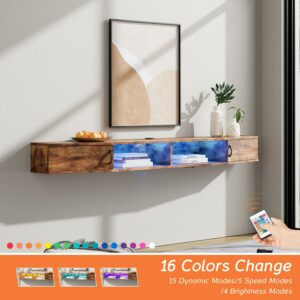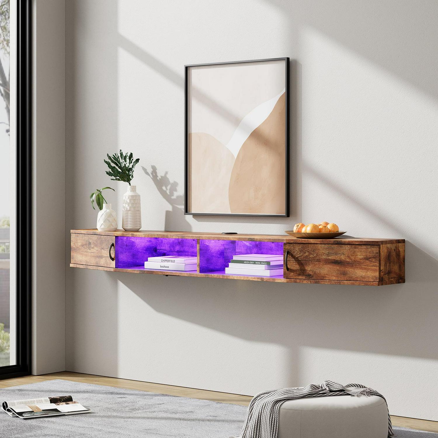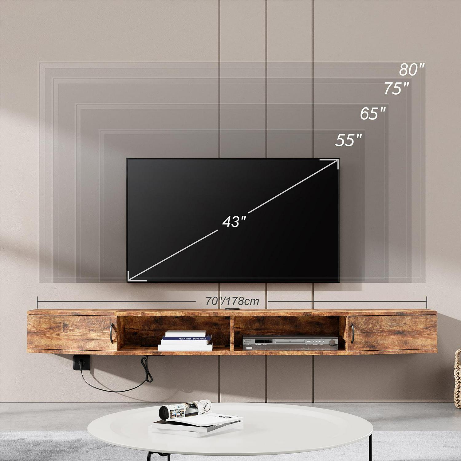 70 Inch Floating TV Stand for TVs up to 80 inch, LED Wall Mounted Entertainment Center with Storage Cabinet and Charging Station, Rustic Brown