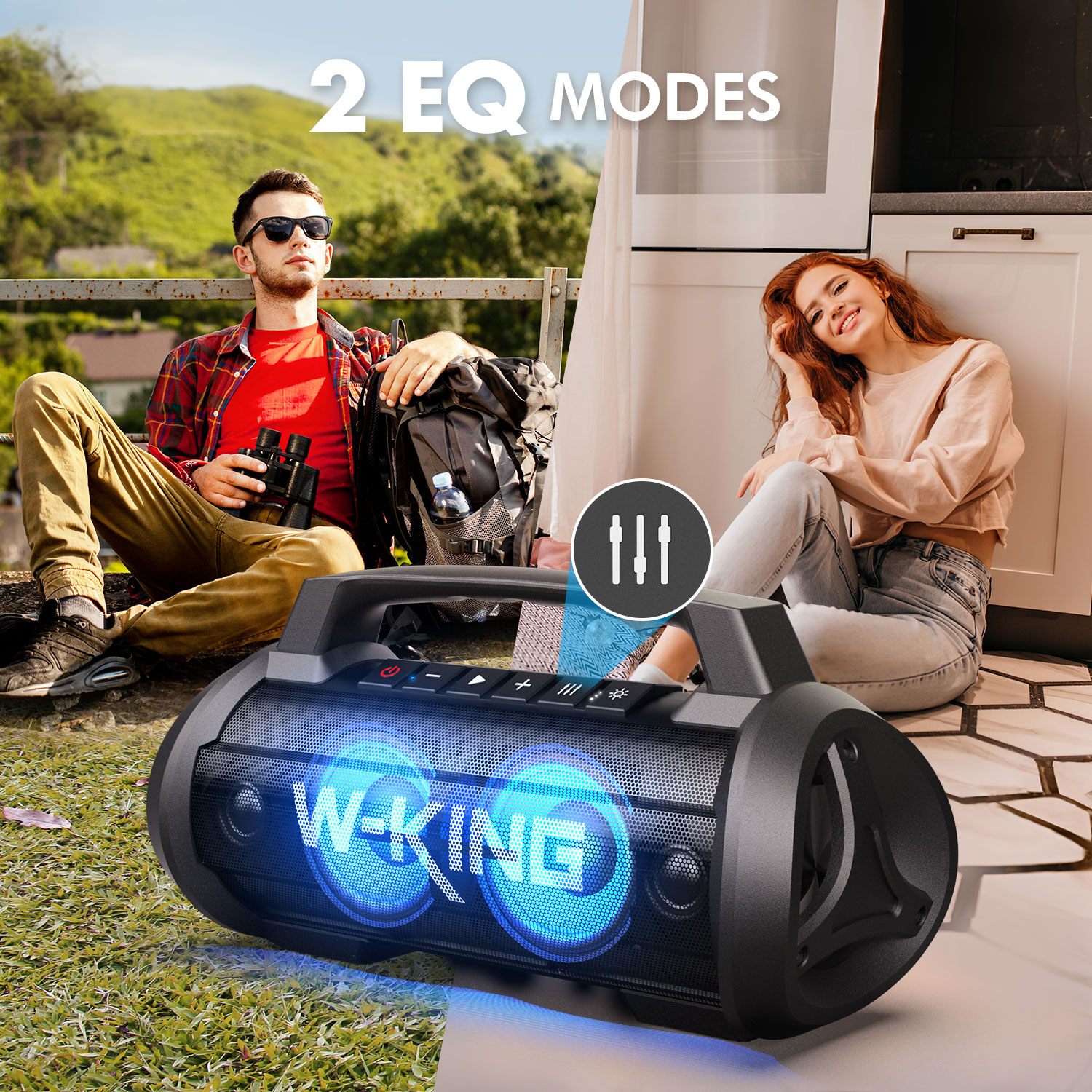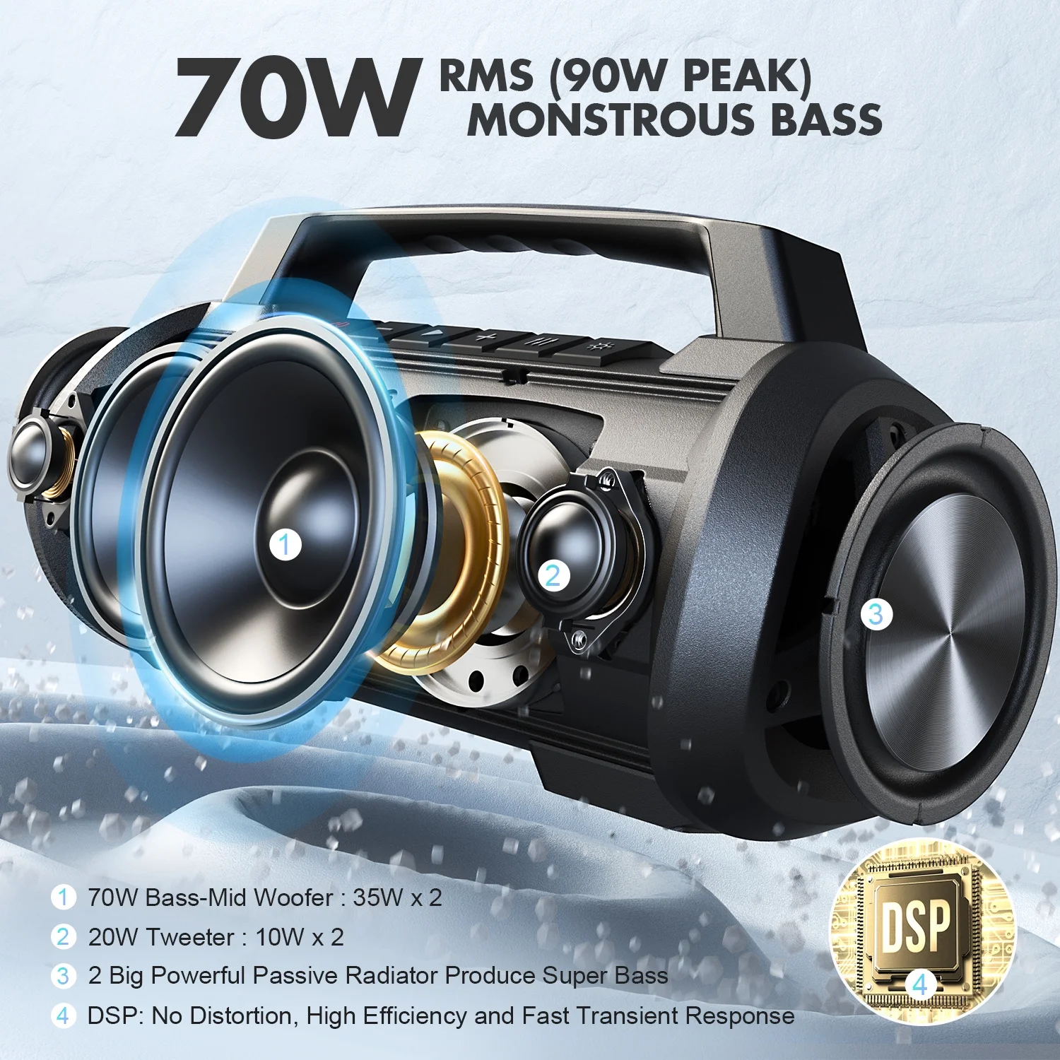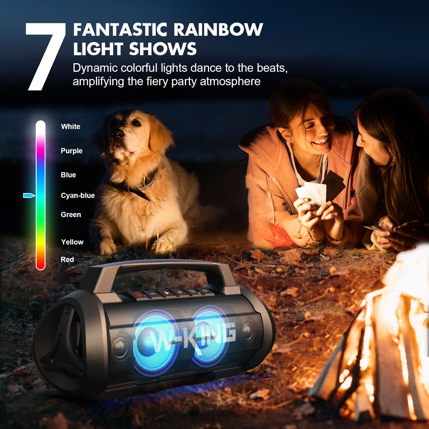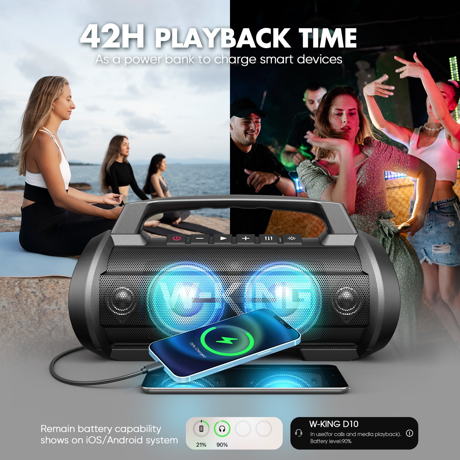 The super powerful party speaker is a 70 W punchy bass beast. The latest state-of-the-art subwoofers, tweeters and passive radiators bring you deep bass and HD sound. The 7-color party light walks in your eyes and catches every rhythm of your heart, let us be in close. With the 42H Playtimes and IPX6 waterproof and shockproof, this speaker can go where you go.