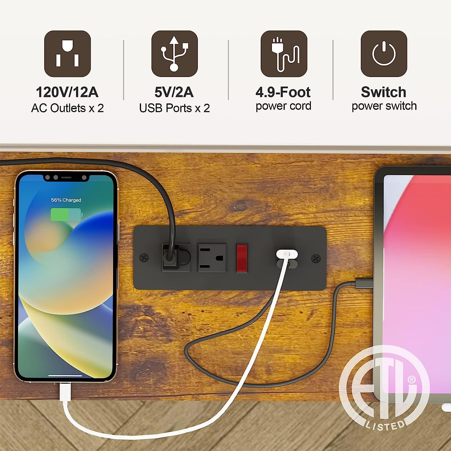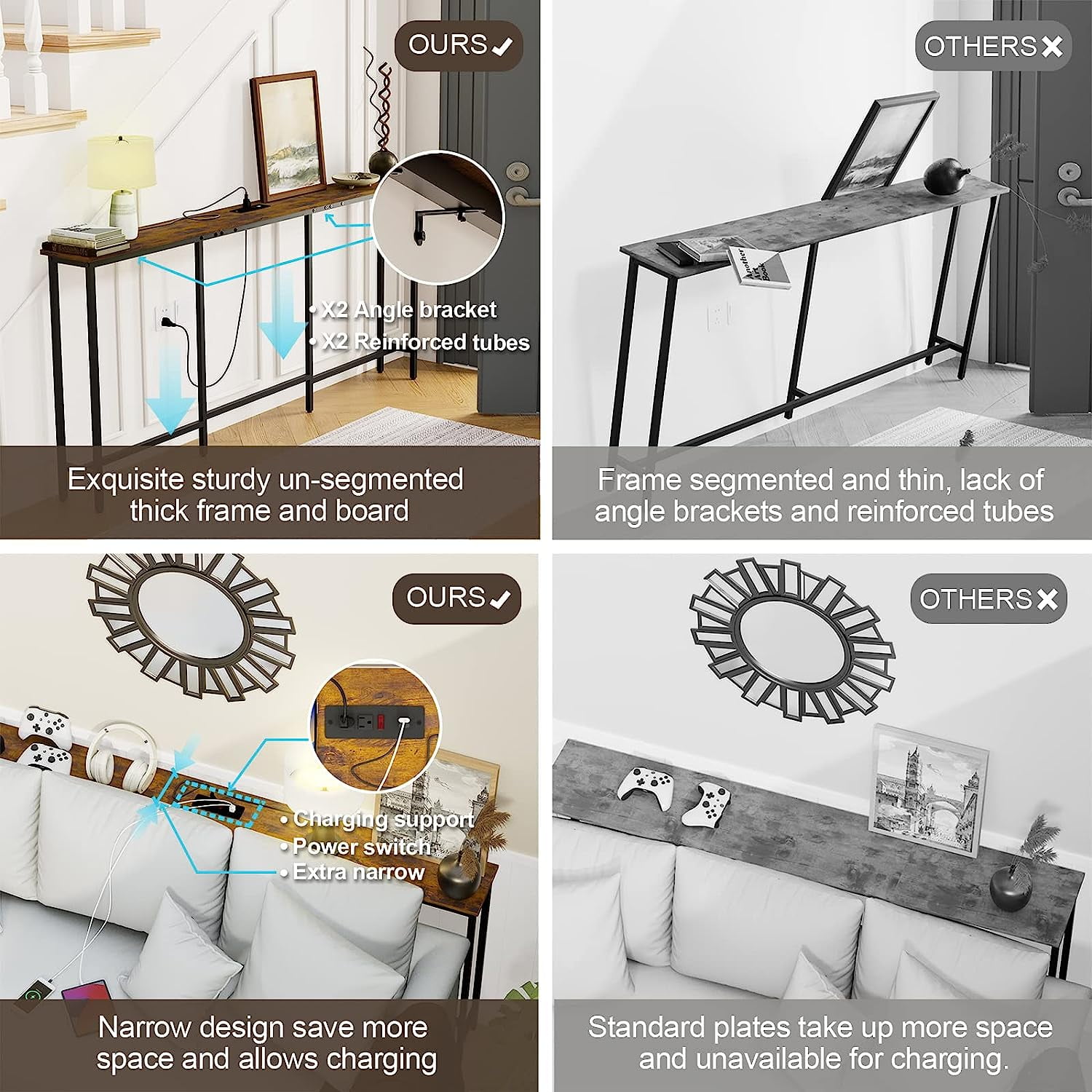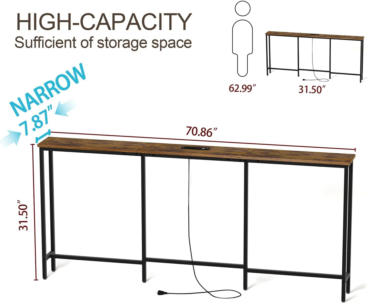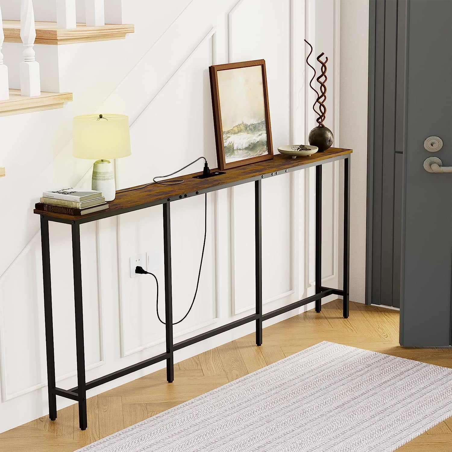 Narrow Sofa Table Behind Couch Table Console Table With Charging Station Extra Long & Narrow Small Size Big Benefits The sofa table with 2 standard 120VAC outlets, 2 USB ports, and 4.9 feet long power cord to rescue the socket behind the sofa or other narrow places and provide storage space to place items, and charging the lamp/computer/laptop/mobile phone. Outlets with USB Ports The sofa table with 2 standard 120VAC outlets, 2 USB ports and 4.9 feet long power cord to rescue the socket behind the sofa or other narrow places and provide storage space to meet the needs of placing items, and charging the lamp/computer/laptop/mobile phone. Reliable Construction Stable & Sturdy Sturdy metal frame, reinforced tubes and 4 adjustable feet pegs to stop it from wobbling, quality particleboard and sturdy iron structure come together to make it work perfectly. The perfect combination of raw materials that meet EPA TSCA Title VI and a sturdy metal frame. Package Contents: 1 x Extra Long Narrow Console Table 1 x Charging Station 2 x Angle Bracket 1 x Assembly Kit 1 x Instructions Specifications Product Size: 70.9″L x 7.9″W x 31.5″H (180 x 20 x 80 cm) Color: Rustic Dark Brown Material: MDF & Steel Frame