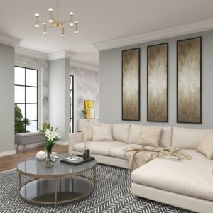 – This elegant contemporary wall art features an acrylic painting in light gold, dark gold, soft beige, creme, white, and metallic silver finishes