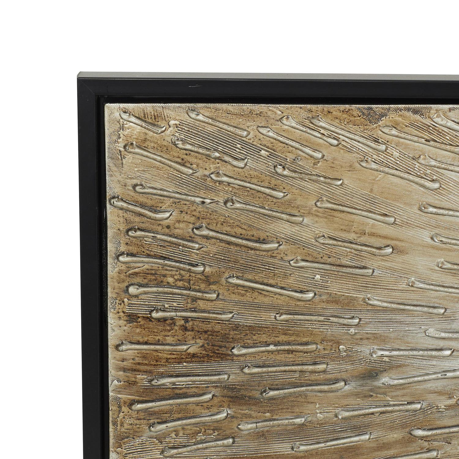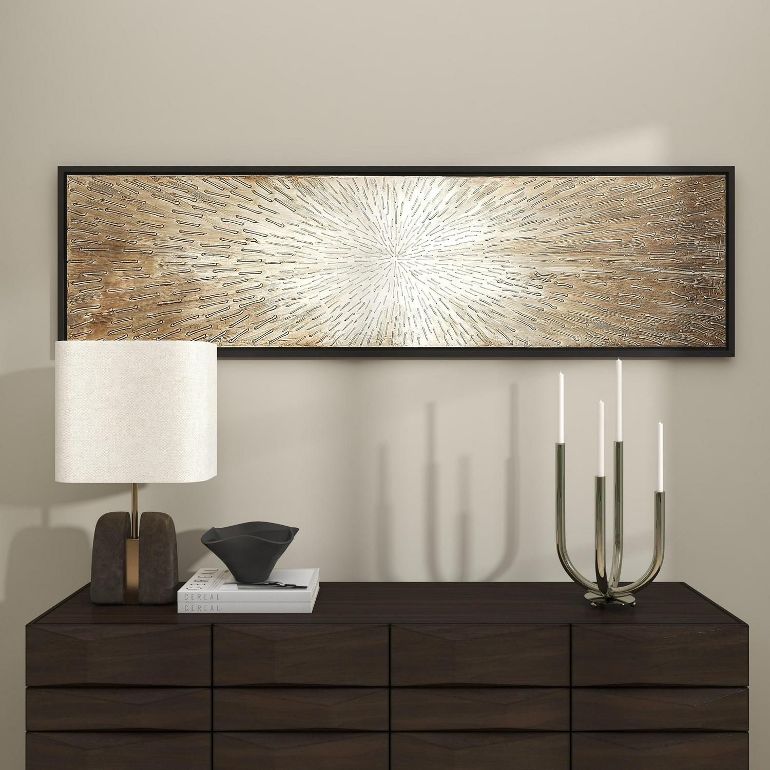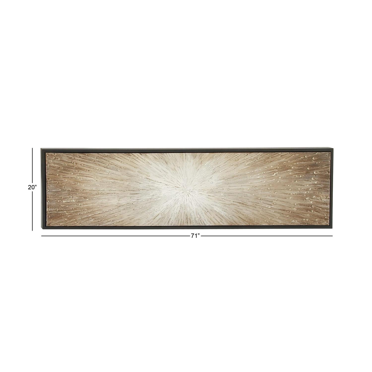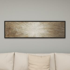 71″ x 20″ Radial Starburst Framed Wall Art with Black Frame, by DecMode is a unique addition to your stylish home. This wall art exude natural beauty and sophistication in both color and composition. Showcase your personality and turn your walls into an art gallery with this impressive wall art. This thin rectangle-shaped canvas wall painting is ideal for contemporary, eclectic, and modern-themed living spaces. This item ships in 1 carton. Can be hung horizontally using the sawtooths on the back; nails and screws not included. Suitable for indoor use only. This item ships fully assembled in one piece. This is a single brown colored canvas wall art. Glam style.