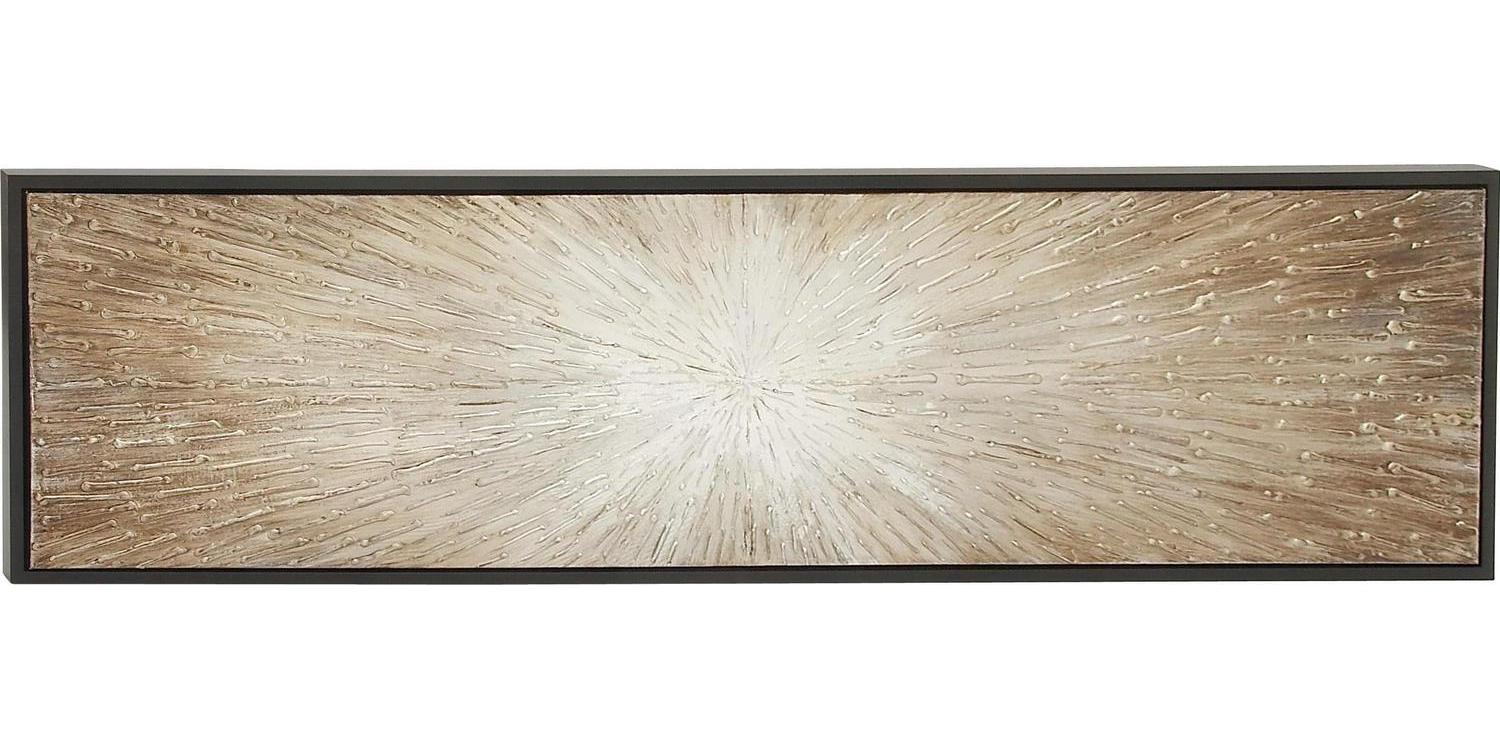 – This contemporary brown and gold wall painting features a rectangular-framed canvas and a starburst pattern in acrylic and metallic finishes