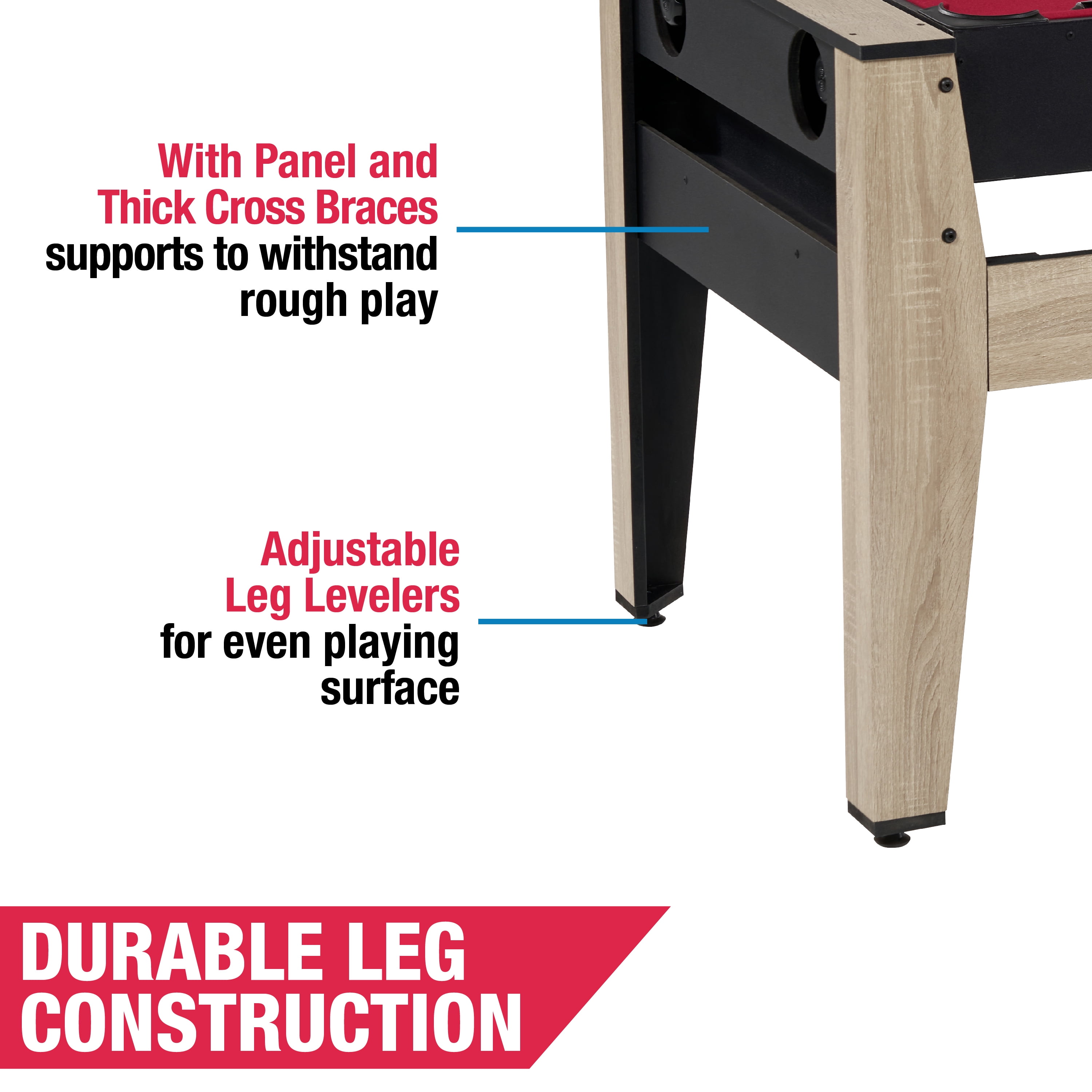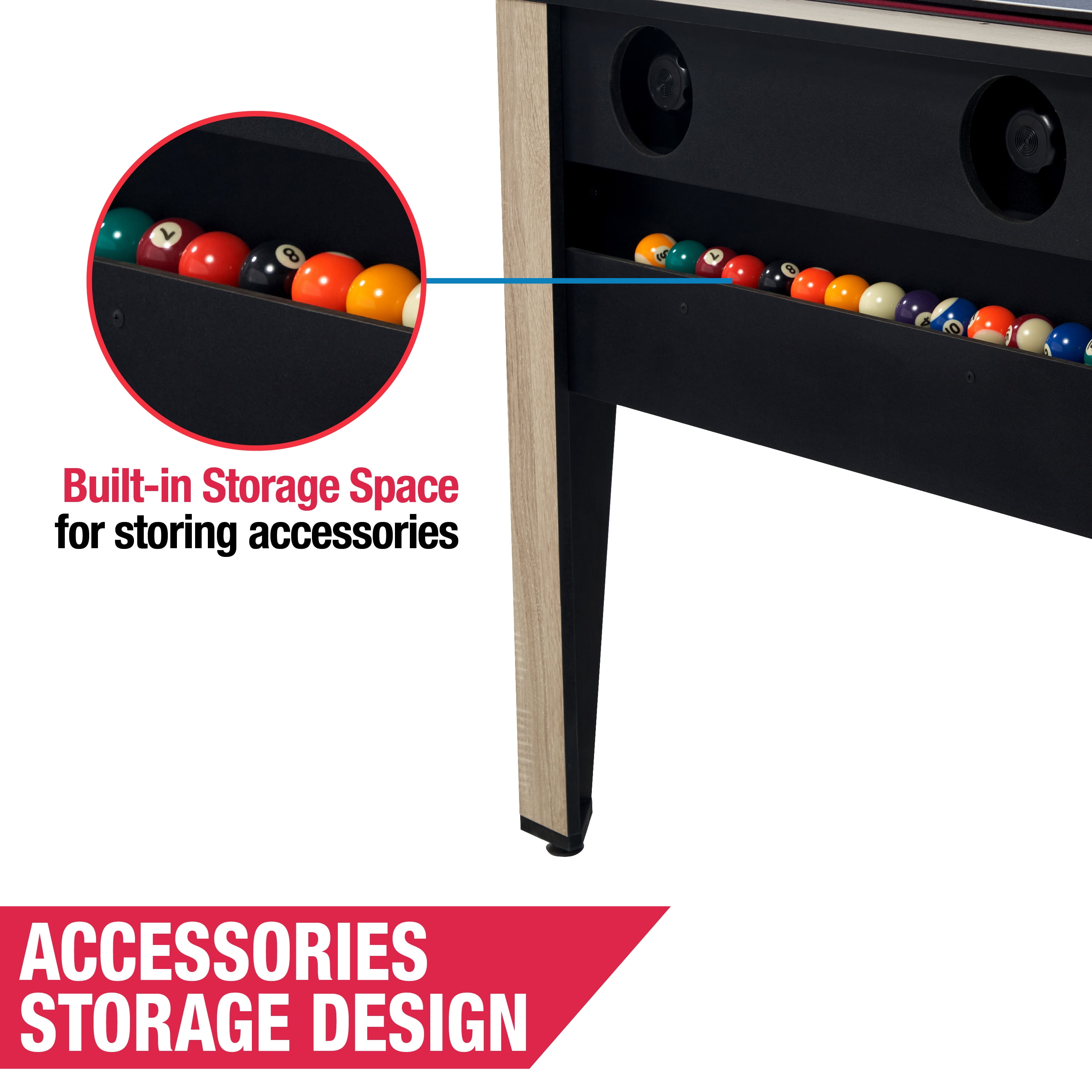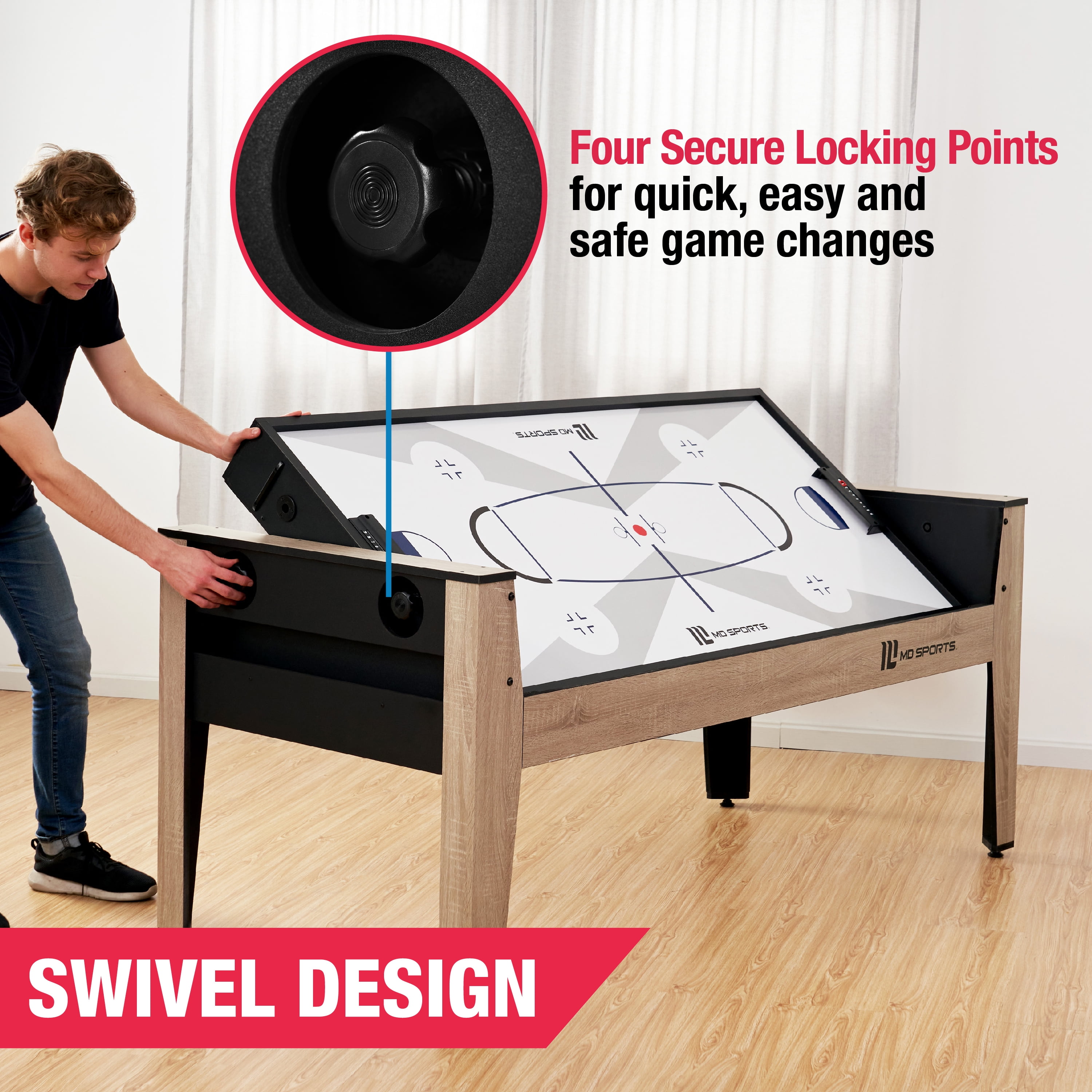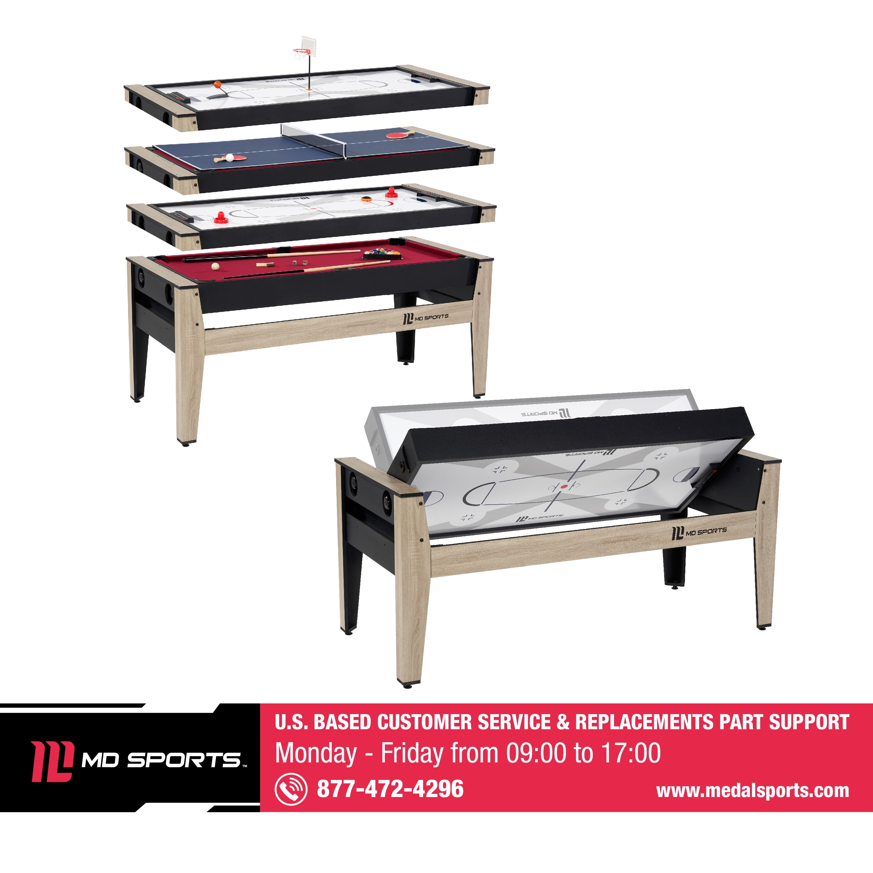 72″ 4-in-1 Swivel Combo Game Table, Pool, Hockey, Table Tennis, Basketball with Accessories Included, by MD Sports Features 4 different games: billiards, table tennis, hover hockey and finger shoot basketball The swivel design allows for quick and easy game changes with four secure locking points for safety Durable leg construction with the panel and thick cross braces supports to withstand rough play, adjustable leg levelers for even playing surface Built-in storage space for storing accessories Includes a rechargeable hover puck with USB charging cable for long lifetime Accessories included: 2 pushers, 1 hover puck with USB charging cable, 2 billiard cues, 1 set of billiard balls, 1 billiard triangle, 2 billiard chalks, 1 brush, 1 set post & net, 2 paddles, 2 table tennis balls, and 1 finger shoot basketball set
