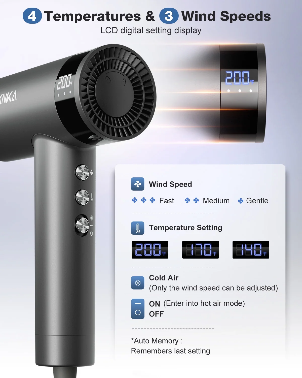 7MAGIC Hair Dryer for Women, LED Display High Speed HairDryer for Fast Drying, Travel Blow Dryer with 4 Temps & 3 Speed,Gray