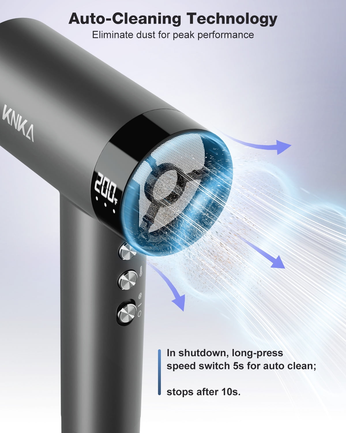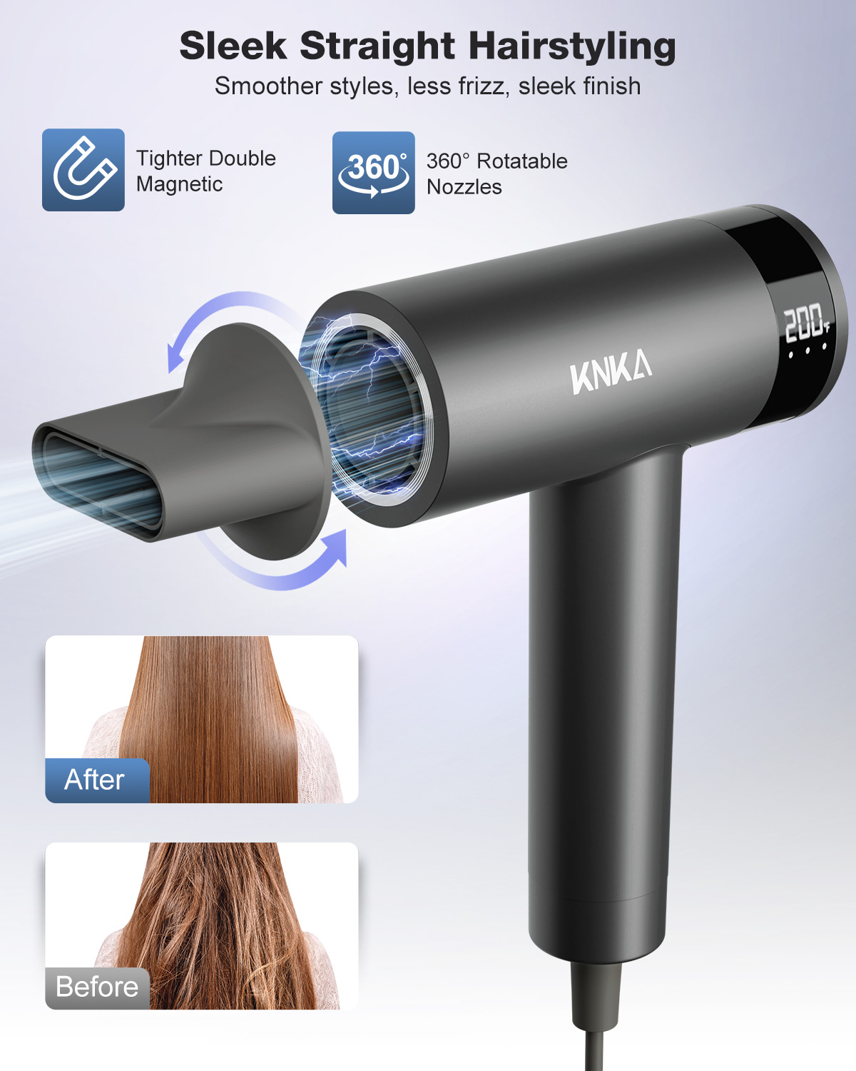 DRY YOUR HAIR EFFICIENTLY: With a powerful brushless motor, 7MAGIC high speed hair dryer provides 23m/s strong airflow which can give you a extra fast drying experience, saving your drying time in half even if you have a thick long hair. With its lightning-fast 110,000RPM motor speed, our professional-grade hairdryer guarantees the ultimate in hair drying efficiency. CUSTOMIZABLE TEMPERATURES & SPEEDS: Our portable hair dryer provide hot and cold air options with 4 temperature settings: high (200℉), medium (170℉), low (140℉), and cold air (75℉). Each mode also offers 3 wind speed options: gentle, medium, and fast. Choose the perfect mode to suit your hair and meet your drying or styling needs. REVOLUTIONARY HAIR DRYER: Our professional hair dryer features an LED display, you can effortlessly monitor the current temperature and speeds. Its 360° rotating magnetic smooth nozzle allows for seamless maneuverability, ensuring a salon-quality blowout every time. NO MORE FRIZZ: Our ionic hair dryer releases impressive 500 million of negative ions per cm³, effectively neutralizing static electricity and reducing hair frizz. This leaves your hair smoother, shinier, and more manageable. Negative ions also help maintain moisture balance by sealing the cuticles, keeping your hair hydrated and preventing dryness. Get a salon-quality experience at home!