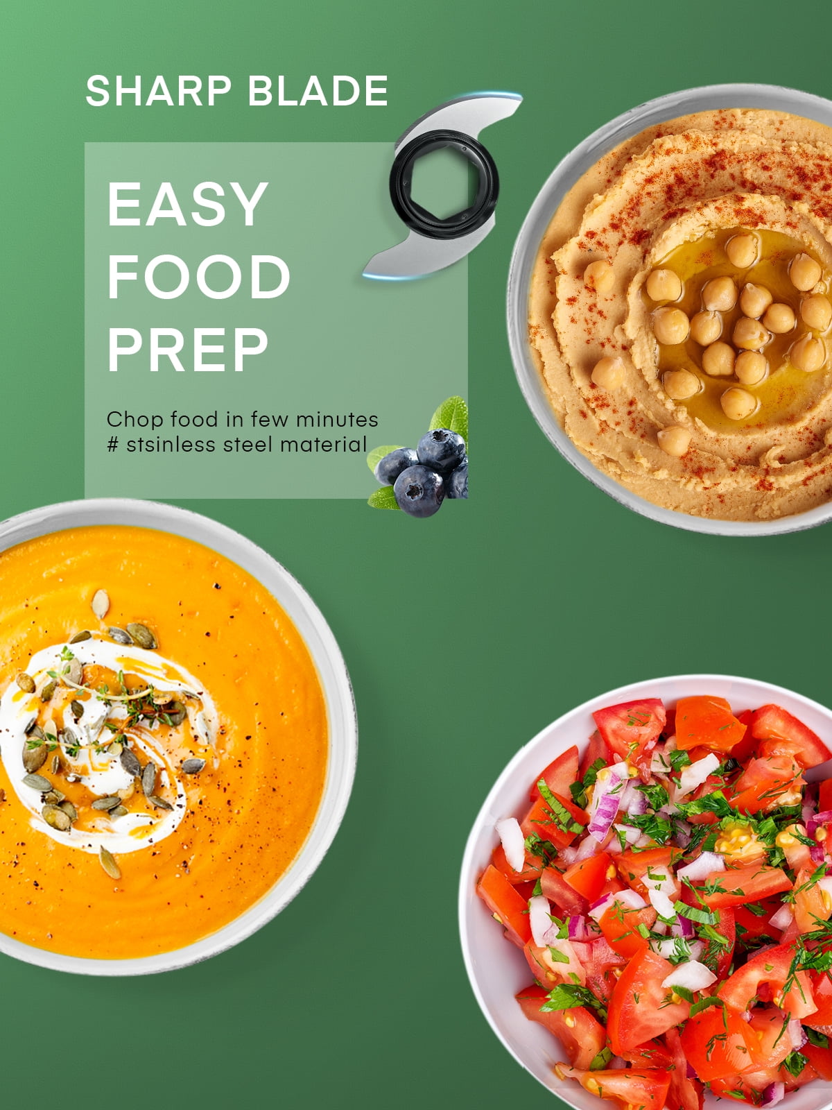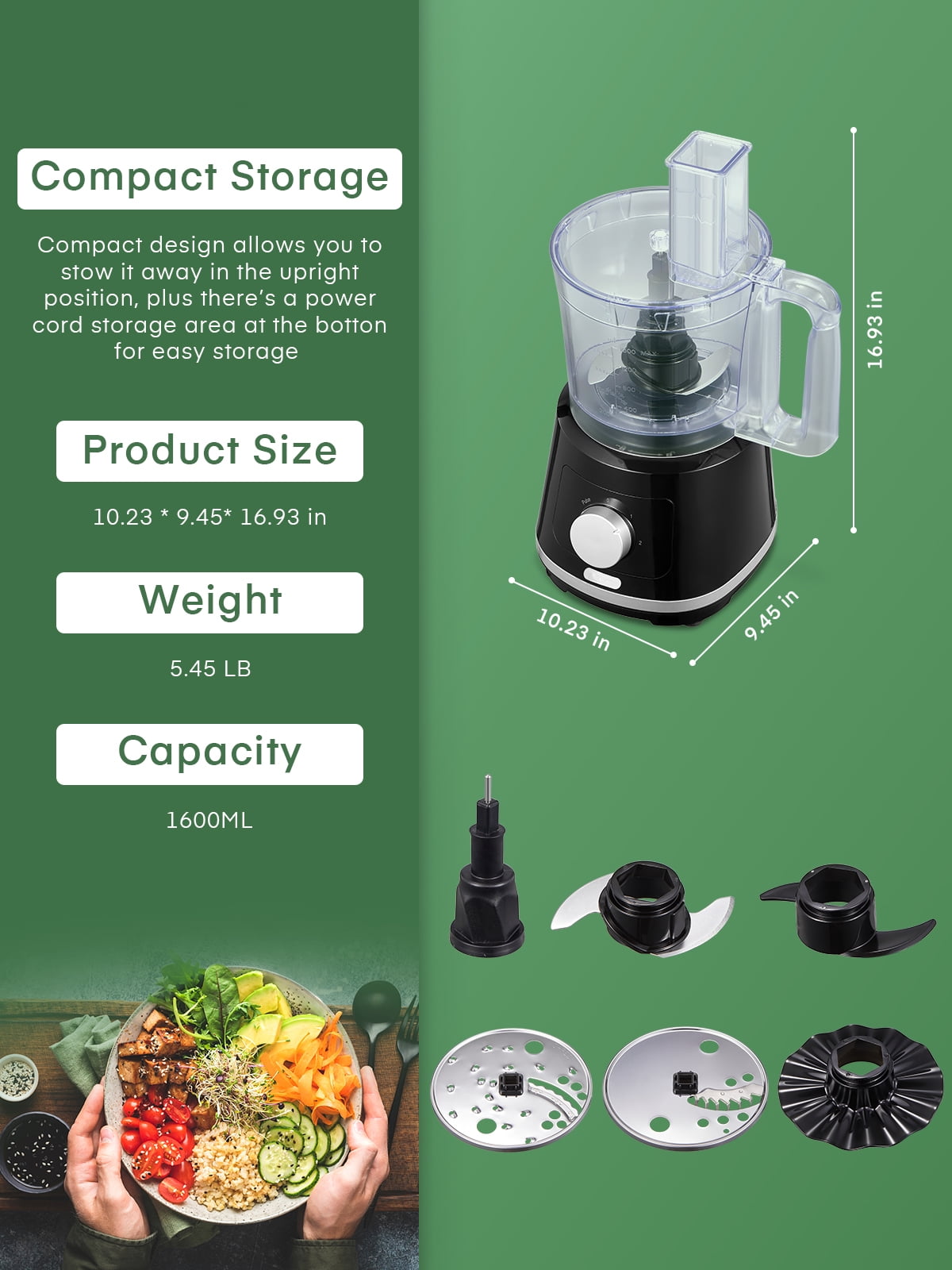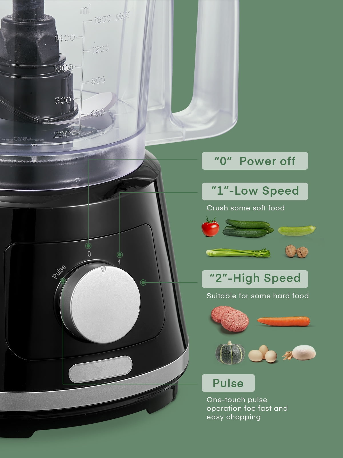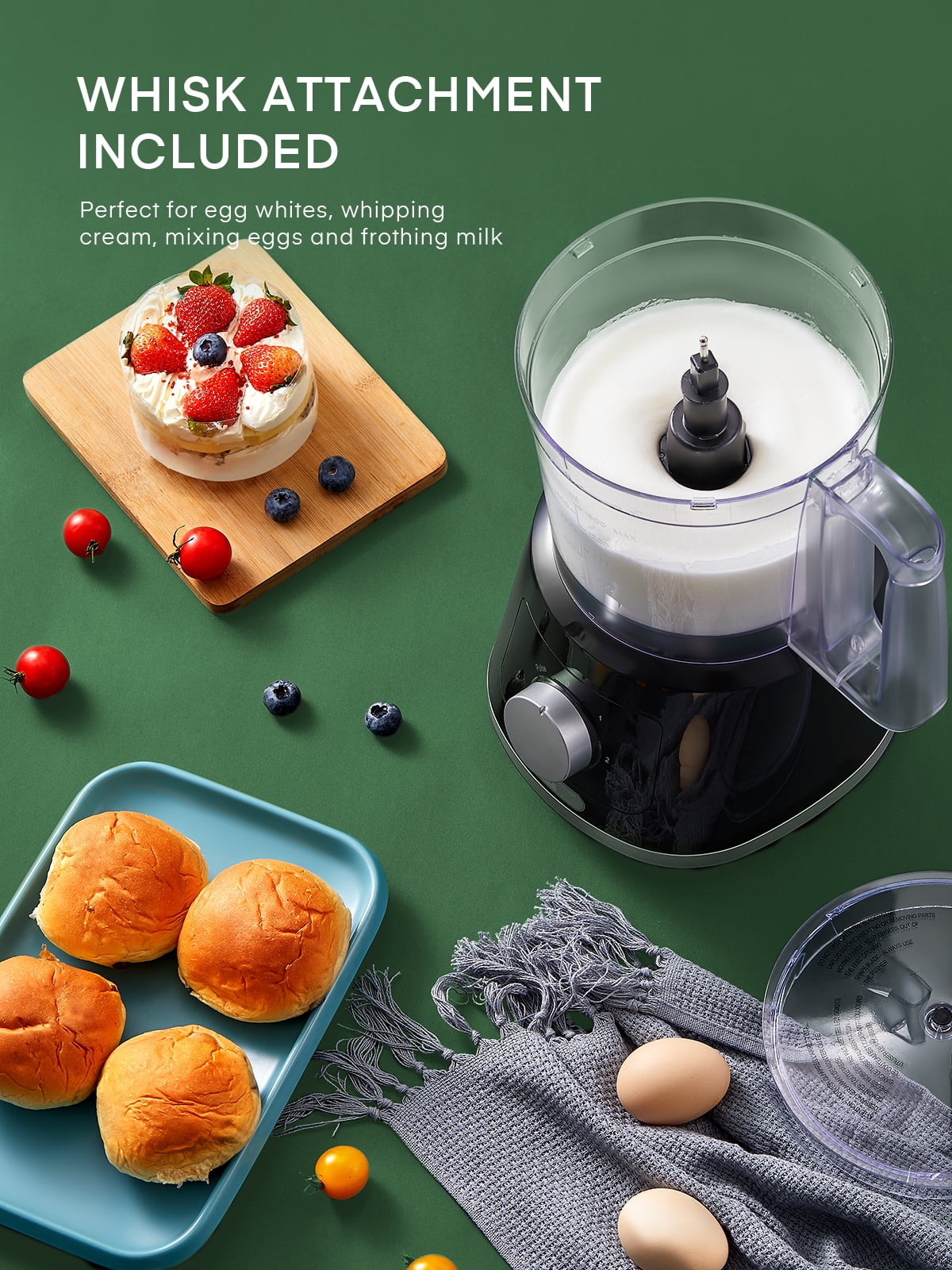 【All-in-one Food Processor】5 in 1 compact multifunction food processor with 5 accessories. Stainless steel S-blade for meat and some hard ingredients. Plastic S-blade for making pasta dough. Slicing & Shredder discs for cheese, cucumber carrots, and so on. The whisk attachment is perfect for egg whites, whipping cream, mixing eggs, and frothing milk. 【2 Speed + Pulse Controls】2 Speed for you to choose from, allowing you to precisely control fine grinding or rough grinding and complete the work in a few seconds. “1” low speed is suitable for soft foods such as dough and vegetables. “2” High speed is suitable for hard food, “P” is the pulse button to help you achieve more perfect results. 【Small Size, Large Capacity】The food chopper with a Large 1.6 L bowl BPA-free, can easily prepare enough food to meet the needs of the whole family. While freeing your hands, this food processor has all the functions you want, becoming the best helper in your kitchen. 【Double Safety Lock Design】The food mixer can only work if the three parts of the bowl and Motor base, bowl, and lid are firmly locked. Align the lid and bowl. Turn the lid and bowl clockwise to lock them into place. (Follow the sign on the lid and bowl, until both“ Triangle Marks” are aligned.) This is a very important point, in order to better ensure your safety. 【Easy to Use & Clean】The sturdy and wide base has 4 non-slip suction feet, which allows the food processor to prevent it from moving on the kitchen countertop. All attachments can be removed to clean easily, and BPA free. 24 Hours online customer service.