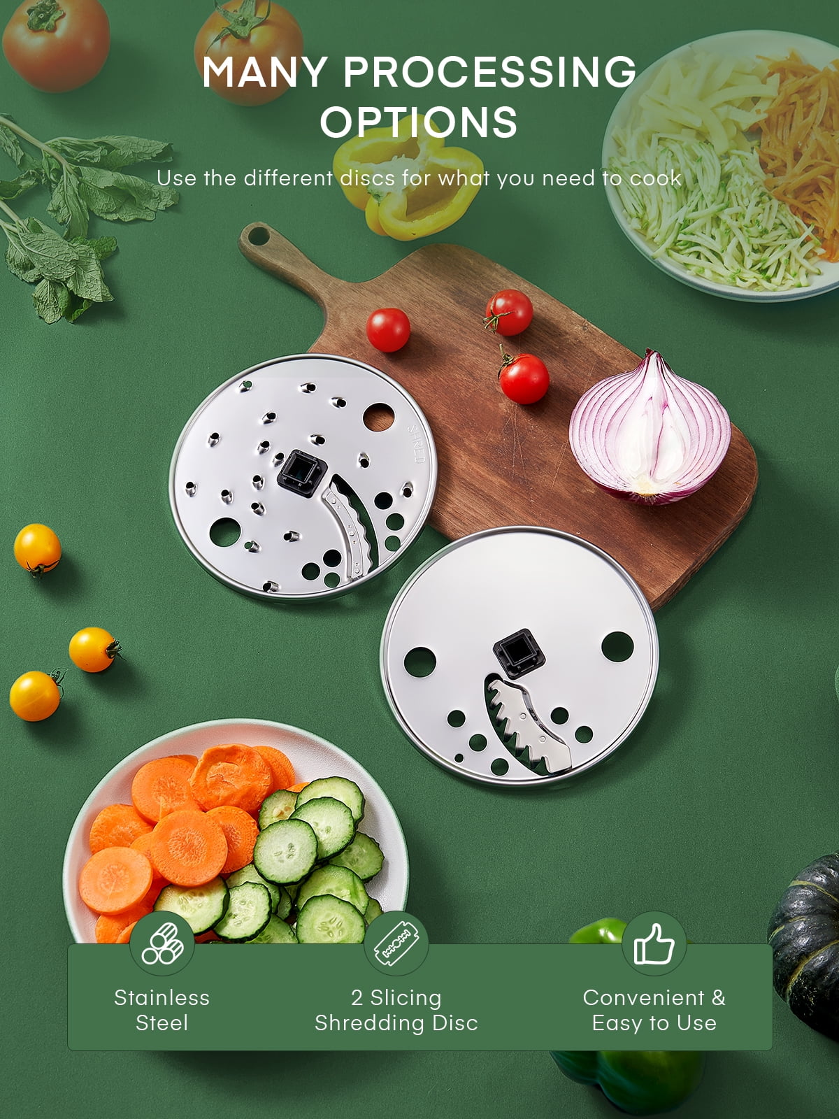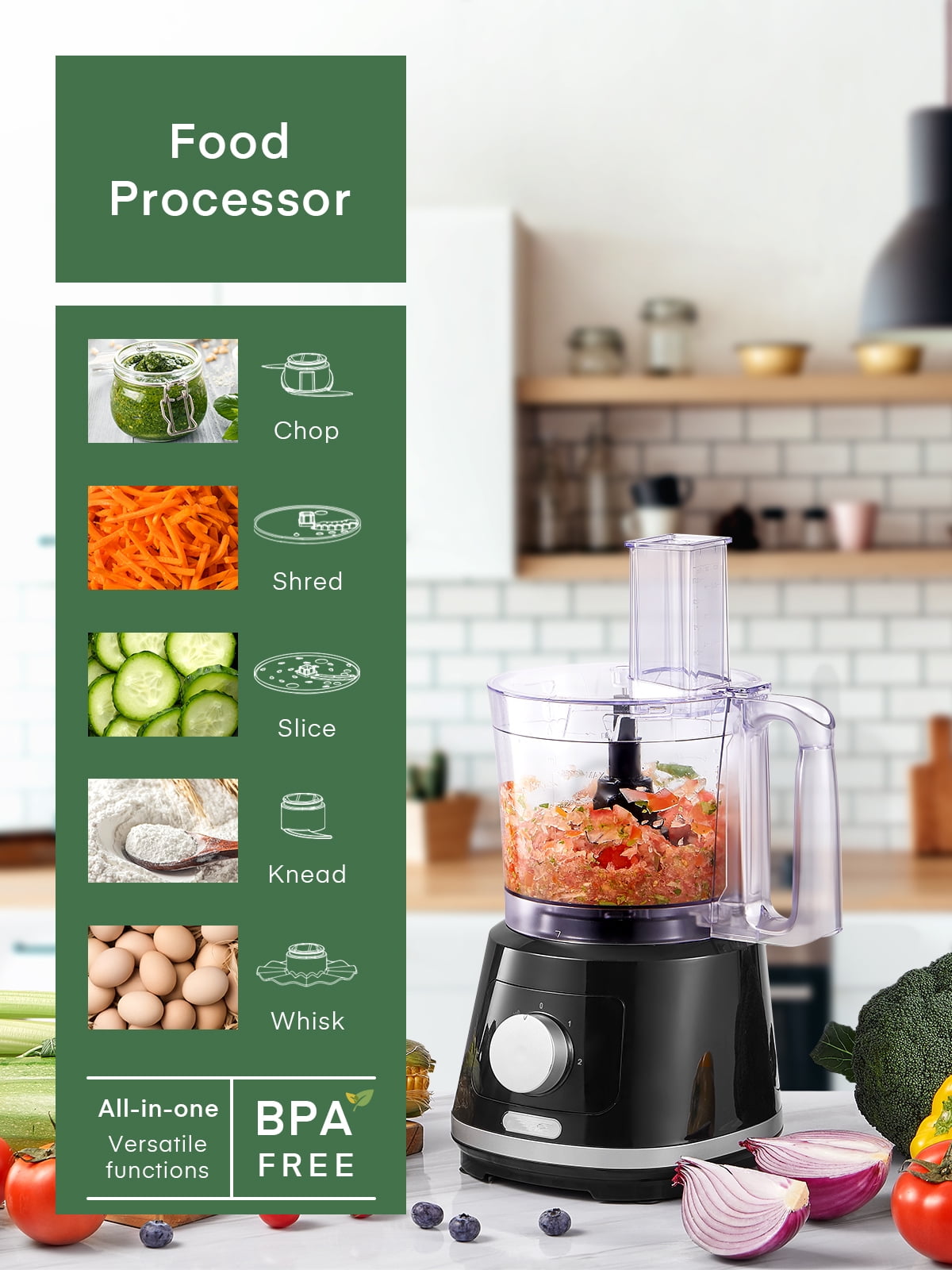 5-IN-1 MULTIFUNCTIONAL FOOD PROCESSOR Includes 5 attachments, food processor, means you get 8-CUP chopper, slicer, shredder, whisking, knead dough machine etc. It meets your most demands of cooking preparation, save time and money. 1000-Peak-Watts Professional-grade motor packs enough power to turn the toughest ingredients into velvety smooth purees. 8-Cup Capacity Expect consistent results whether you’re chopping a small batch (a few garlic cloves) or an entire bowlful of ingredients. Easy to Clean Simply pulse some warm water and a couple of small drops of dish soap to quickly clean the bowl and blades. All parts are BPA-free and dishwasher safe.