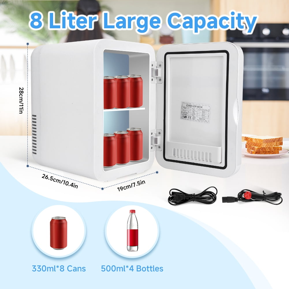 Fyydes 8L Mini Car Fridge for Home Refrigerator Cooler&Warmer, AC/DC, 1 Door,White Description: This 8L double-layer mini refrigerator can hold 8 cans of 330L can drinks at a time, and can also store cosmetics, can meet your daily needs. This dual-use refrigerator can remove the partition, according to the height of the food to remove the partition, the rational use of space, easily prevent 4 bottles of 550ML mineral water. This mini refrigerator does not take up space, built-in turbo fan, cooling cooling faster, food heating to facilitate your life, home travel, enjoy a strong life. Specification: Item Type: Car Refrigerator Material: PP+Aluminum+Glass Color: Silver Size: Approx. 28×26.5x19cm / 11.0×10.4×7.5in Weight: Approx.2692g/95oz Frequency: 50/60Hz Power: 40W Capacity: 8L Temperature Range: 2 degrees Celsius -65 degrees Celsius Package List: 1 x Refrigerator 1 x Power Line 1 x Cigarette Lighter Power Line 1 x Compartment 1 x Side Door Bracket 1 x Instruction Manual Note: 1. Please allow 1-2cm error due to manual measurement. Thanks for your understanding. 2. Monitors are not calibrated same, item color displayed in photos may be showing slightly different from the real object. Please take the real one as standard.