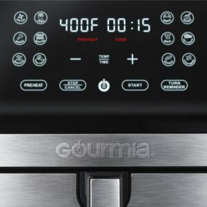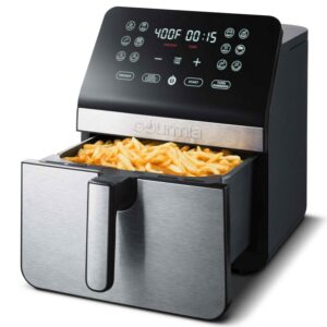 8-quart stainless steel digital air fryer is designed to enhance your health, your kitchen, and your schedule. Your health: FryForce 360″° Technology slashes fat by up to 80%; Your kitchen: This stainless steel model is pleasing to the eye and complements any kitchen; Your schedule: It’s faster, easier, and takes a lot less effort to prepare food with this air fryer than it does with a traditional oven. The air fryer will keep track of your cooking and do all the necessary reminding for you. Simply press Preheat or Turn Reminder and Guided Cooking will prompt you to Add Food when the unit is preheated and to Turn Food halfway through cooking. And when the party’s over, finish with an easy clean-up of the nonstick, dishwasher safe basket and crisper tray, and you’re all ready for your next great adventure. BPA Free. Model # GAF846
